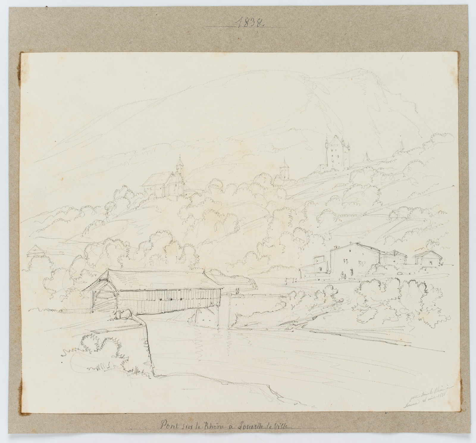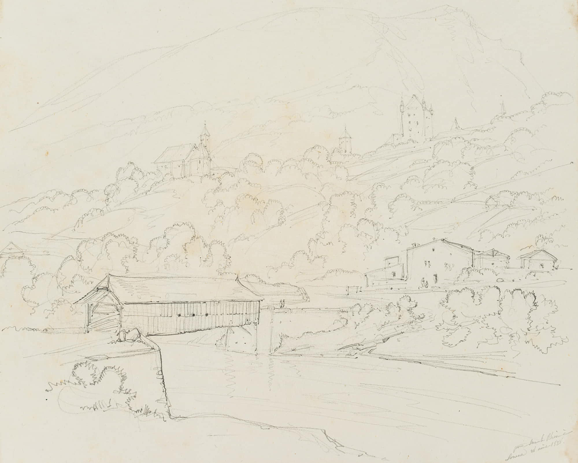 Edmond de Bretenières (1804 Dijon – 1882 ebd.), Brücke über die Rhone in Leuk im Kanton Wallis, Loéche, Leigg, Blick auf Kirche und Bischofsschloss, Reise in die Schweiz, Skizzenbuch, 1838, Bleistift