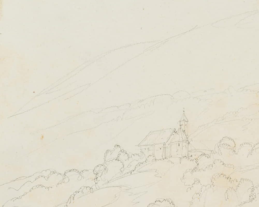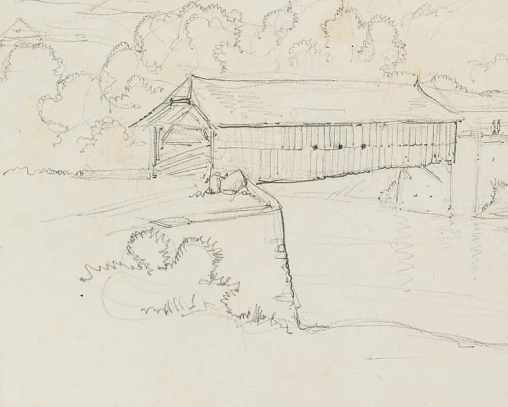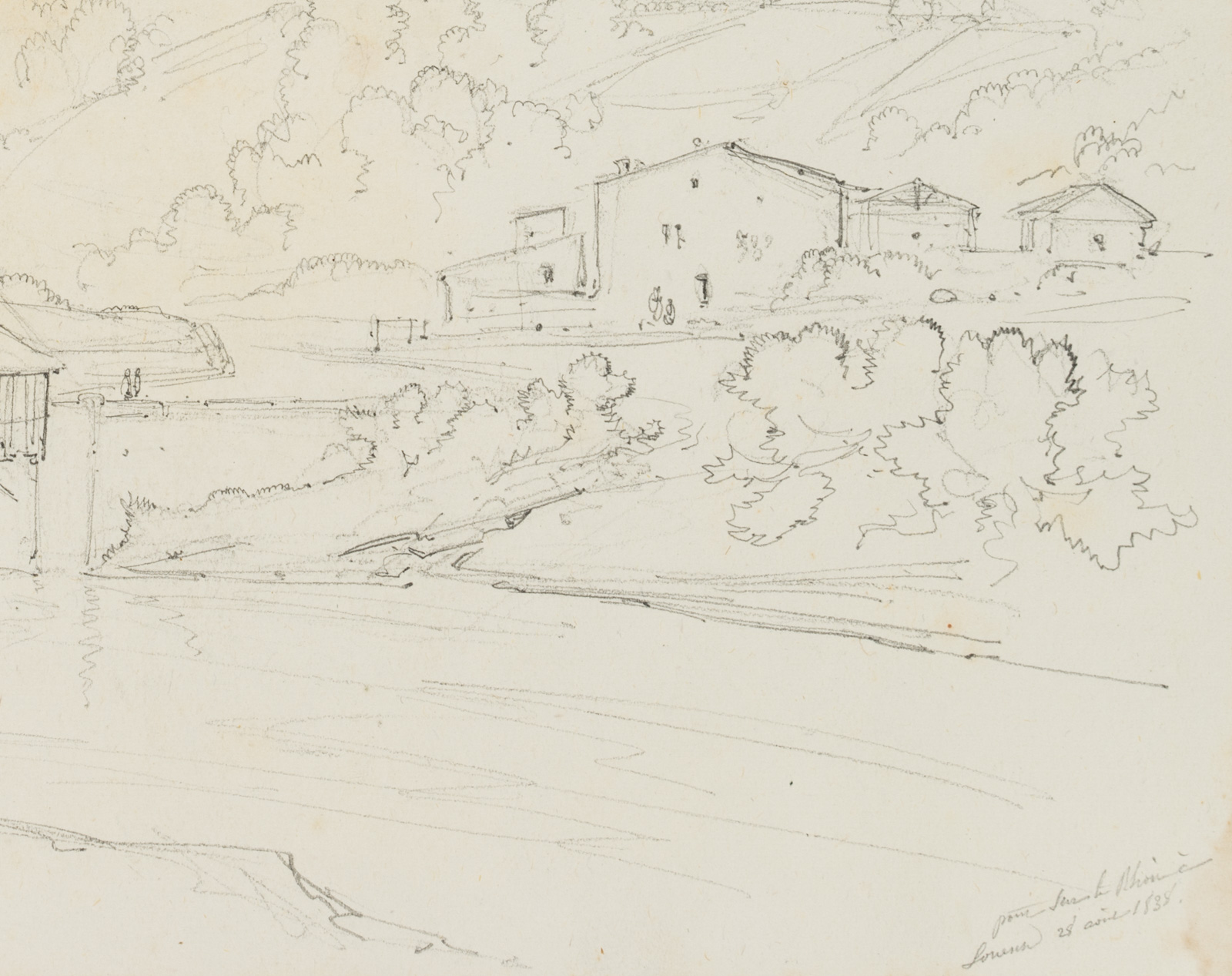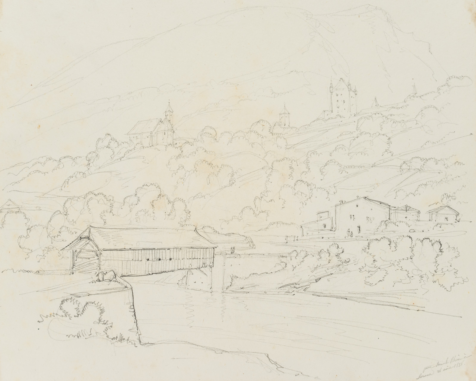 Edmond de Bretenières (1804 Dijon – 1882 ibid.), Bridge over the Rhone in Leuk in the Canton of Valais, Loéche, Leigg, View of the Church and Bishop’s Castle, Journey to Switzerland, Sketchbook, 1838, Pencil