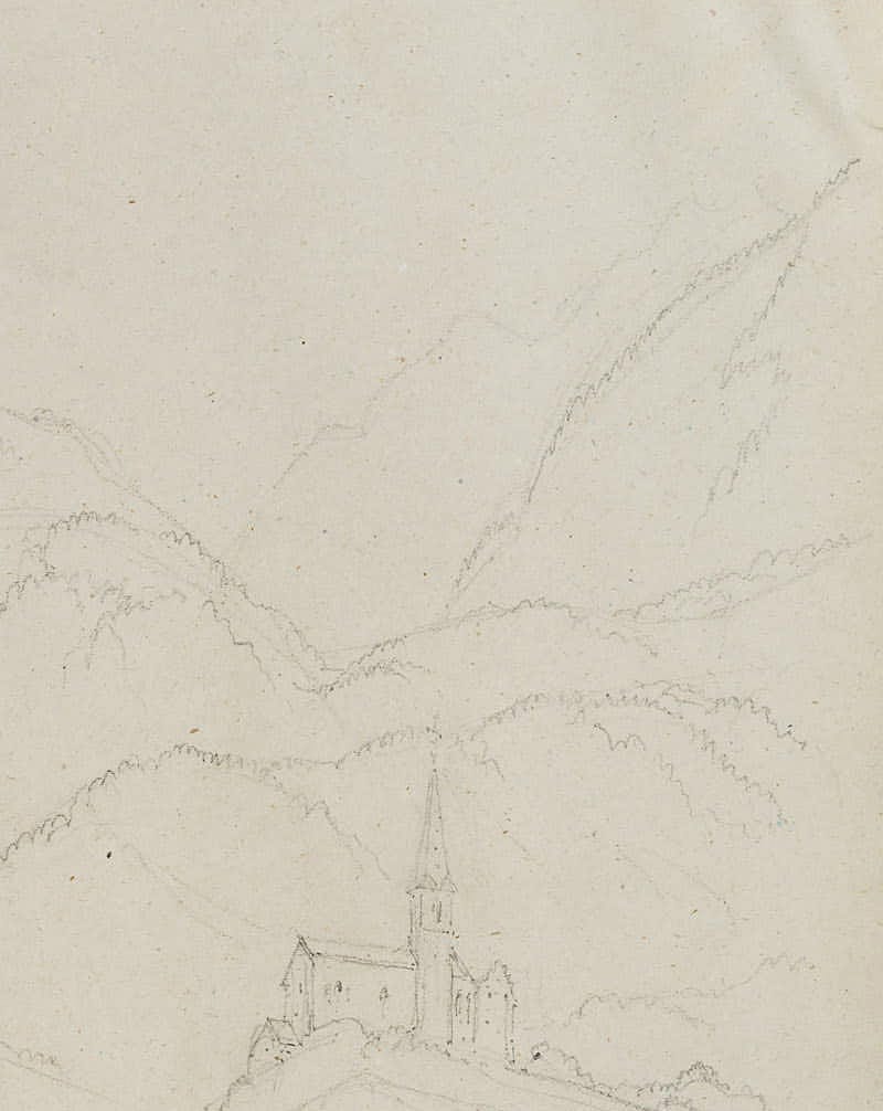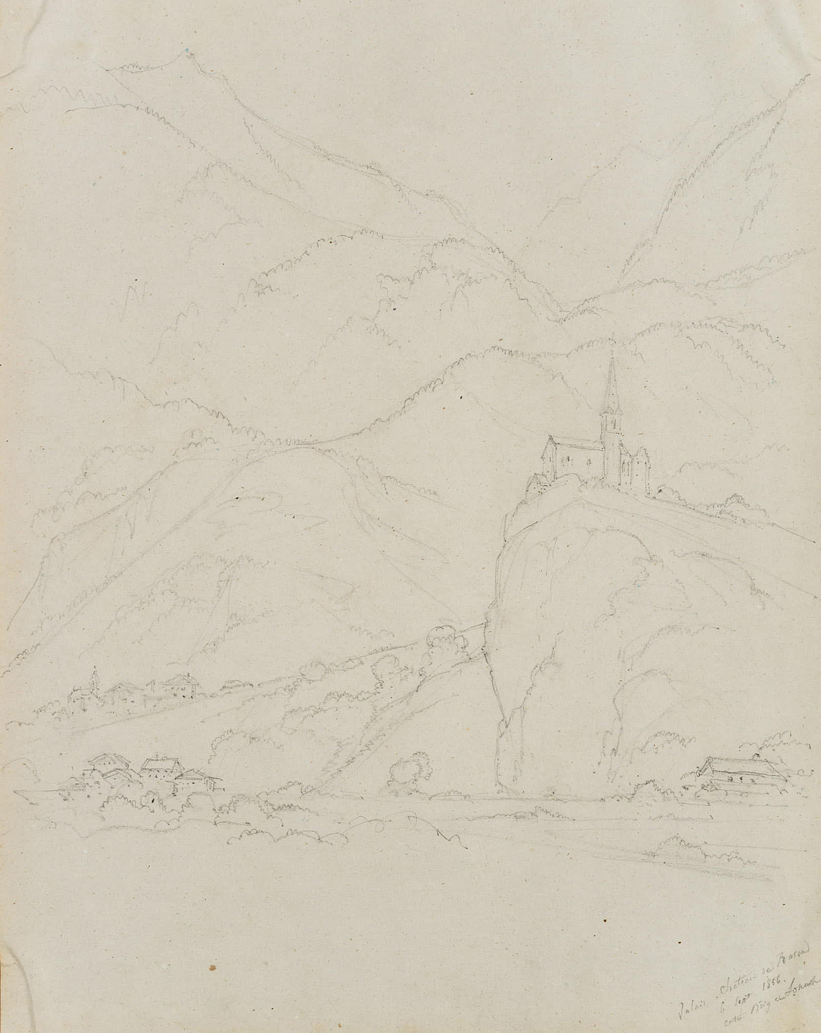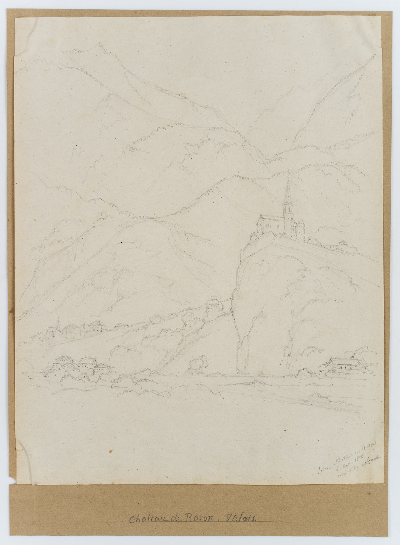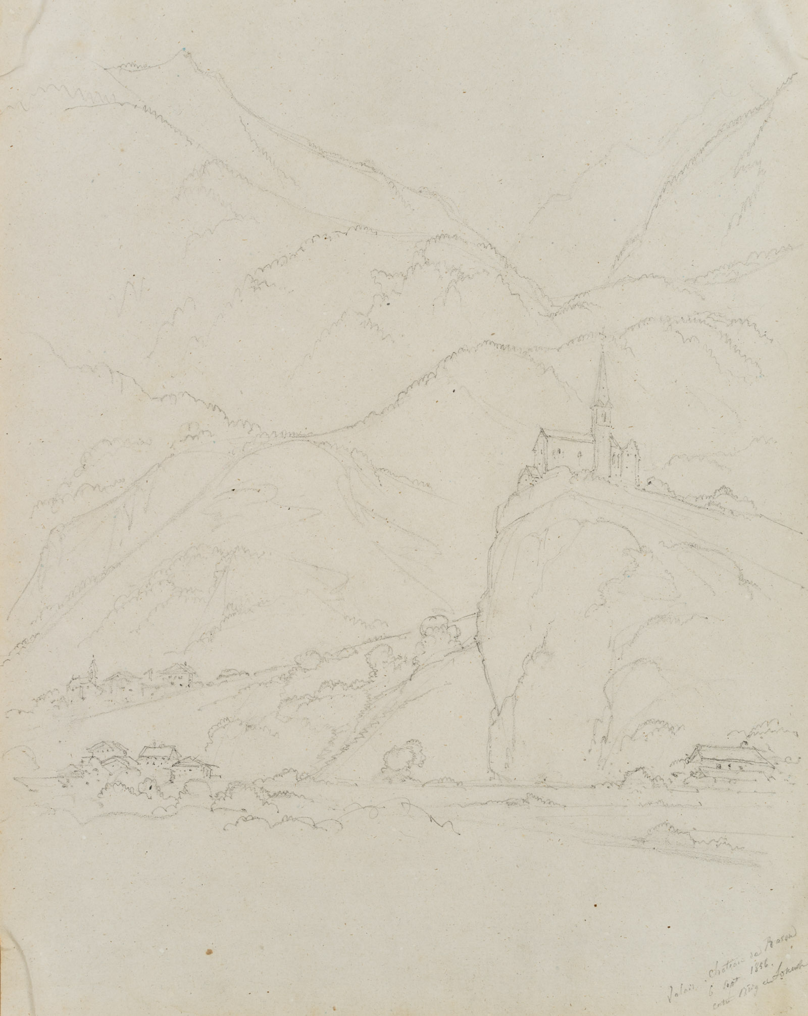 Edmond de Bretenières (1804 Dijon – 1882 ibid.), Château de Raron in the Canton of Valais, castle and church on a rocky spur under the Lötschberg Ramp, Journey to Switzerland, Sketchbook, 1856, Pencil
