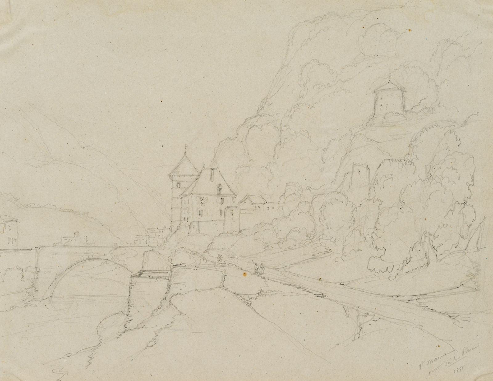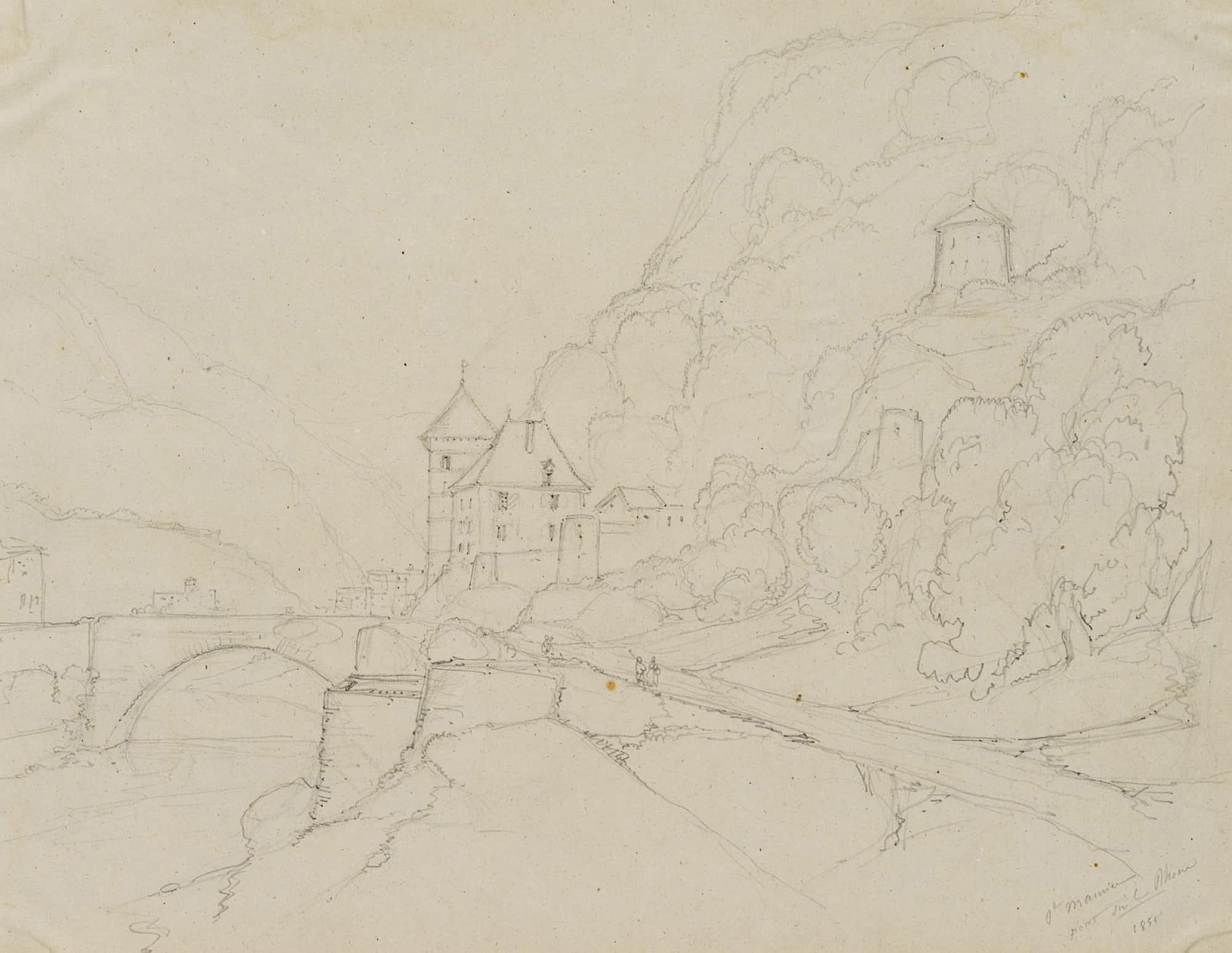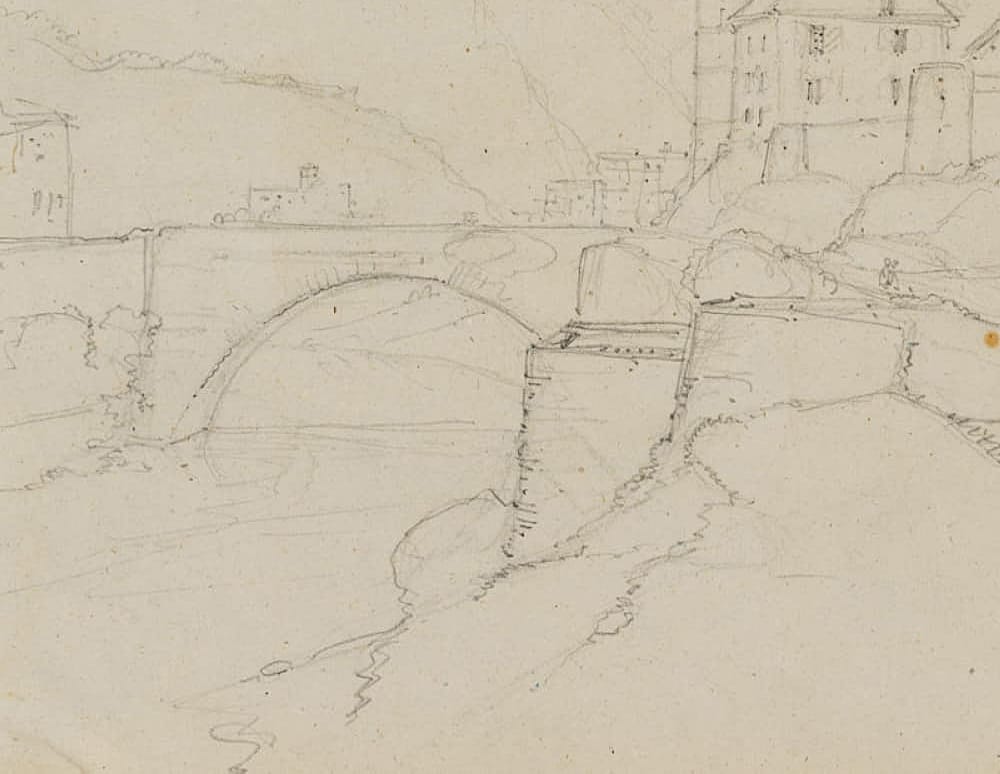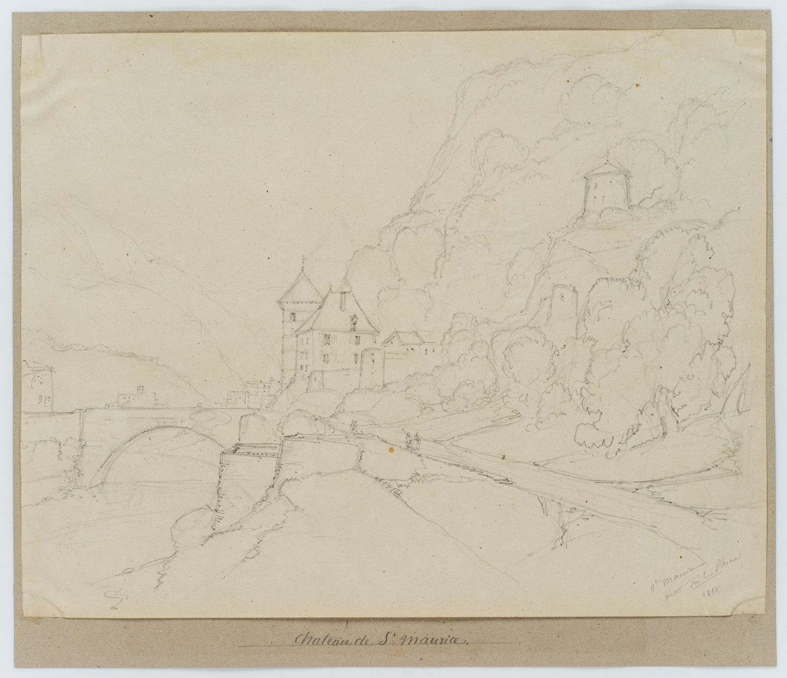 Edmond de Bretenières (1804 Dijon – 1882 ebd.), Straße und bewaldeter Hang bei Château Saint-Maurice mit Rhone-Brücke im Kanton Wallis, Reise in die Schweiz, Skizzenbuch, 1855, Bleistift
