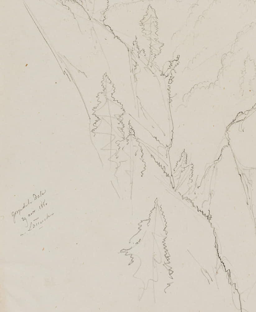 From a scrapbook with travel sketches by the artist. “Esquisses faites par le Baron Edmond de Bretenières feudant les voyages en Suisse” (Sketches made by Baron Edmond de Bretenieres during his travels in Switzerland).