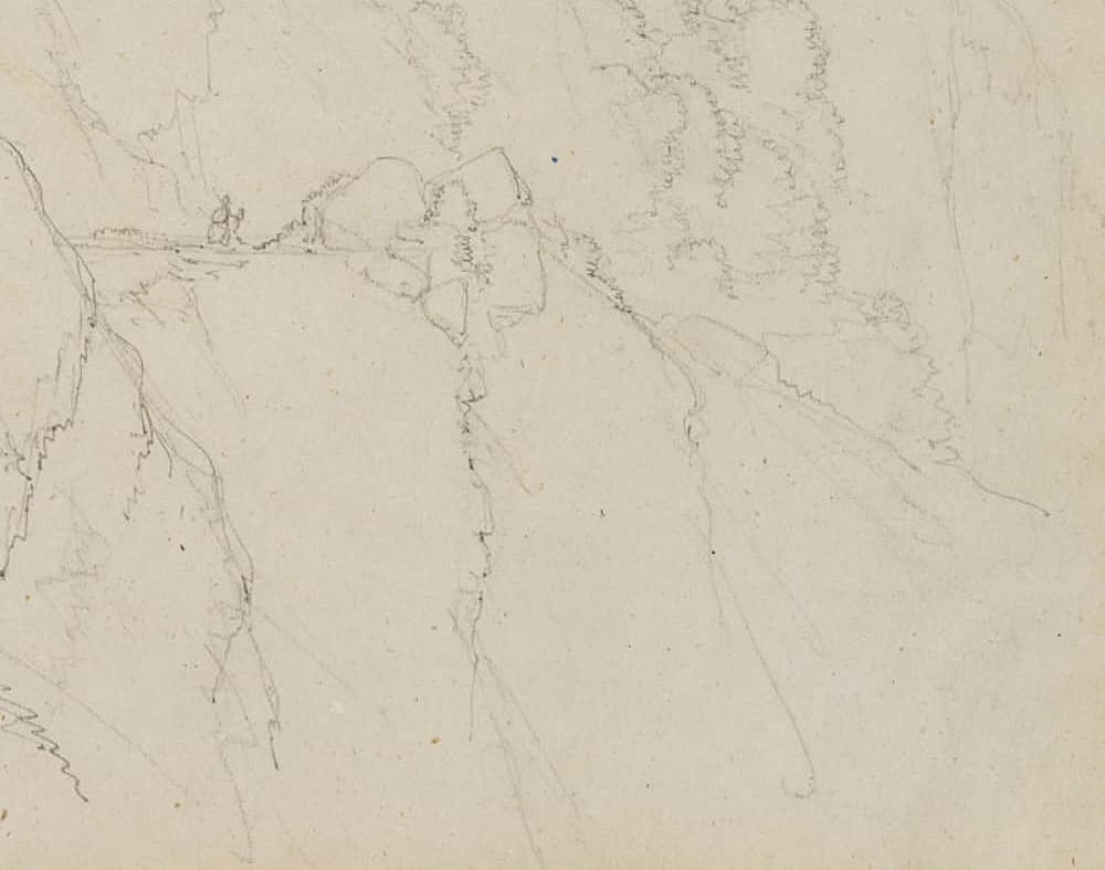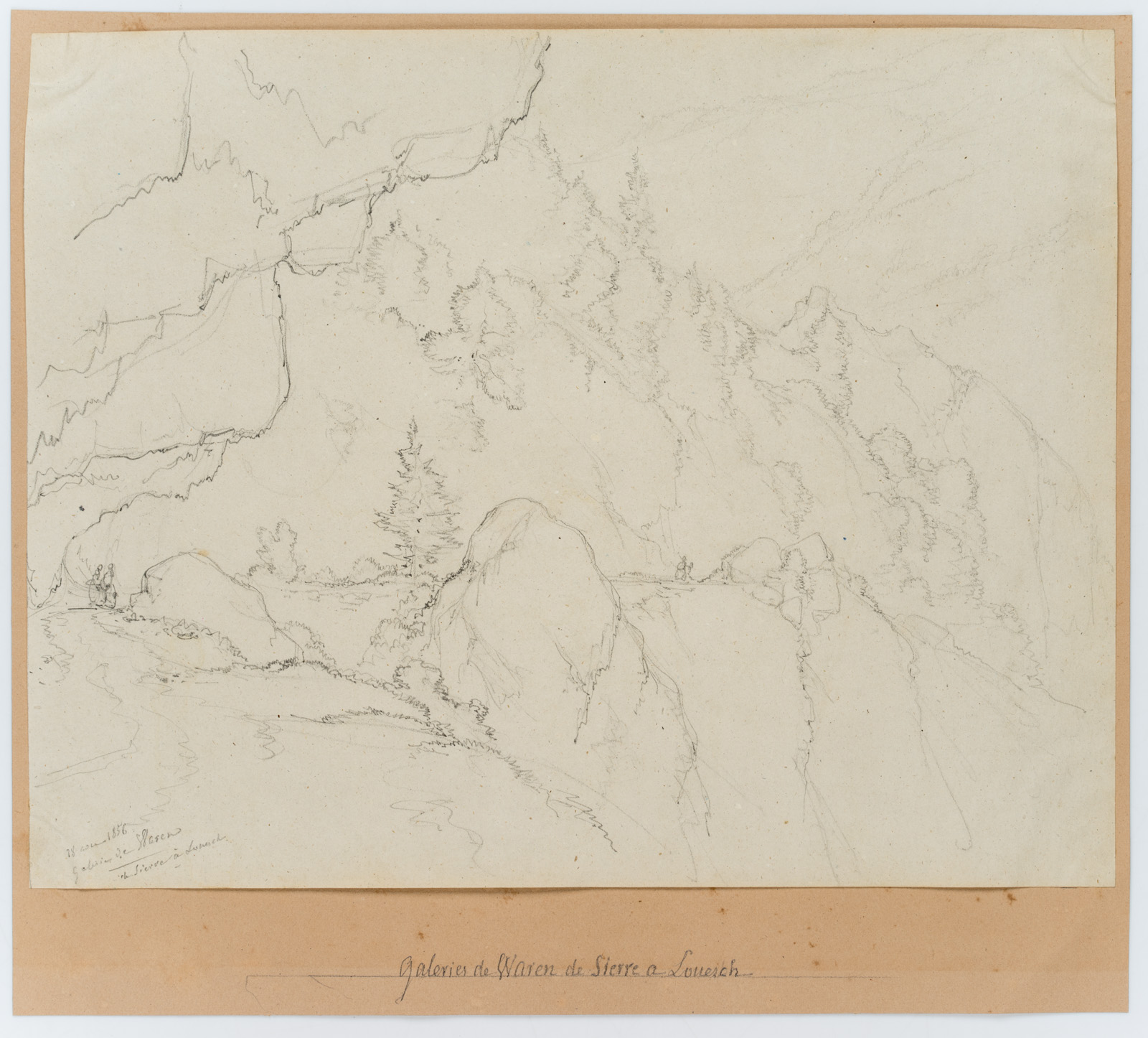Edmond de Bretenières (1804 Dijon – 1882 ibid.), Mountain path on a steep slope near Leuk in the canton of Valais, Loéche, Leigg, “Galeries de Waren de Sierre a Louesch”, Journey to Switzerland, Sketchbook, 1856, Pencil