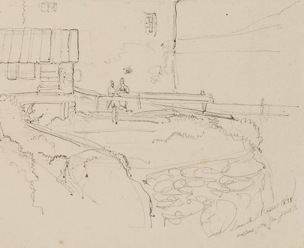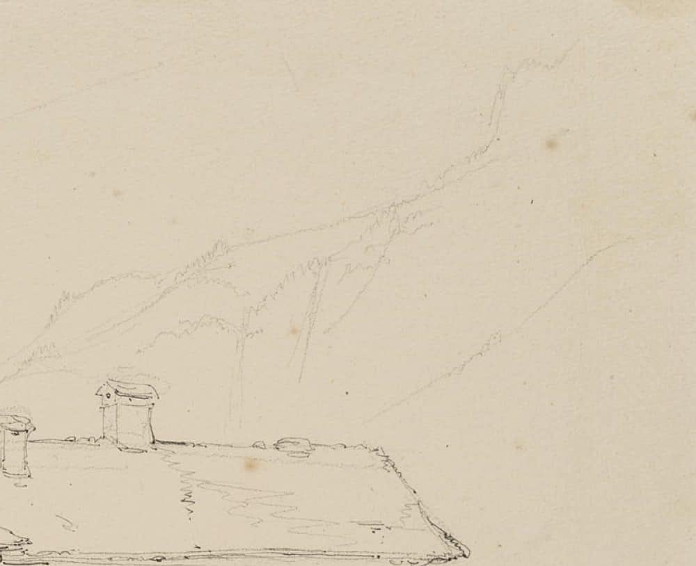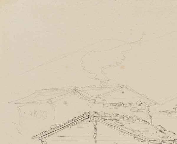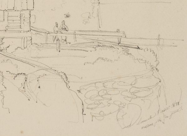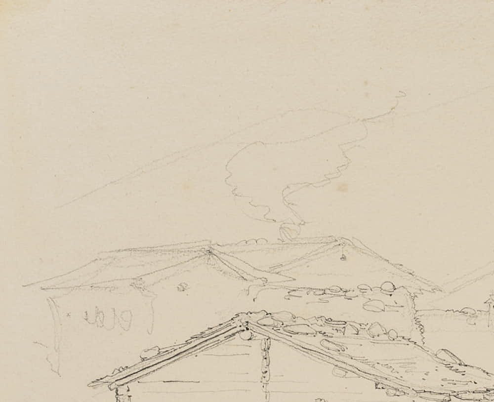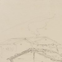 Edmond de Bretenières (1804 Dijon – 1882 ibid.), House by the bridge in Leukerbad in the canton of Valais, “Louesch” “maison près la pont”, journey to Switzerland, sketchbook, 1838, Pencil