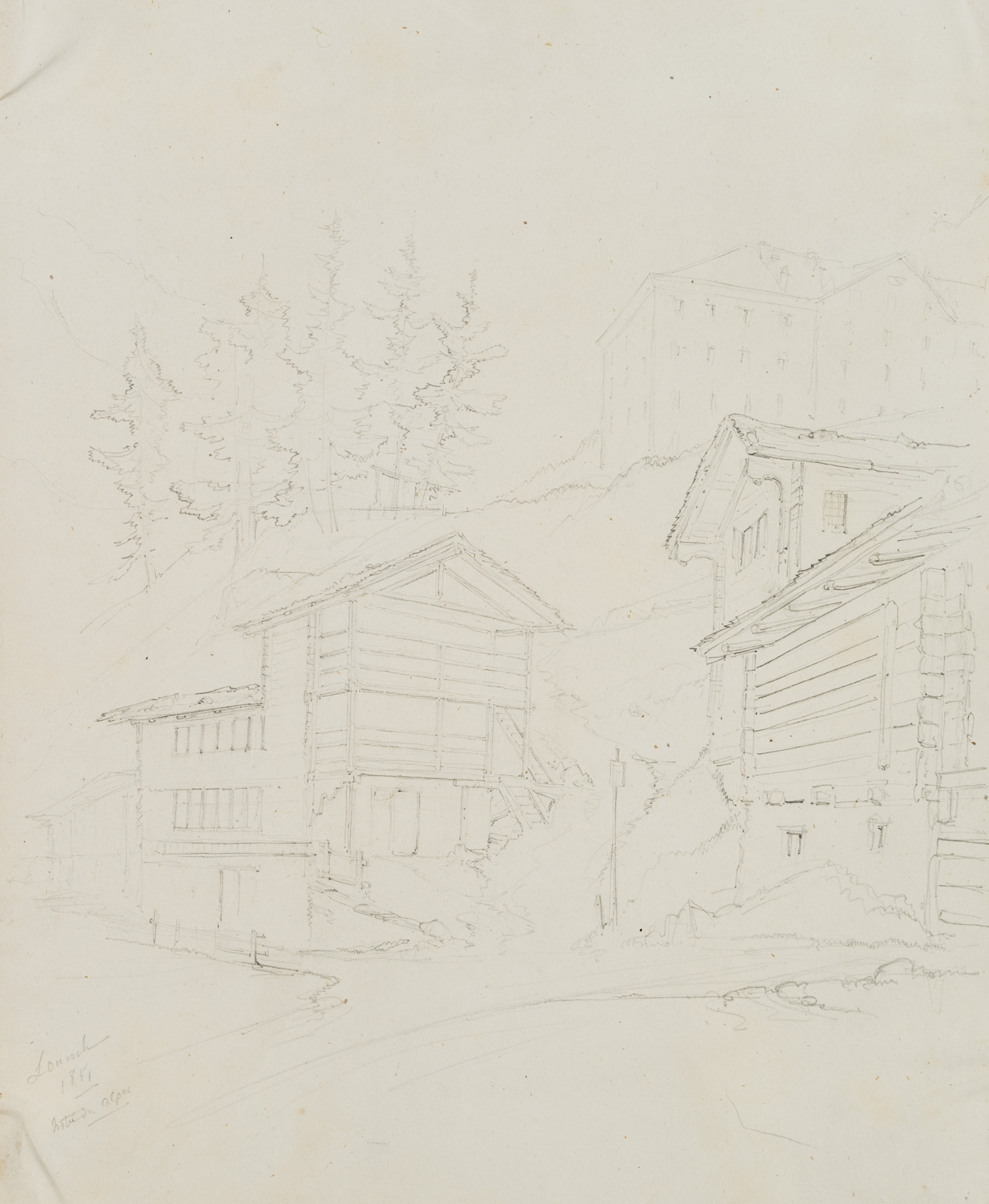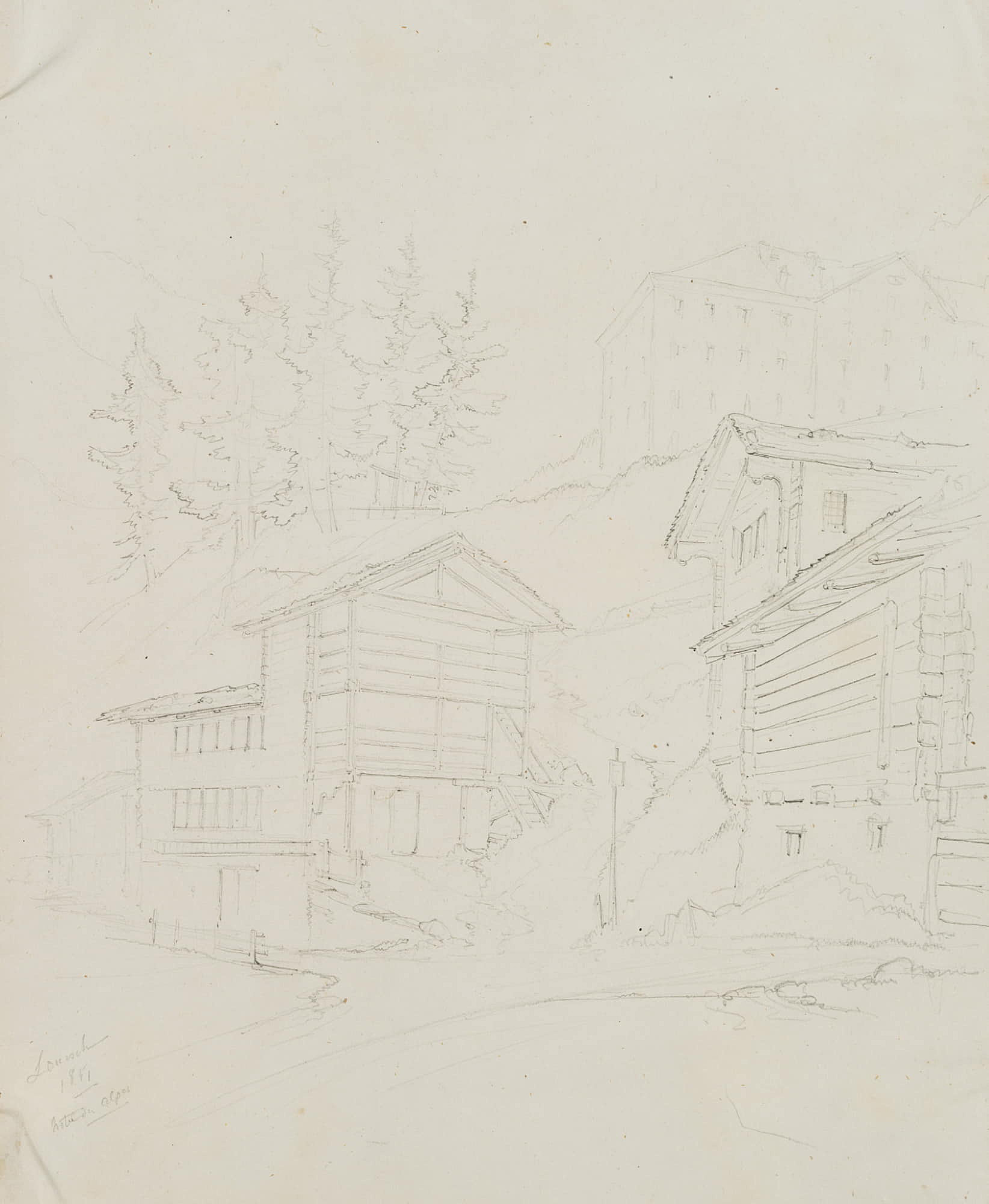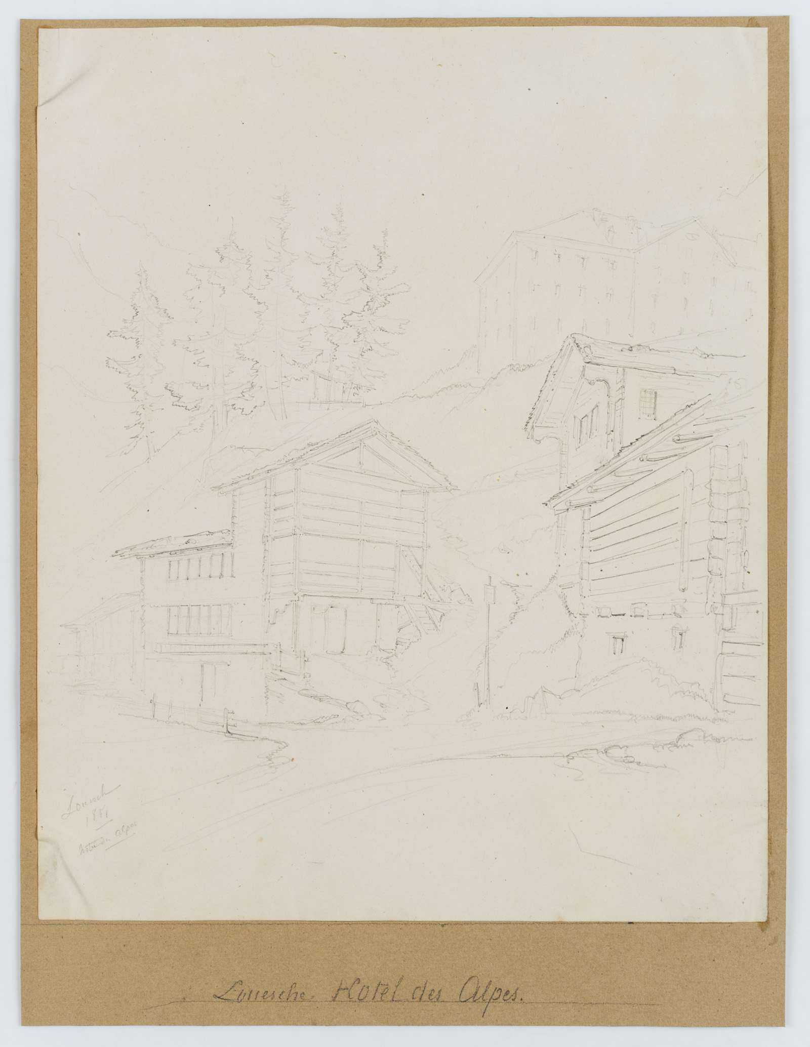Edmond de Bretenières (1804 Dijon – 1882 ebd.), Gasthof “Hôtel des Alpes” in Leuk im Kanton Wallis, Loéche, Leigg, “Louesch”, Reise in die Schweiz, Skizzenbuch, 1851, Bleistift