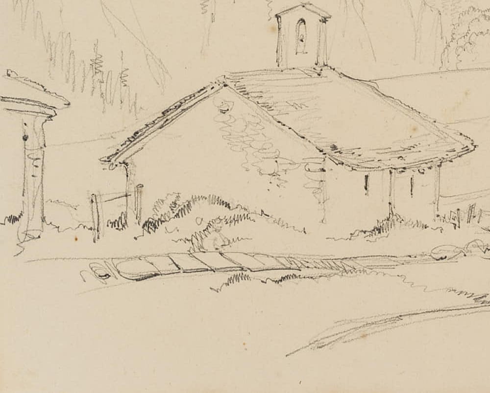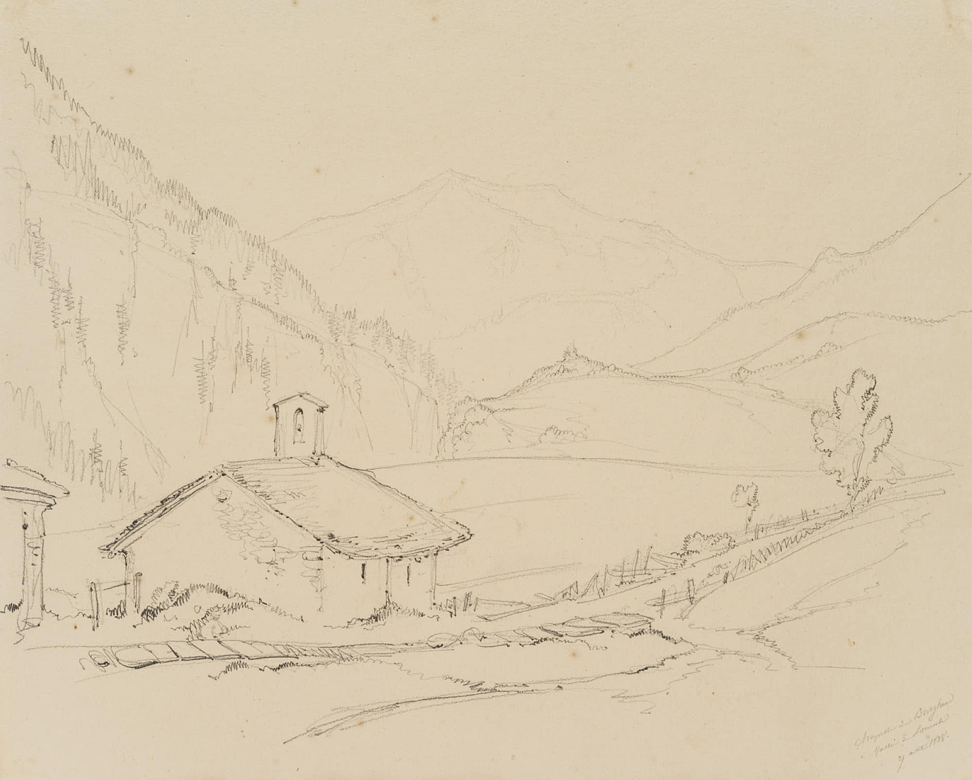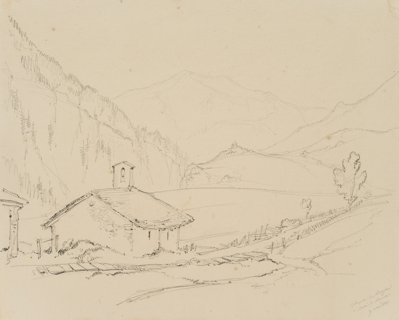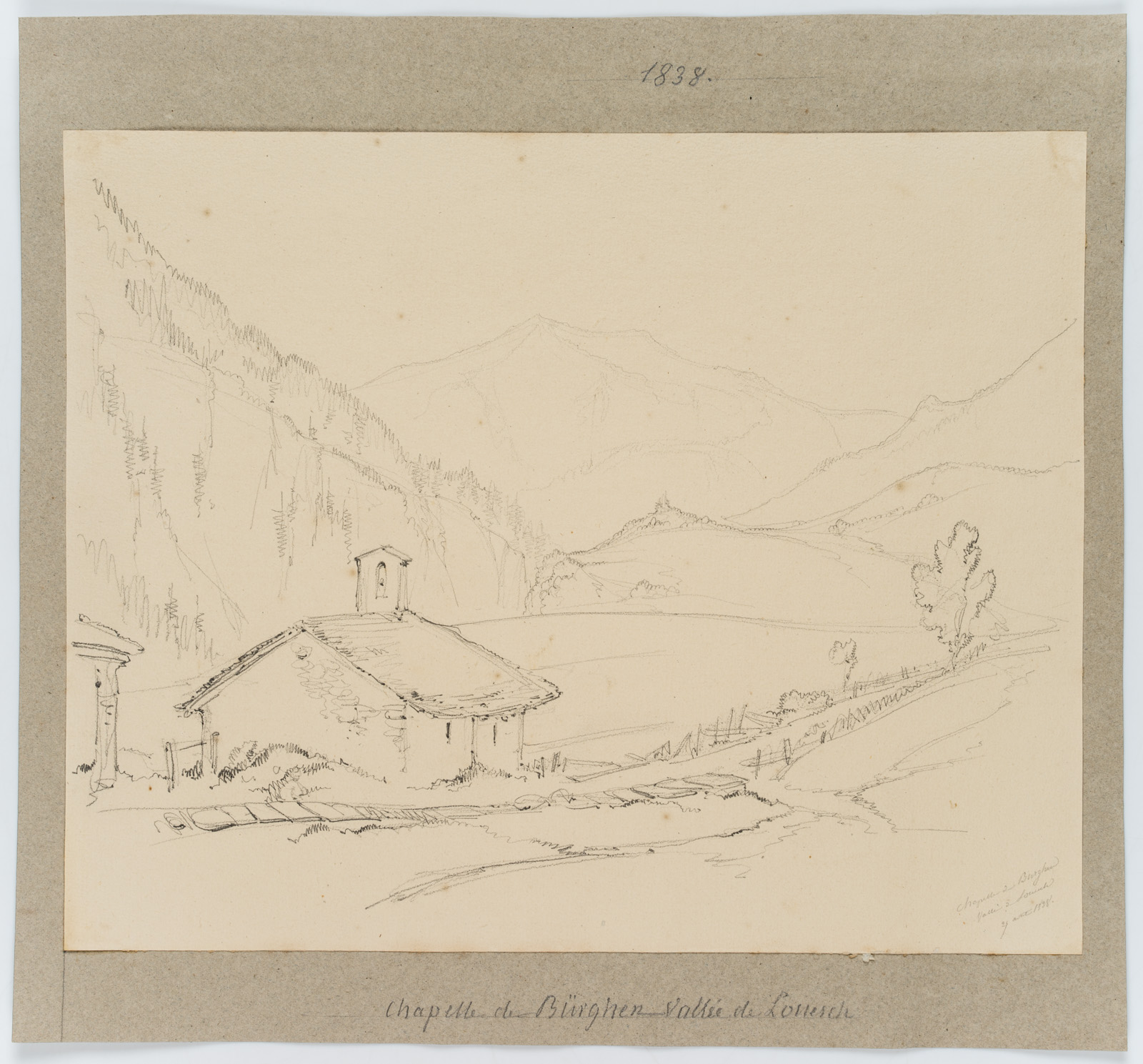 Edmond de Bretenières (1804 Dijon – 1882 ibid.), Chapel in the village of Bürghen or Bürchen near Leuk in the canton of Valais, Loéche, Leigg, “Chapelle de Bürghen Vallée de Louesch”, Journey to Switzerland, Sketchbook, 1838, Pencil