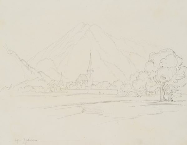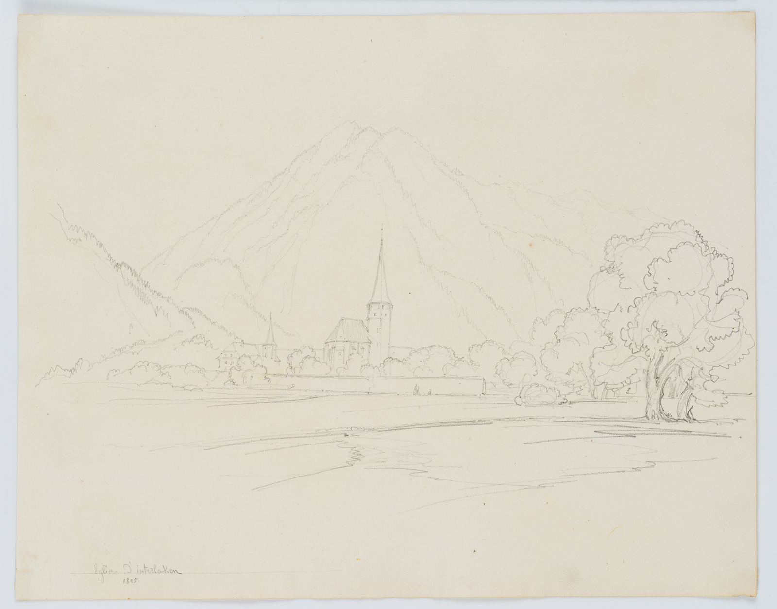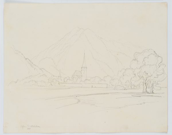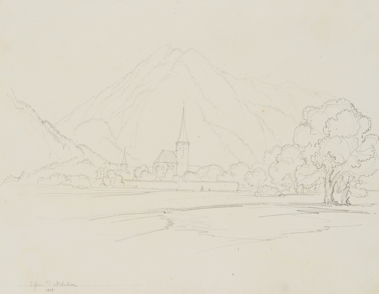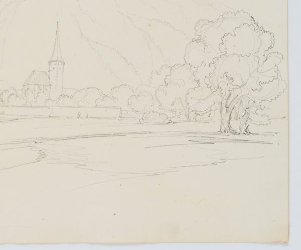 Edmond de Bretenières (1804 Dijon – 1882 ebd.), Blick auf die Kirche in Interlaken, Schweiz, Bleistiftzeichnung auf Papier, 1825, Bleistift