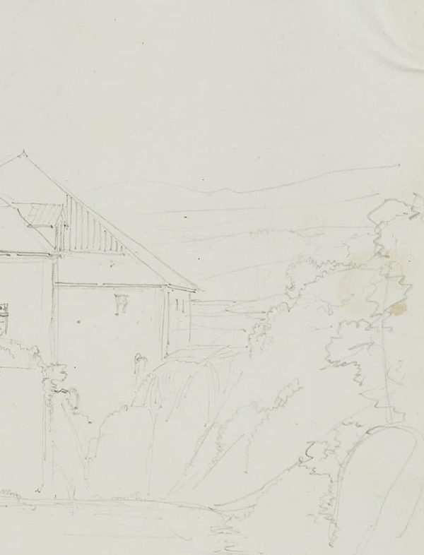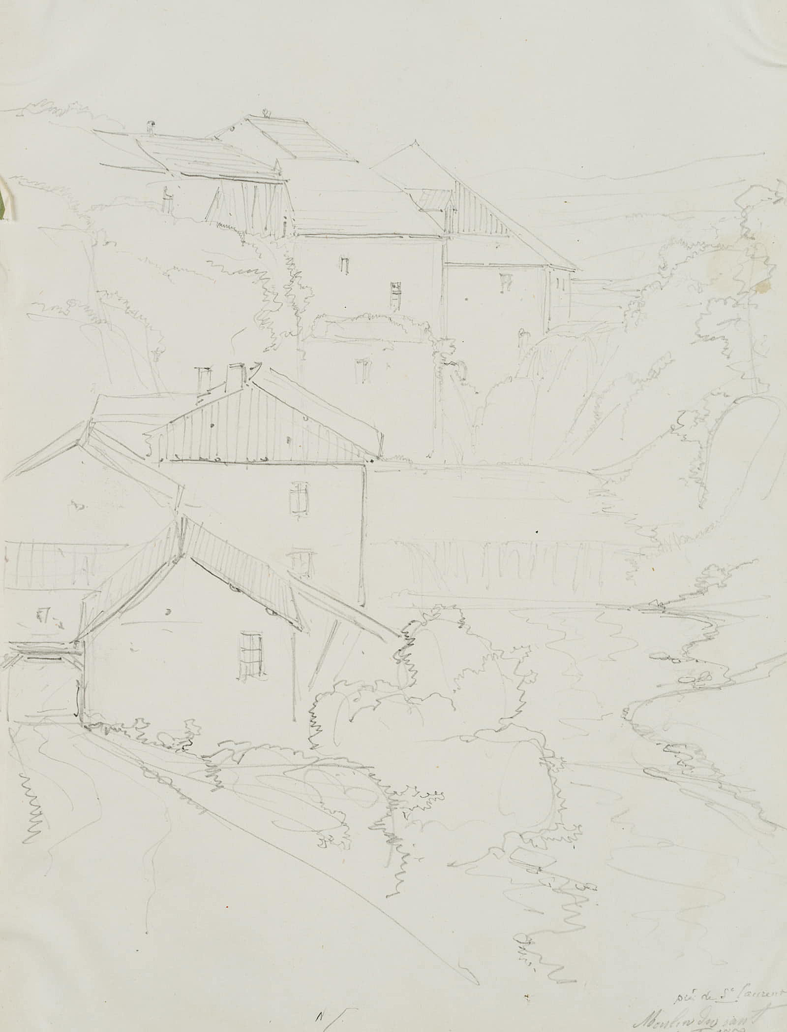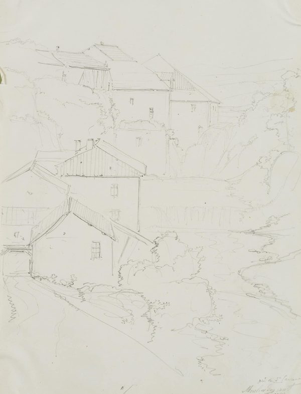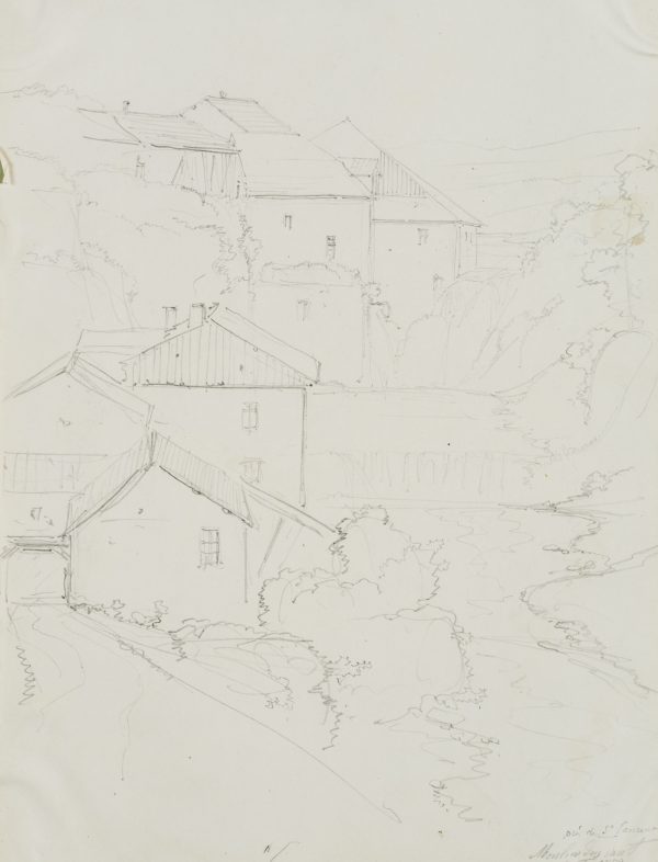 Edmond de Bretenières (1804 Dijon – 1882 ibid.), “Entre Champagnole et St Laurent”, “Moulin des saut[?]”, Trip to Switzerland, Sketchbook, 1852, Pencil