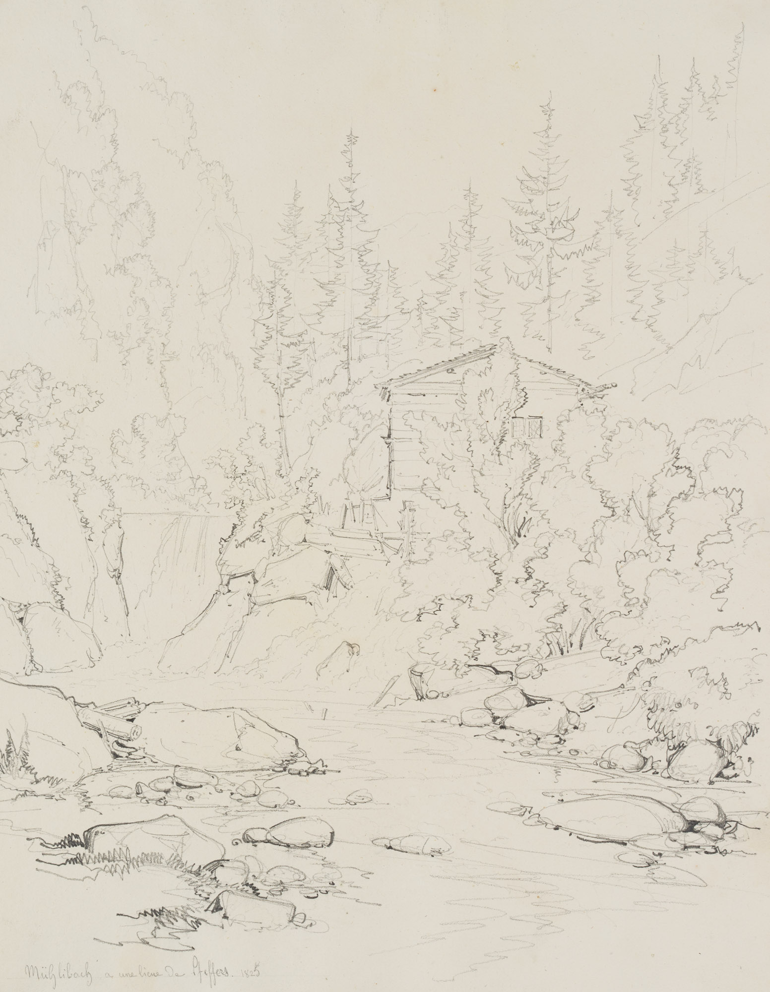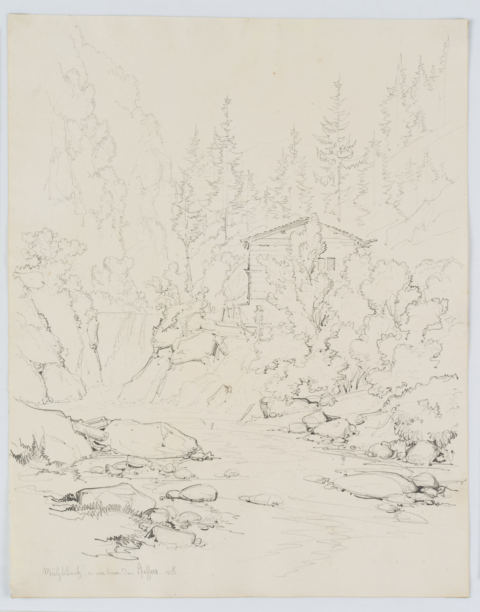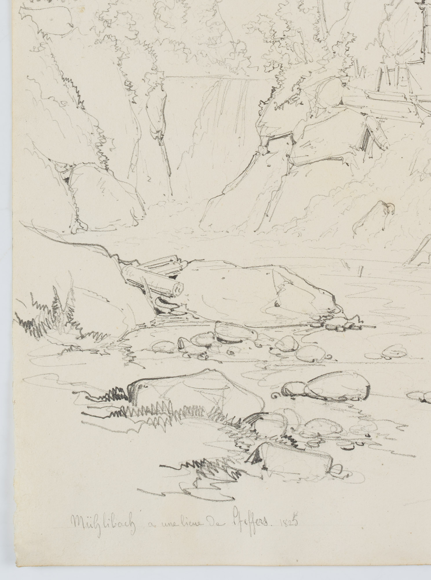 Edmond de Bretenières (1804 Dijon – 1882 ebd.), Mülitobel, Tobel am Zanaibach in der Gemeinde Pfäfers, Kanton St. Gallen in der Schweiz, 1825, Bleistift