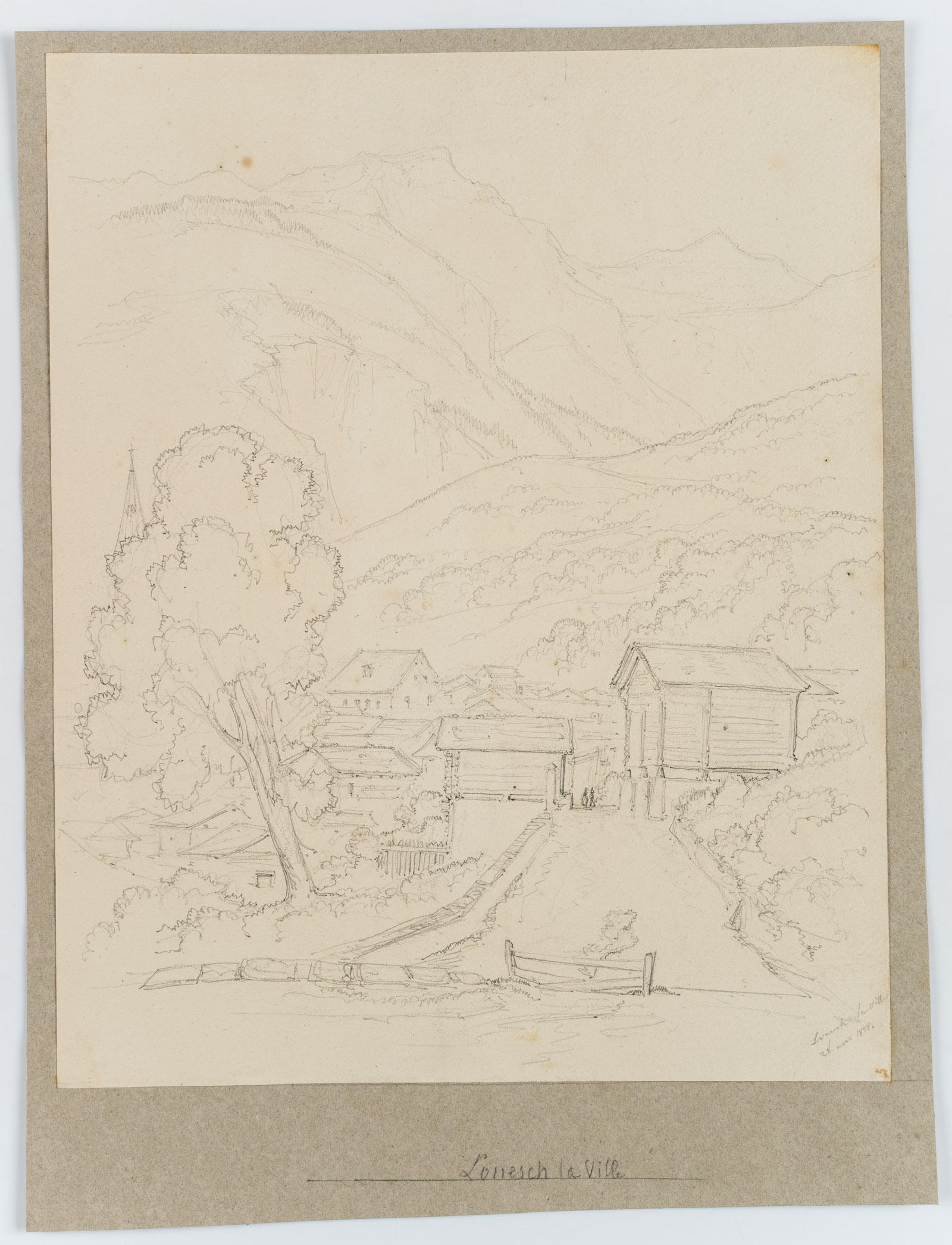 Edmond de Bretenières (1804 Dijon – 1882 ebd.), Ansicht am Ortsrand der Stadt Leuk im Kanton Wallis, Loéche, Leigg, Reise in die Schweiz, Skizzenbuch, 1838, Bleistift