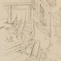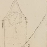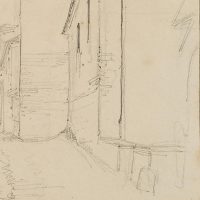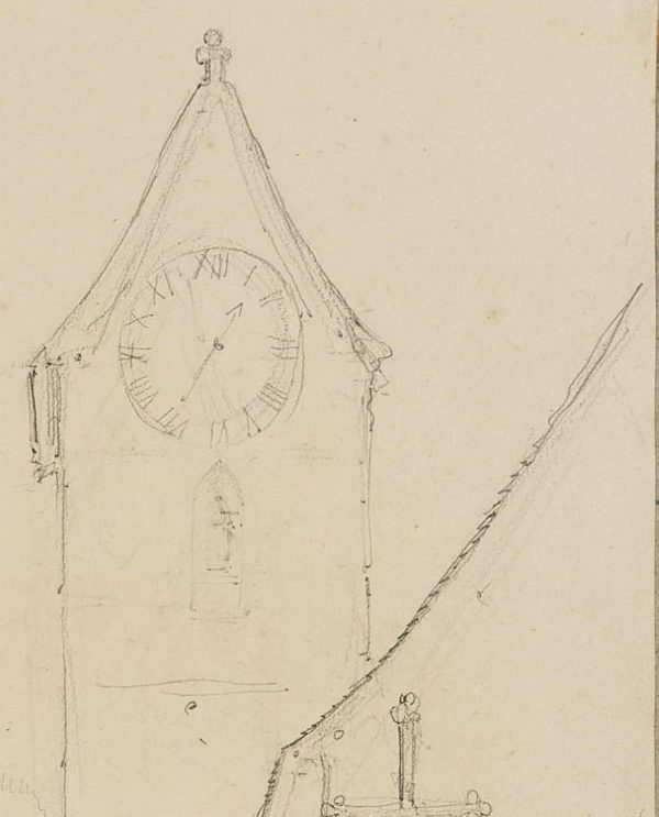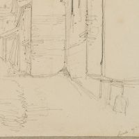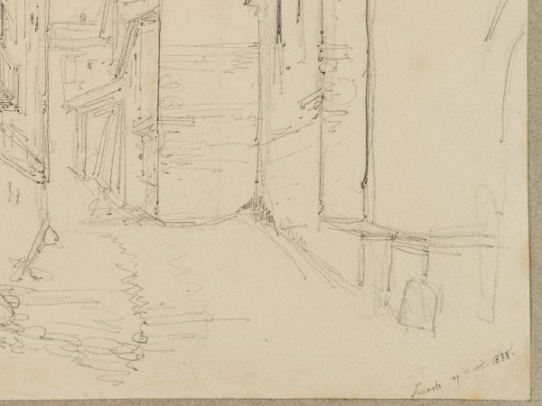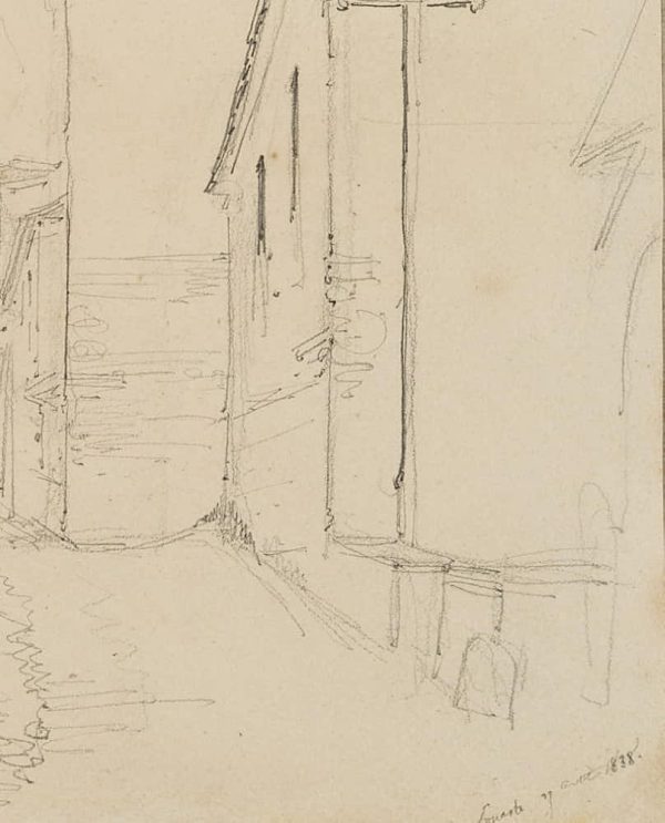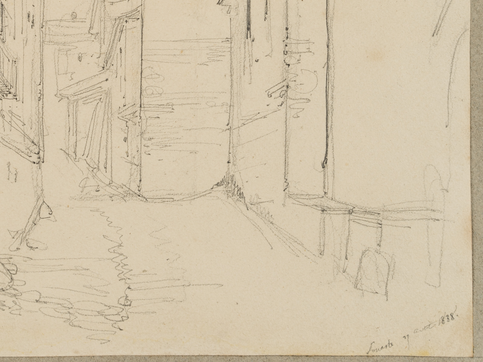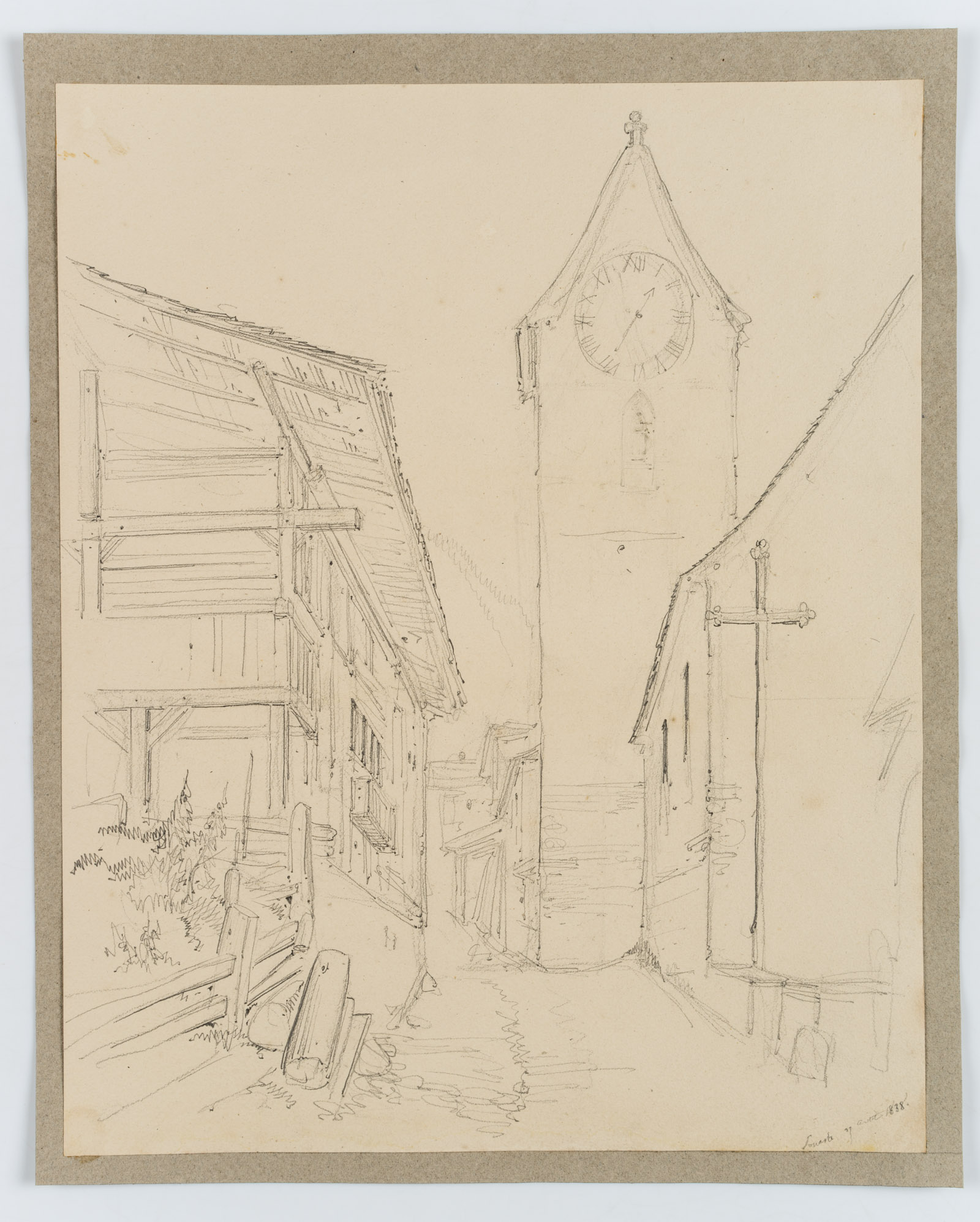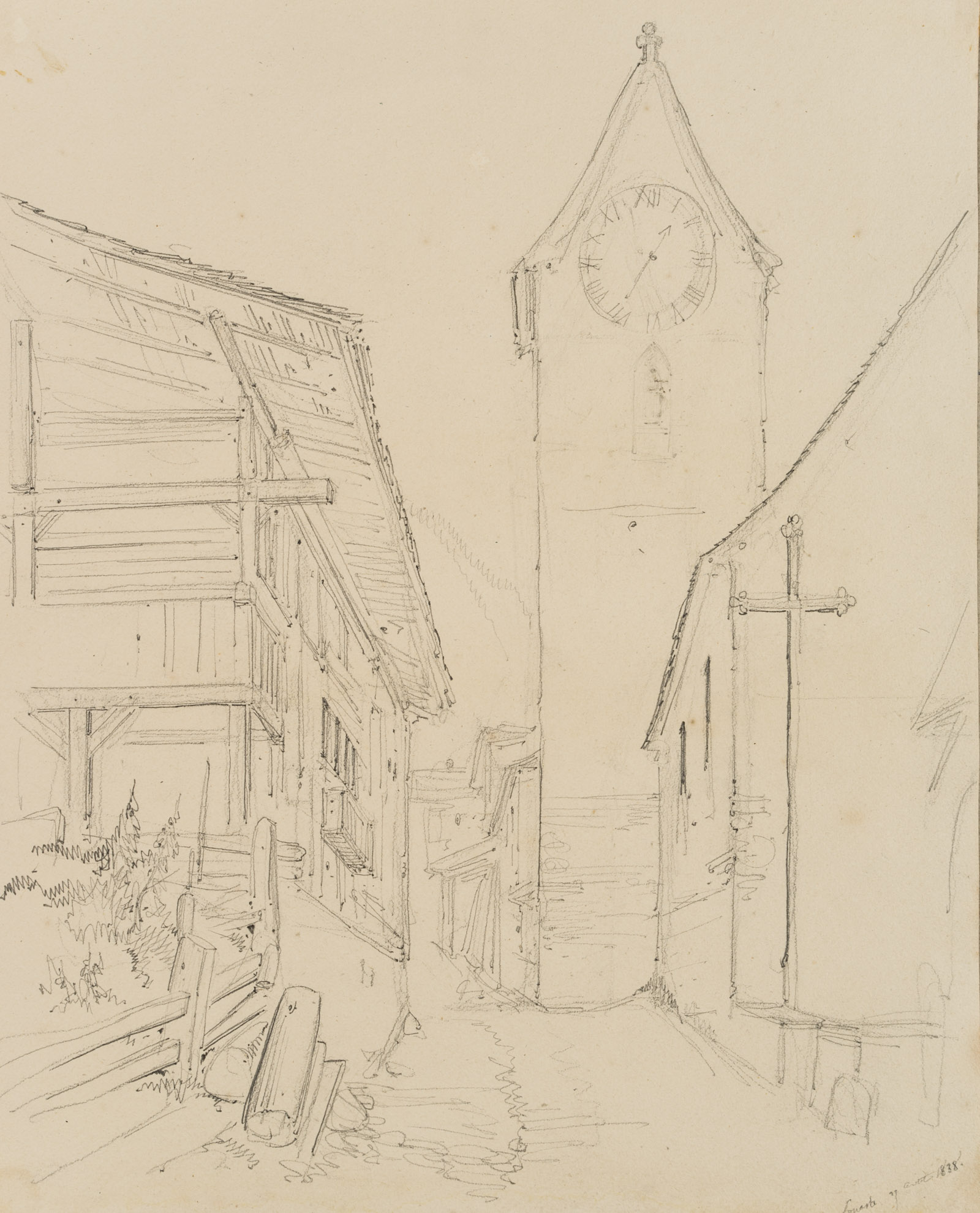 Edmond de Bretenières (1804 Dijon – 1882 ibid.), Parish tower in alley of a village, probably near Leuk in the canton of Valais, Loéche, Leigg, Journey to Switzerland, Sketchbook, 1838, Pencil