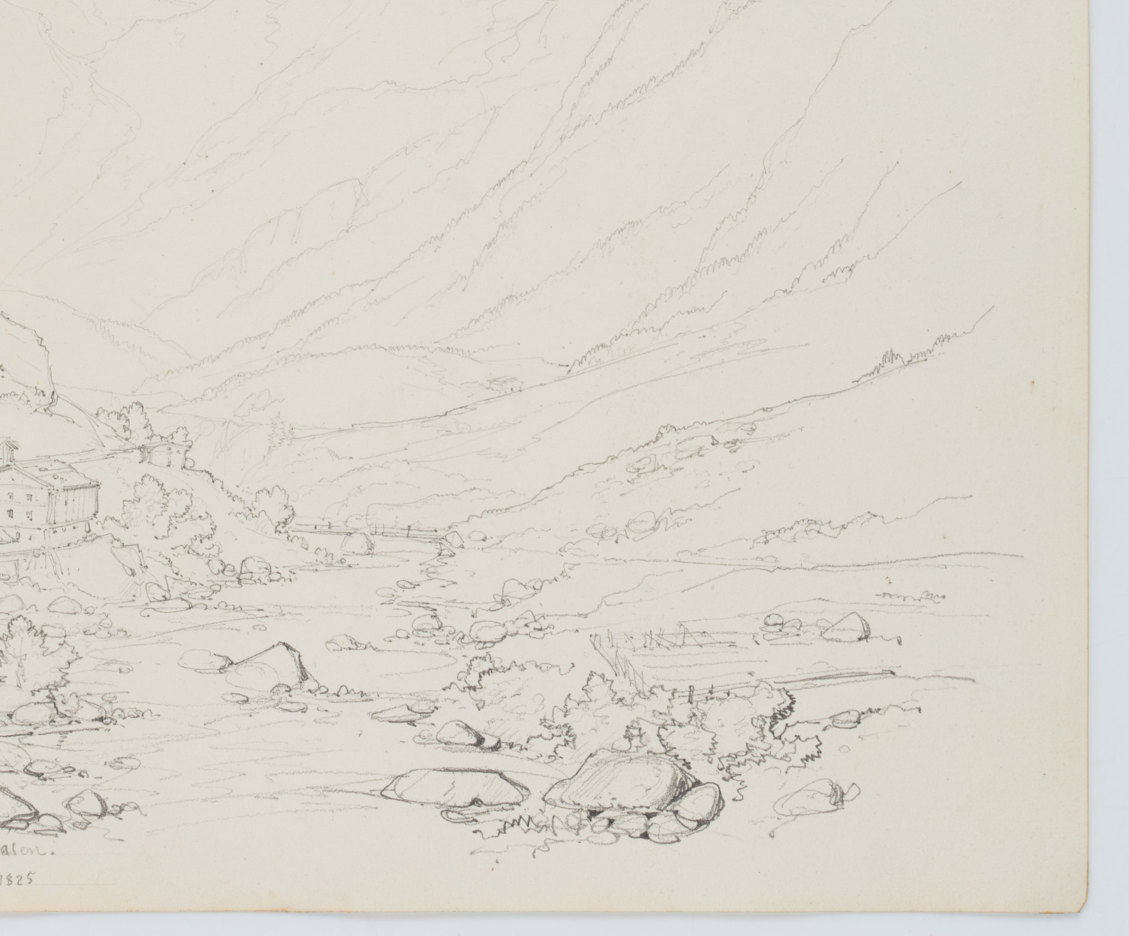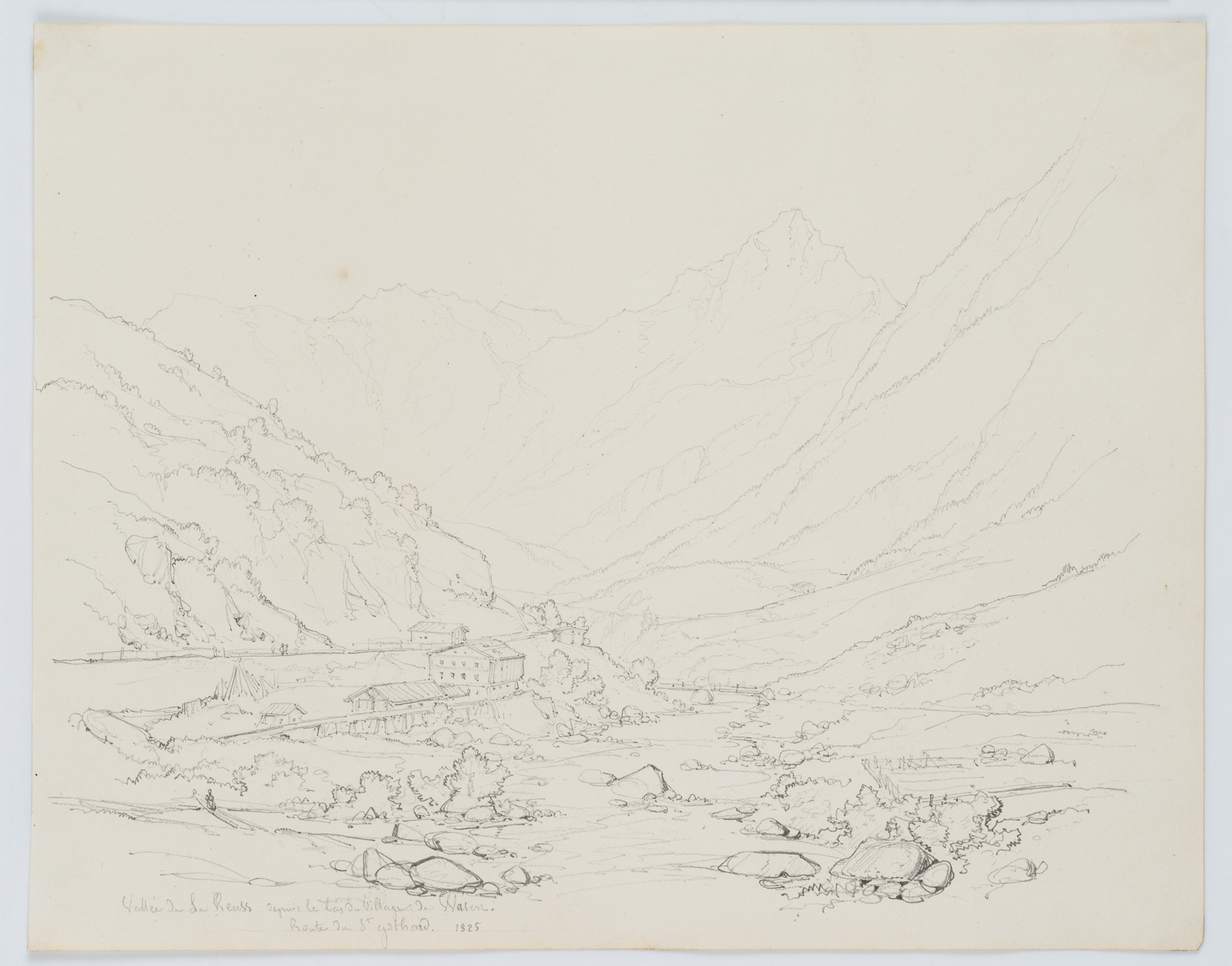 Edmond de Bretenières (1804 Dijon – 1882 ebd.), Blick in das Reuss-Tal, unterhalb von Wassen, Schweiz, 1825, Bleistift