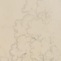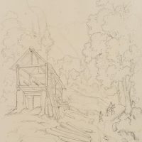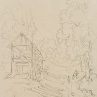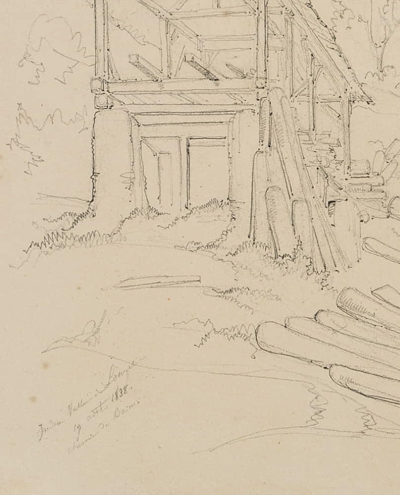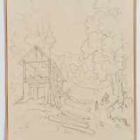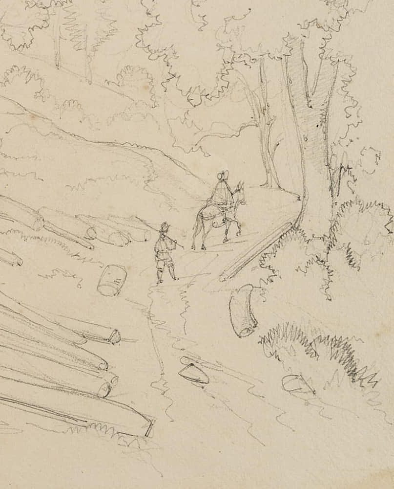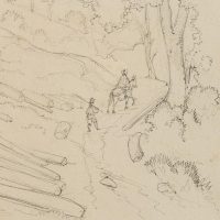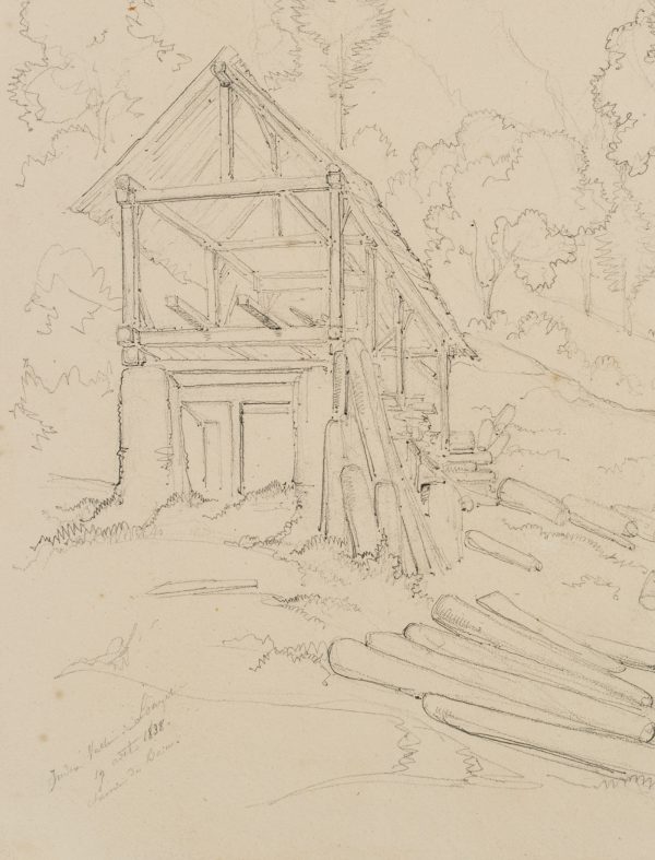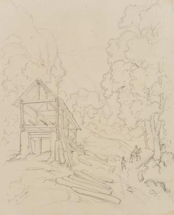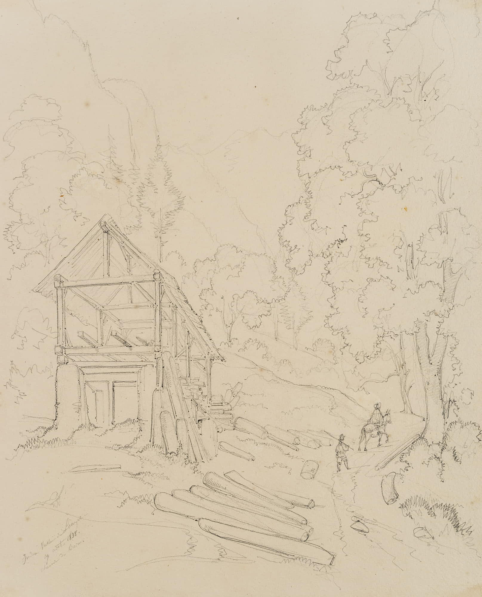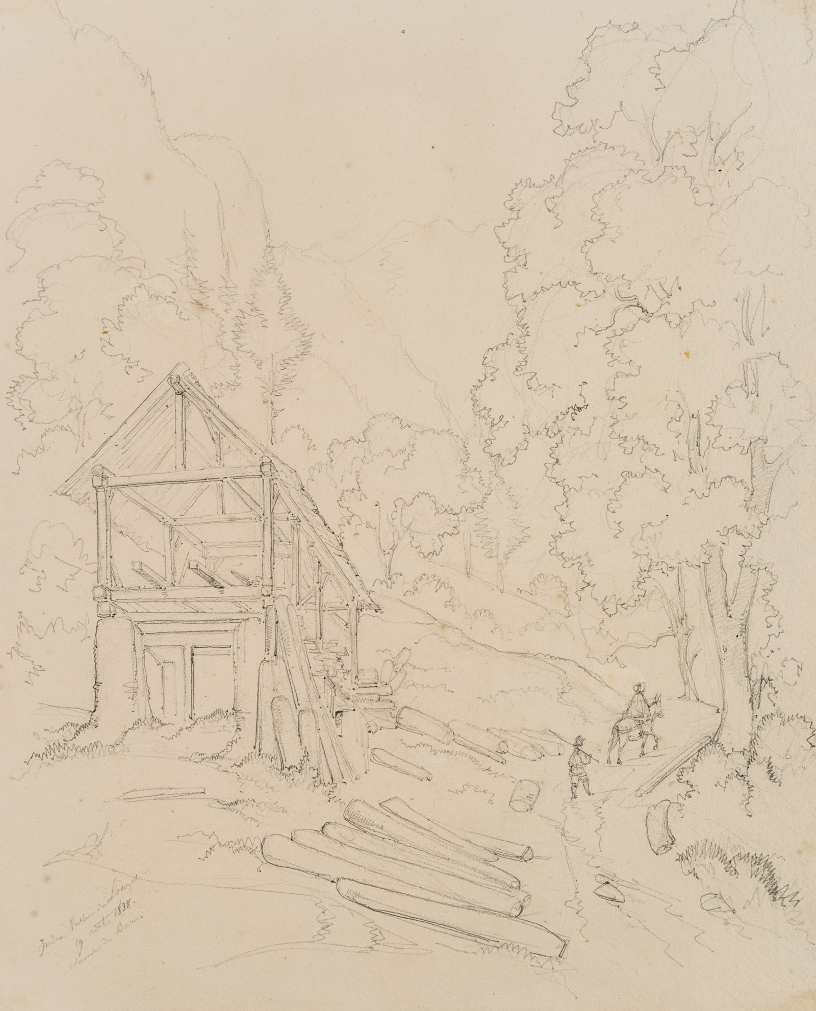 Edmond de Bretenières (1804 Dijon – 1882 ibid.), Sawmill in the forest near Inden in the Dalatal in the canton of Valais, forest path with travelling man and lady on horseback, “Inden Vallée de Louesch” “Chemin du Bains”, journey to Switzerland, sketchbook, 1838, Pencil