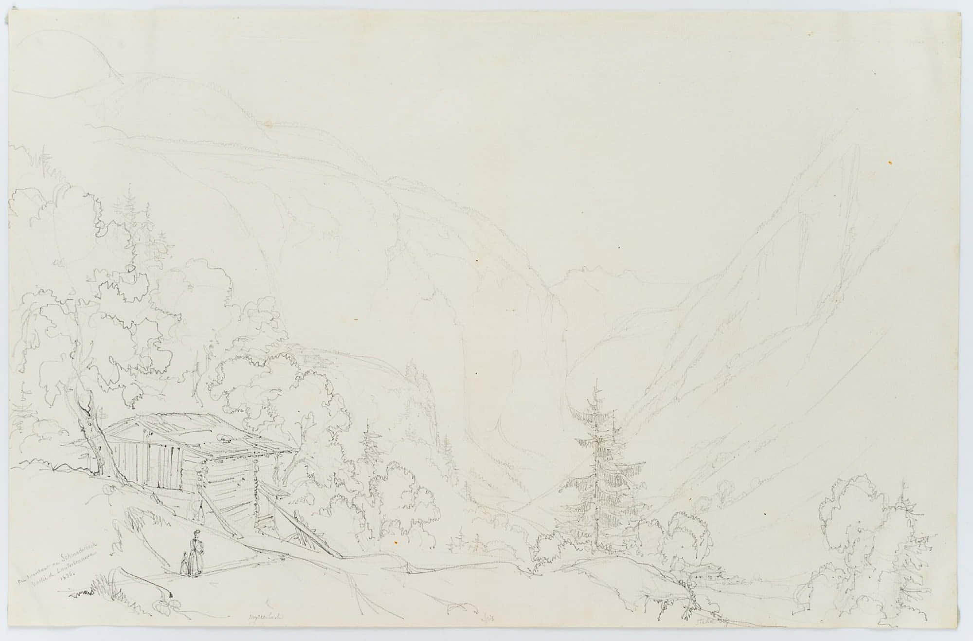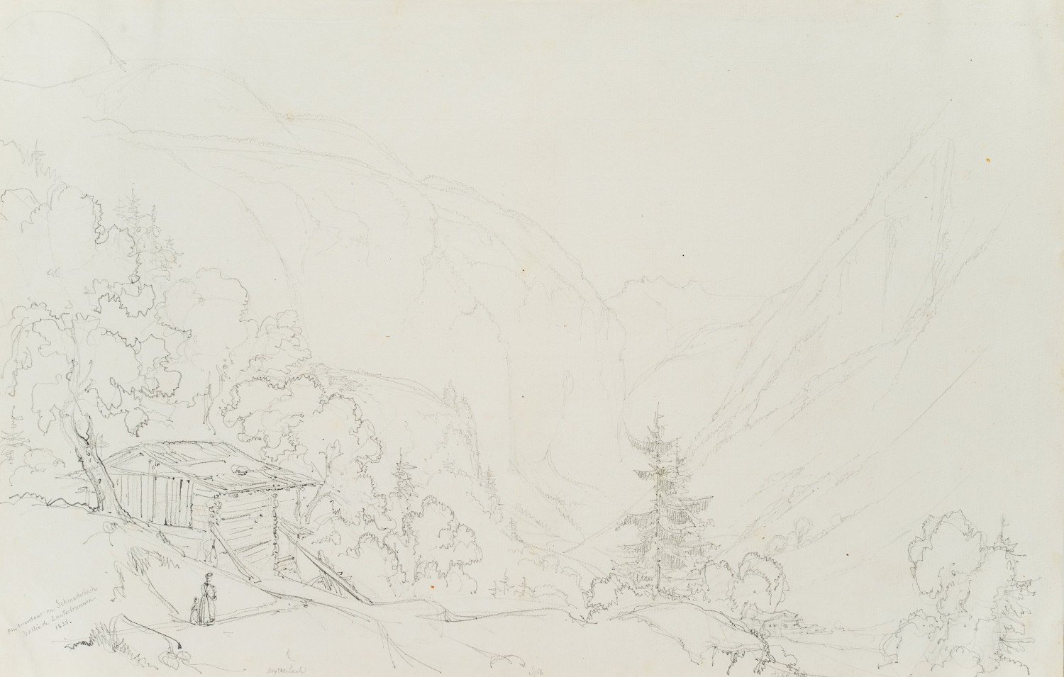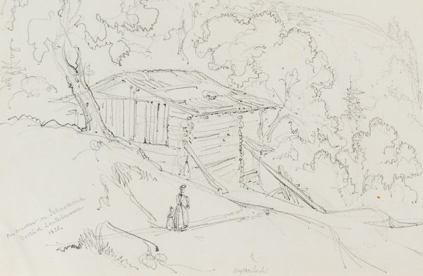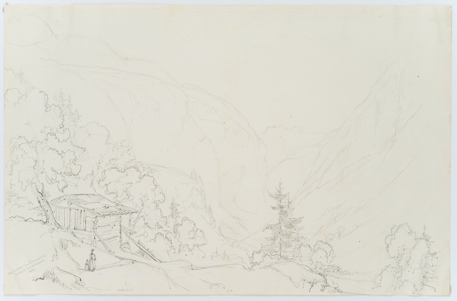 - Beschreibung: Landschaftsskizze des urwüchsigen Lauterbrunnentals. Im Vordergrund eine Hütte mit spazierender Dame mit Mädchen.