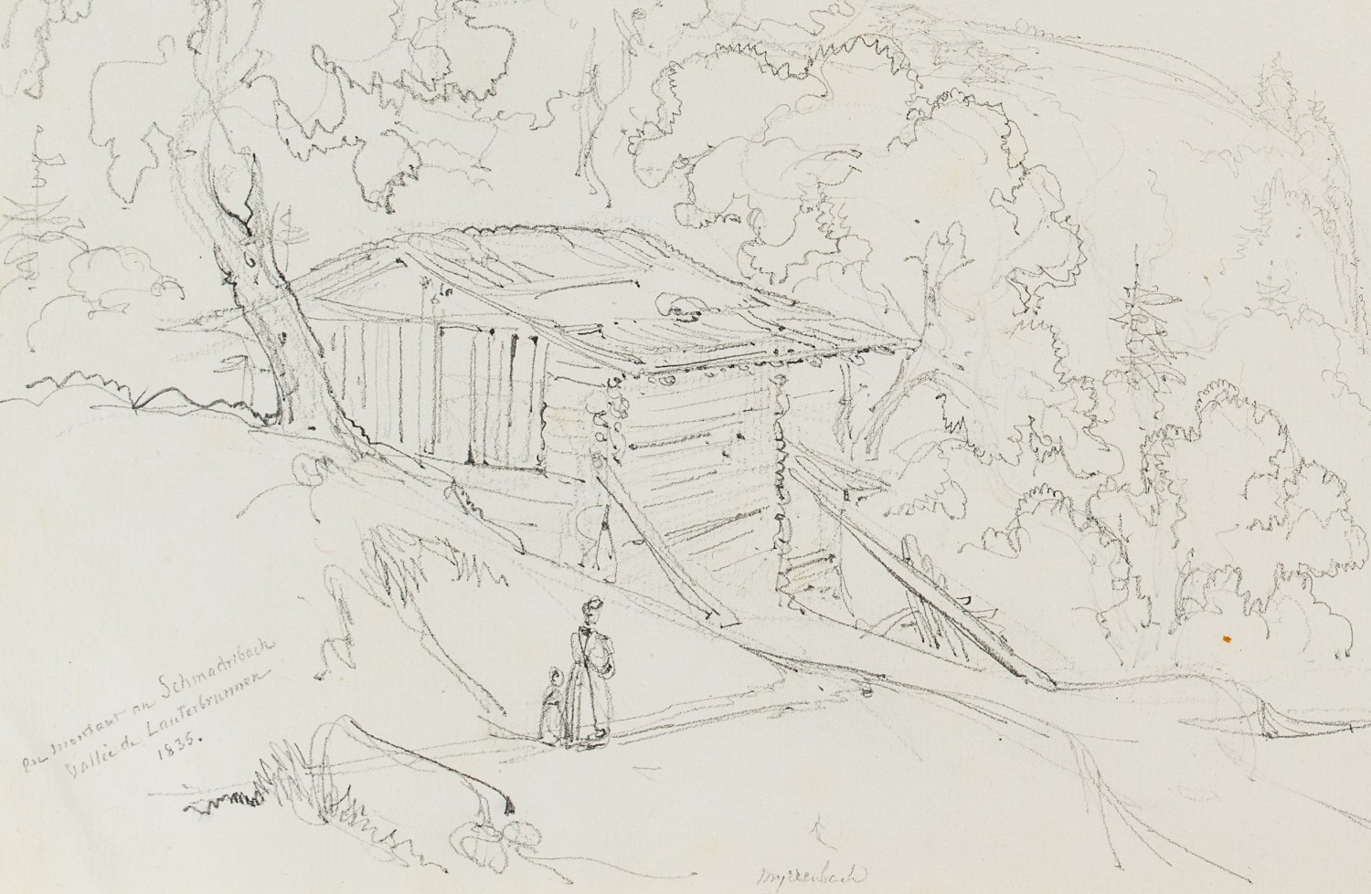 - Description: Landscape sketch of the unspoilt Lauterbrunnen Valley. In the foreground a hut with a lady walking with a girl.