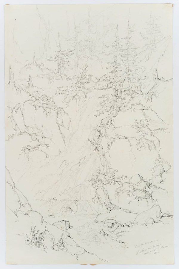 - Beschreibung: Wunderschöne Skizze am Fuße eines tosenden Wasserfalles. Auf den Felsen am Ufer pittoreske Fichten.