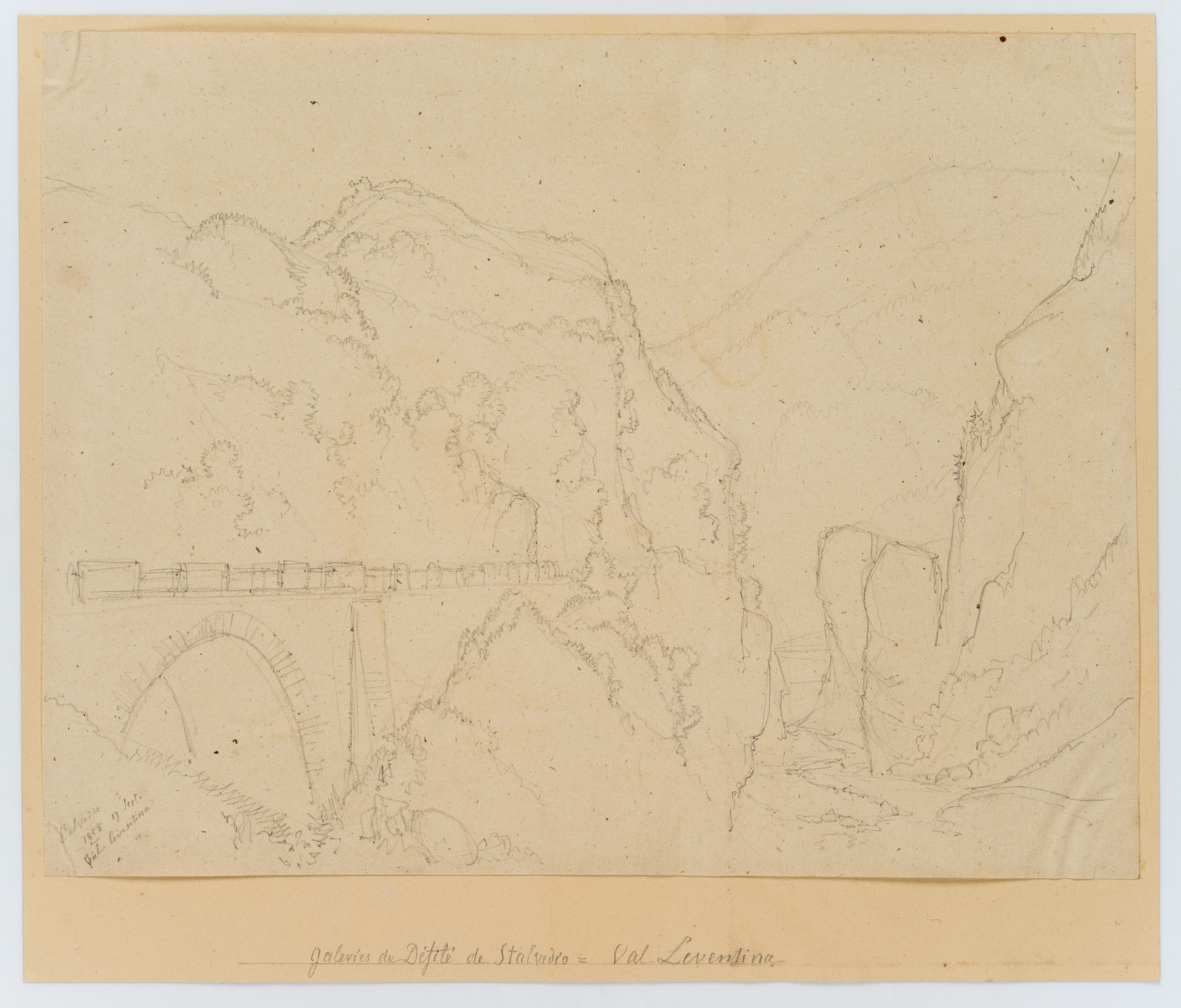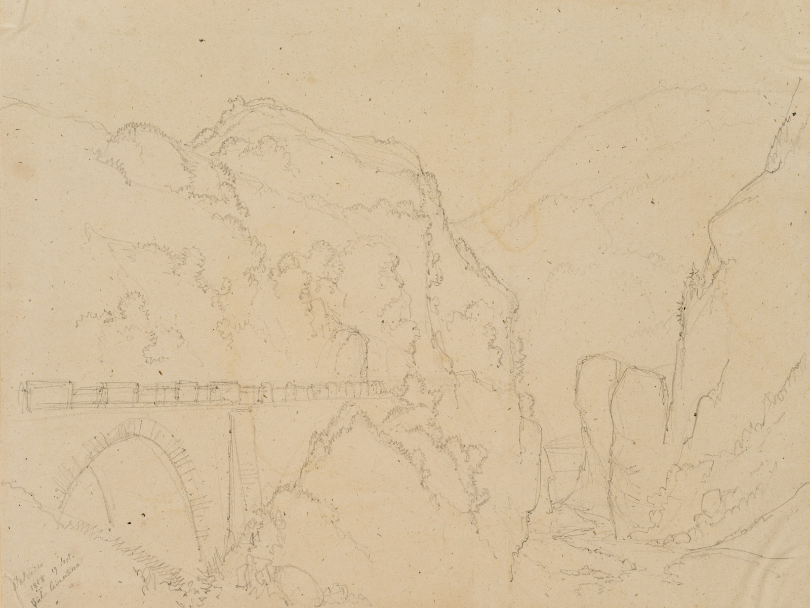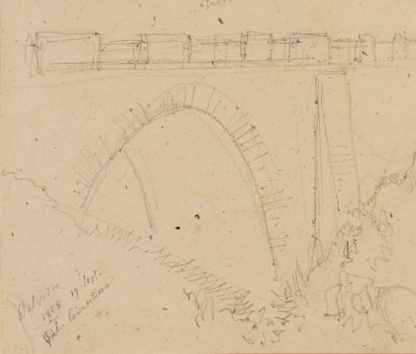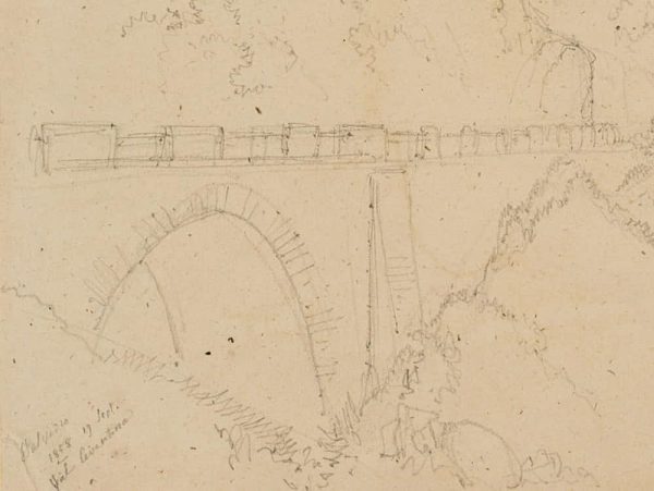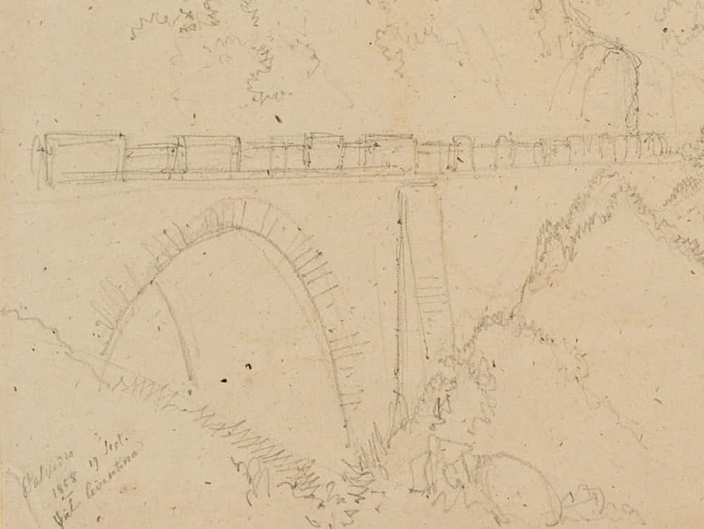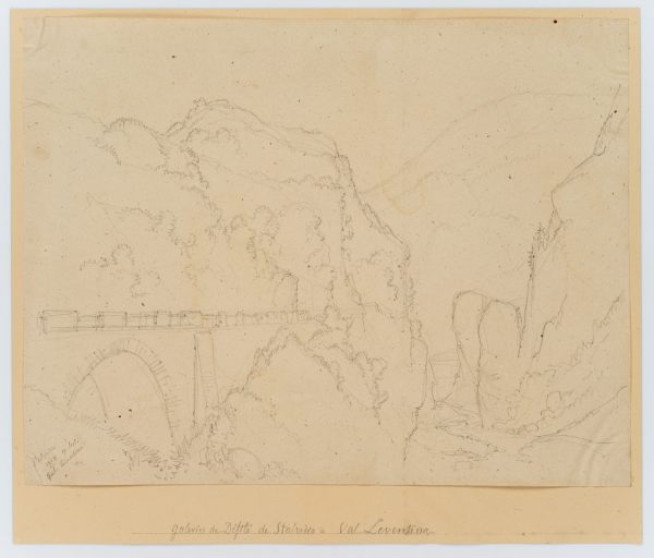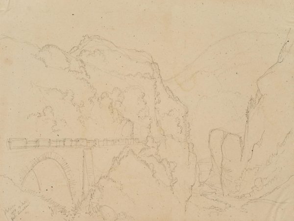 Edmond de Bretenières (1804 Dijon – 1882 ibid.), High bridge near Stalvedro Castle in the Valle Leventina in the Canton of Ticino, Journey to Switzerland, Sketchbook, 1858, Pencil