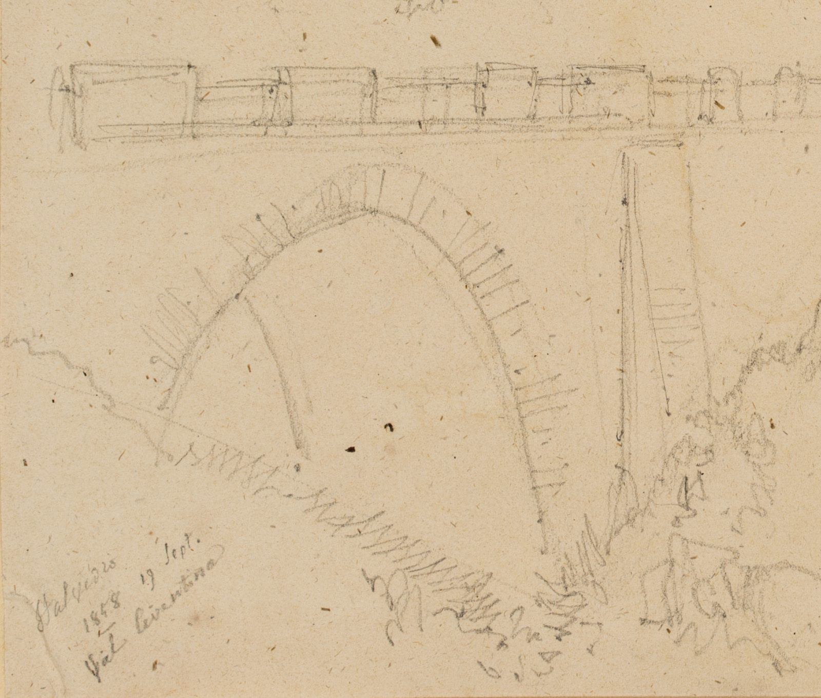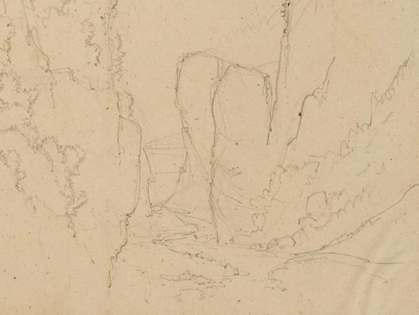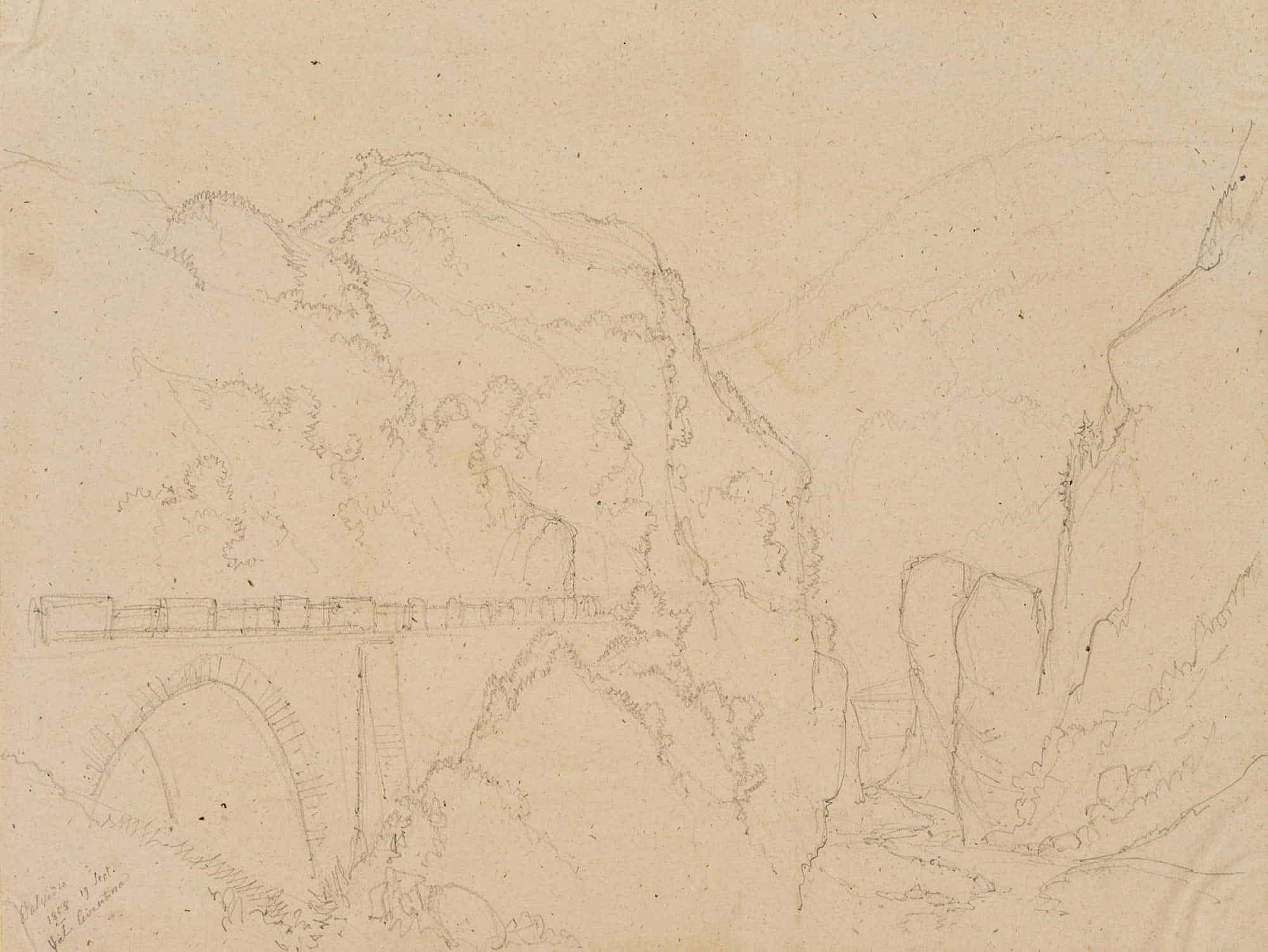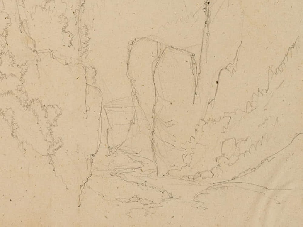 Edmond de Bretenières (1804 Dijon – 1882 ibid.), High bridge near Stalvedro Castle in the Valle Leventina in the Canton of Ticino, Journey to Switzerland, Sketchbook, 1858, Pencil