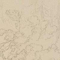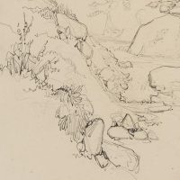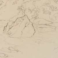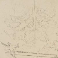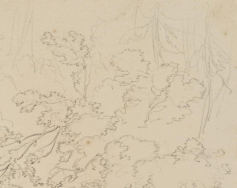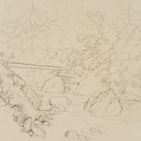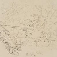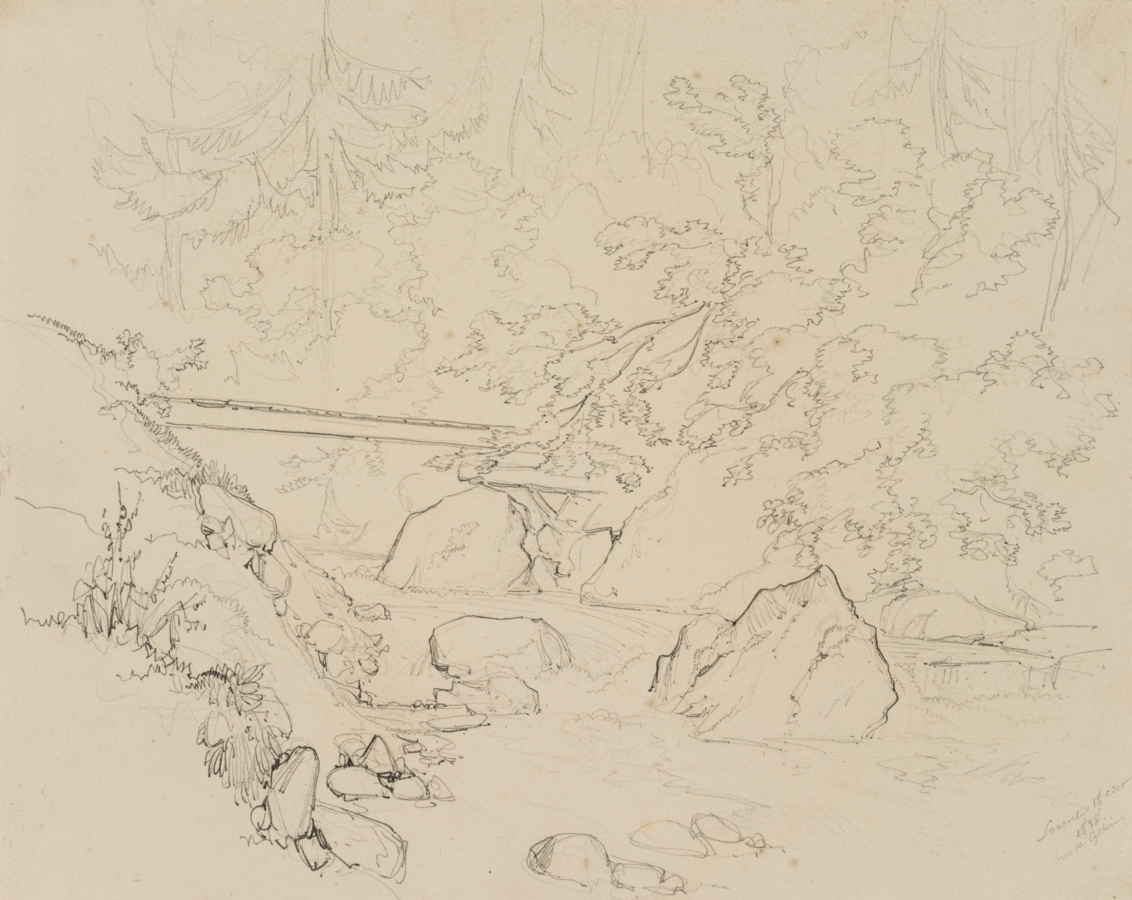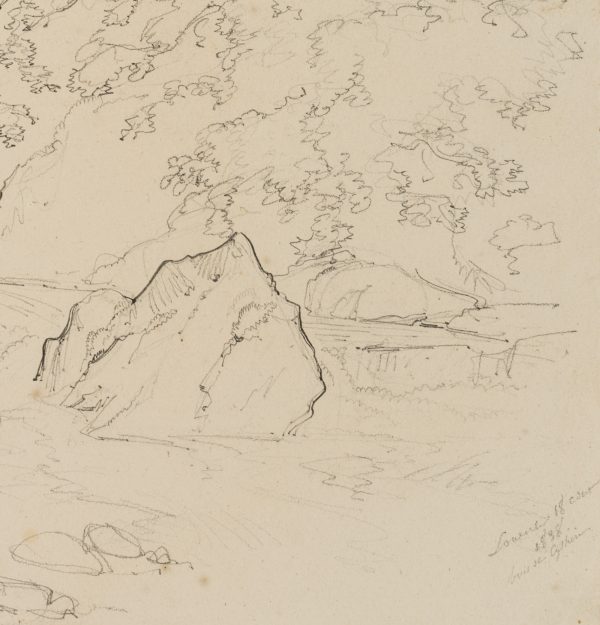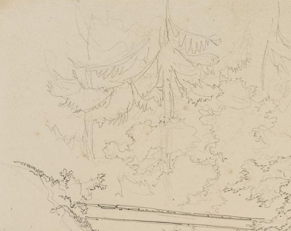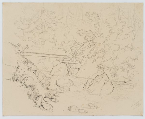 Edmond de Bretenières (1804 Dijon – 1882 ibid.), Wooden footbridge in the forest over the Dala near Leuk in the canton of Valais, Loéche, Leigg, Trip to Switzerland, Sketchbook, 1838, Pencil