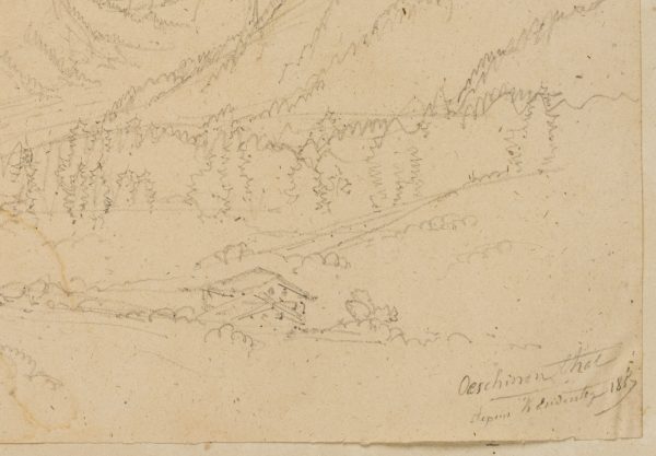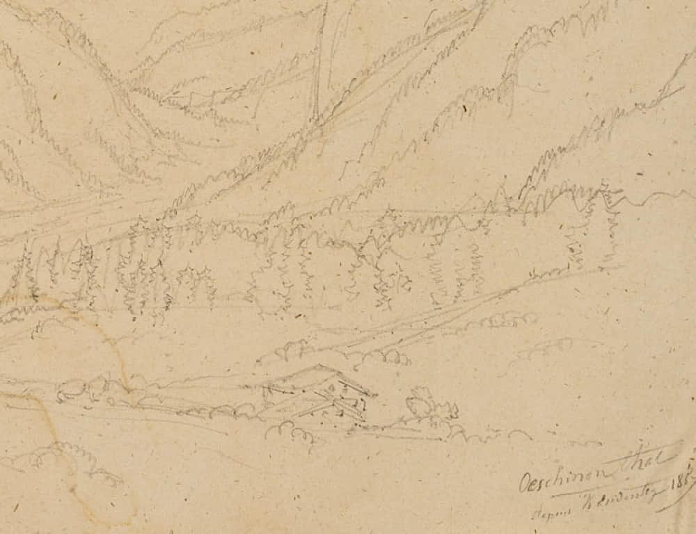 Aus einem Sammelalbum mit Reiseskizzen des Künstlers. “Esquisses faites par le Baron Edmond de Bretenières feudant les voyages en Suisse” (Skizzen, die Baron Edmond de Bretenieres während seiner Reisen in der Schweiz angefertigt hat).