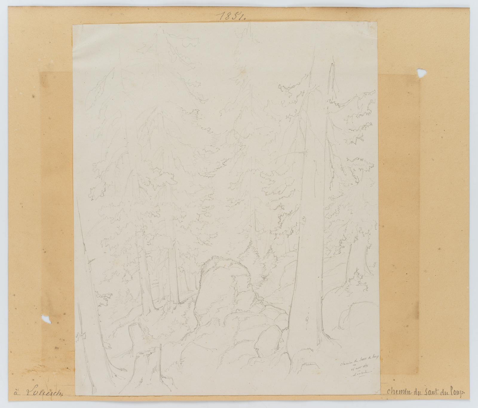Edmond de Bretenières (1804 Dijon – 1882 ebd.), Wald bei Saut du Loup im Kanton Wallis, Loéche, Leigg, “Chemin du Saut du Loup à Louesch”, Reise in die Schweiz, Skizzenbuch, 1851, Bleistift