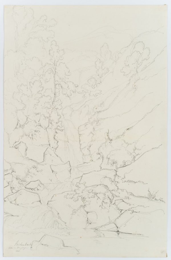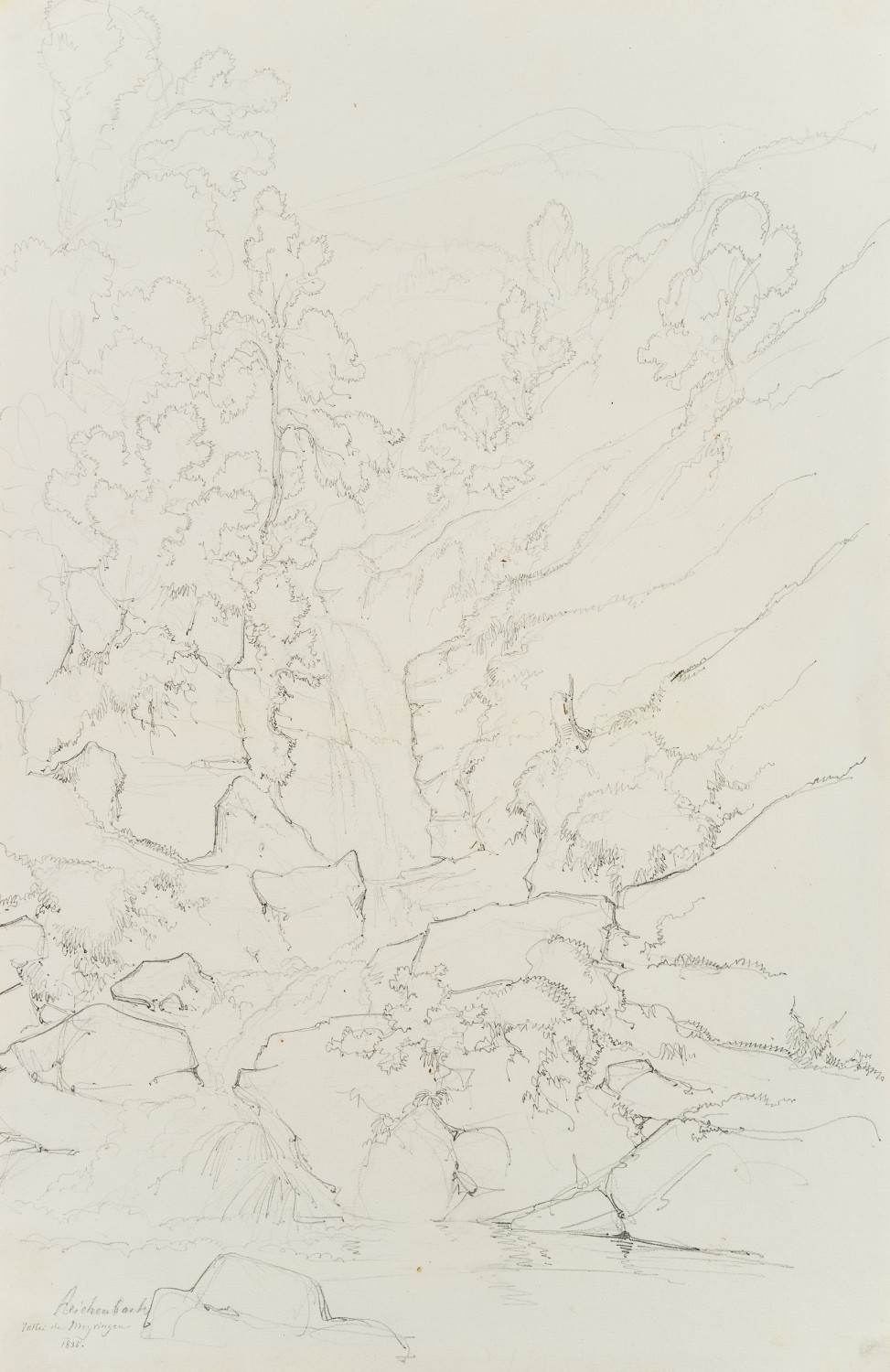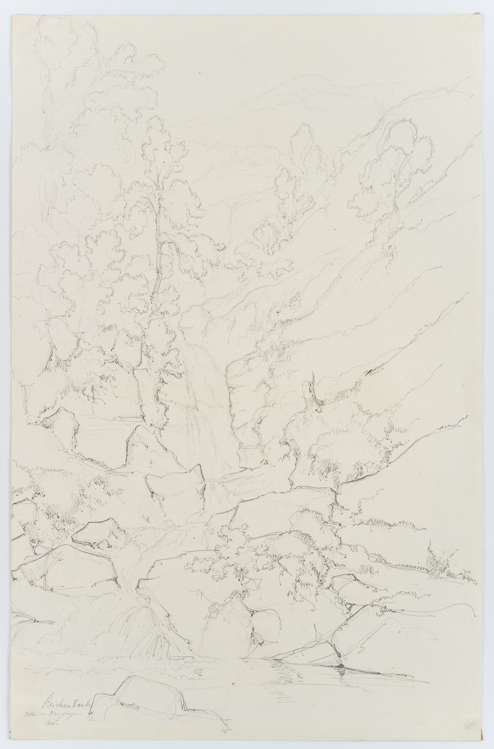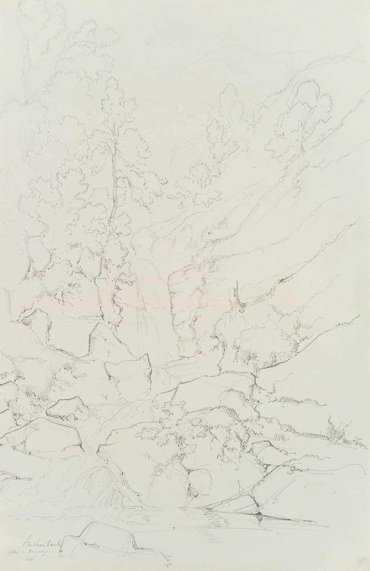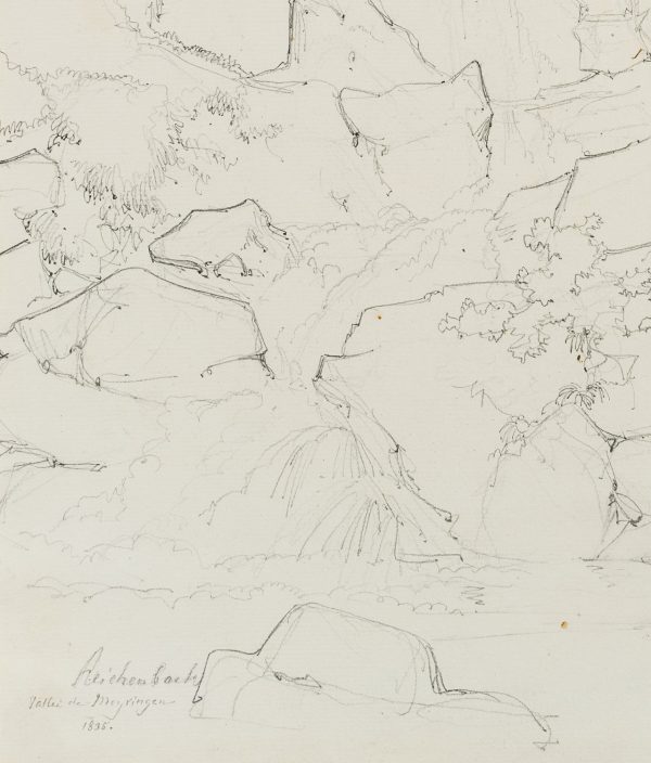 Edmond de Bretenières (1804 Dijon – 1882 ebd.), Wasserfall bei Meiringen im Reichenbachtal, Reise in die Schweiz, Skizzenbuch, 1835, Bleistift