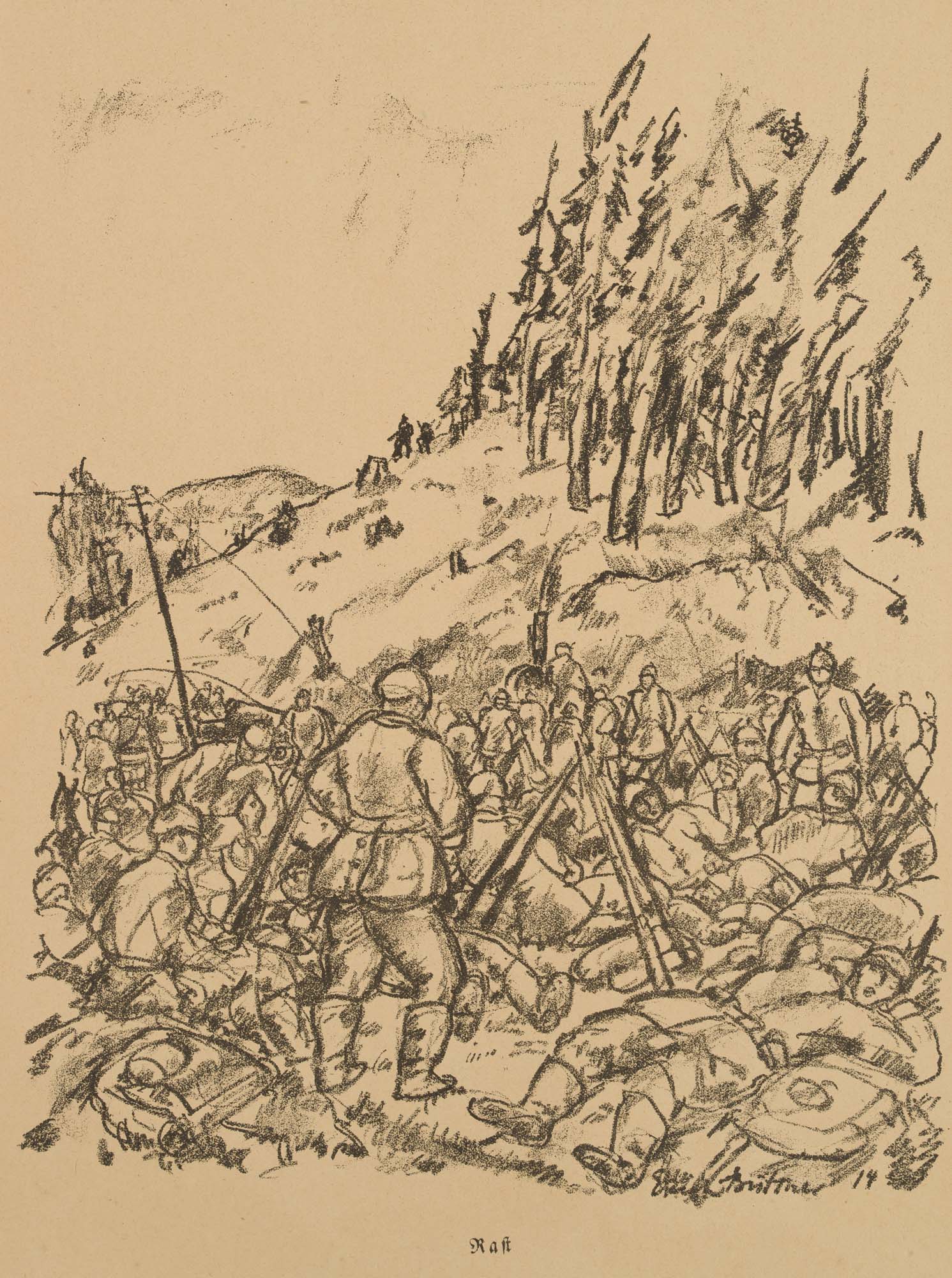 Erich Büttner (1889 Berlin – 1936 Freiburg im Breisgau), ‘Rast’. Titelblatt zu ‘Kriegszeit – Künstlerflugblätter’, Ausgabe Nr. 12, 11. November 1914, hrsg v. Paul Cassirer, 1914, Lithographie