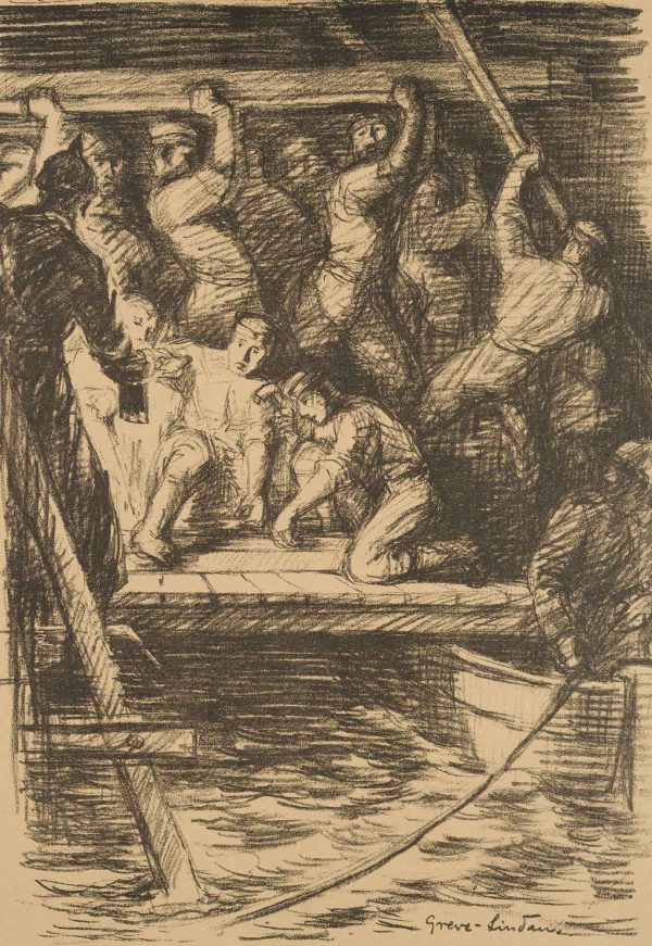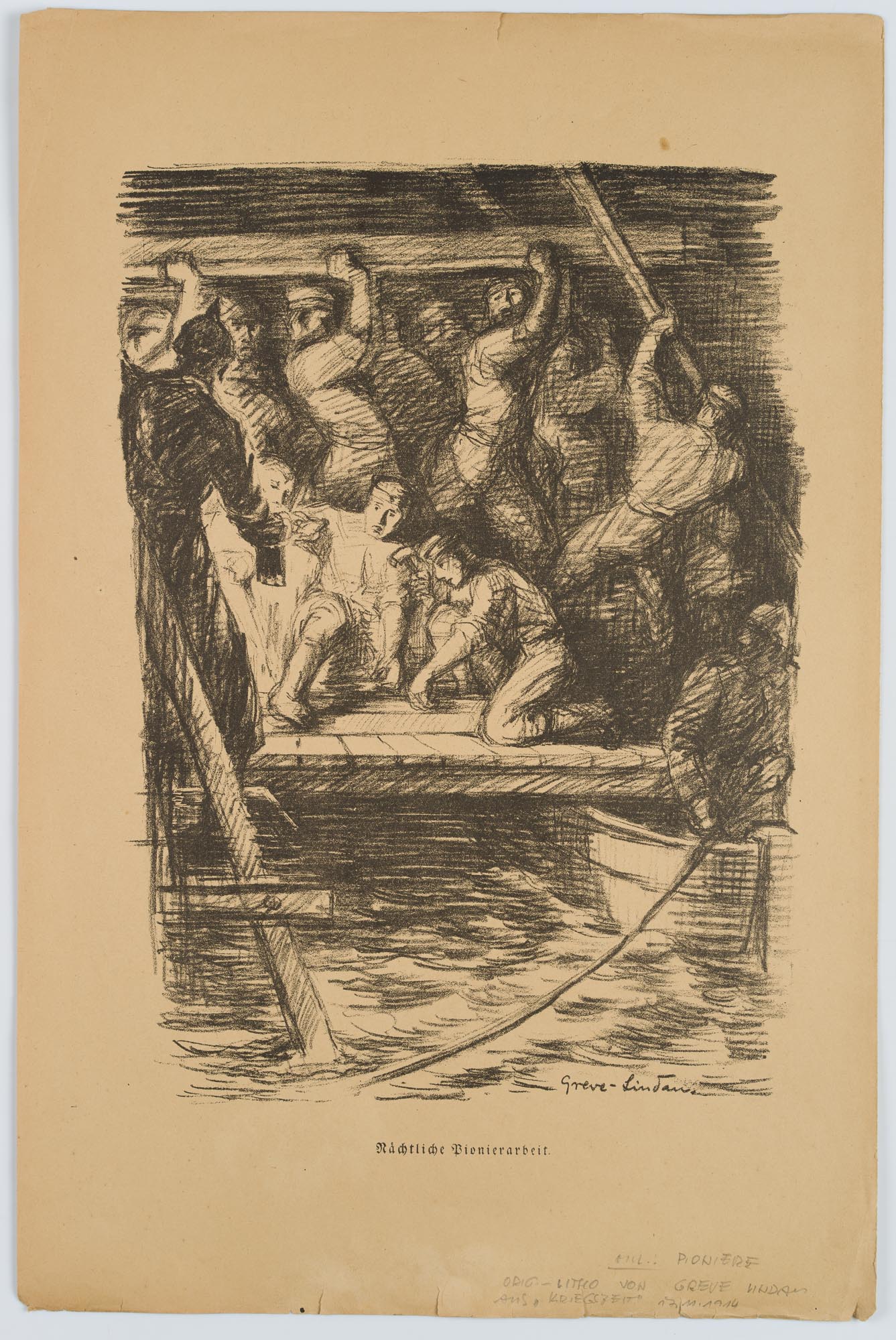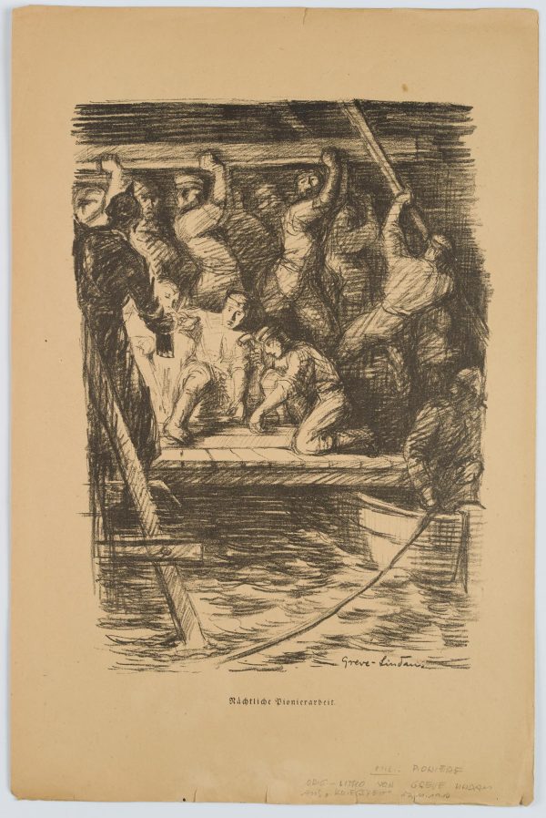 • Description: On the reverse the lithograph: ‘Nächtliche Pionierarbeit’ by Georg GREVE-LINDAU (b. 1876 Lindau). The etchings are signed lower right, as well as titled below. About the magazine ‘Kriegszeit’: In August 1914, Paul Cassirer Verlag began publishing Kriegszeit, a weekly, four-page publication on artistic reactions to the First World War. Most of the artists represented in the magazine belonged to the Berlin Secession. At first, the Kriegszeit contributors greeted the war with enthusiasm and had faith in the military under Wilhelm II and belief in the righteousness of the Germans. However, this basic current was soon followed by disillusionment, which found expression in changed themes. Instead of patriotically enthusiastic soldiers in battle scenes, escapist pictorial works with critical undertones and partly pacifist approaches soon appeared.