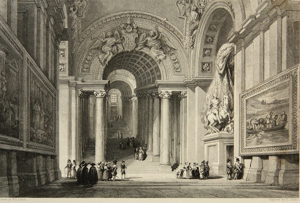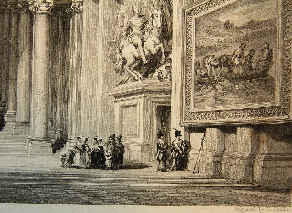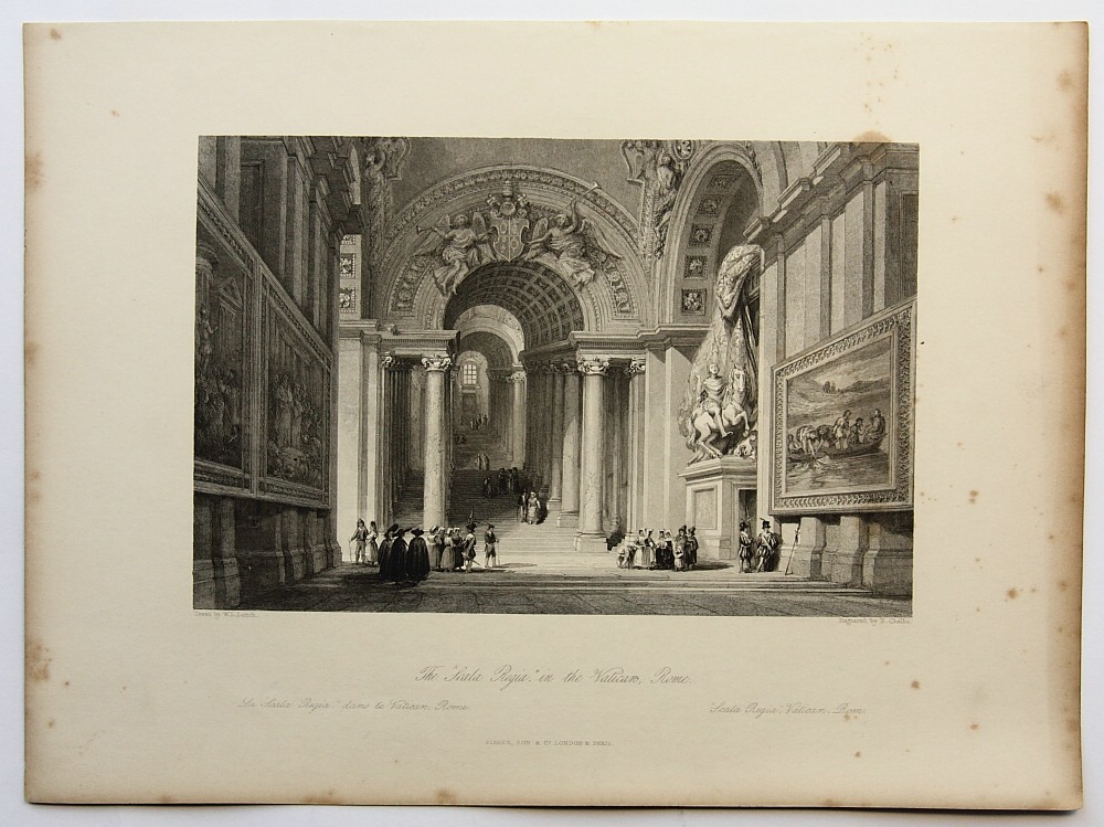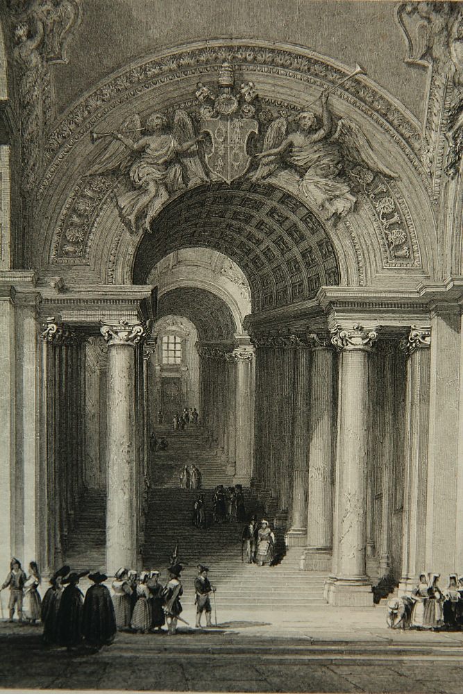 - Description: Steel engraving on strong paper. After an original by William Leighton Leitch (1804 Glasgow – 1883 London). Historical view of the busy vestibule at the entrance to the Vatican. In the foreground is Bernini’s equestrian statue of Constantine the Great (1663-1670).