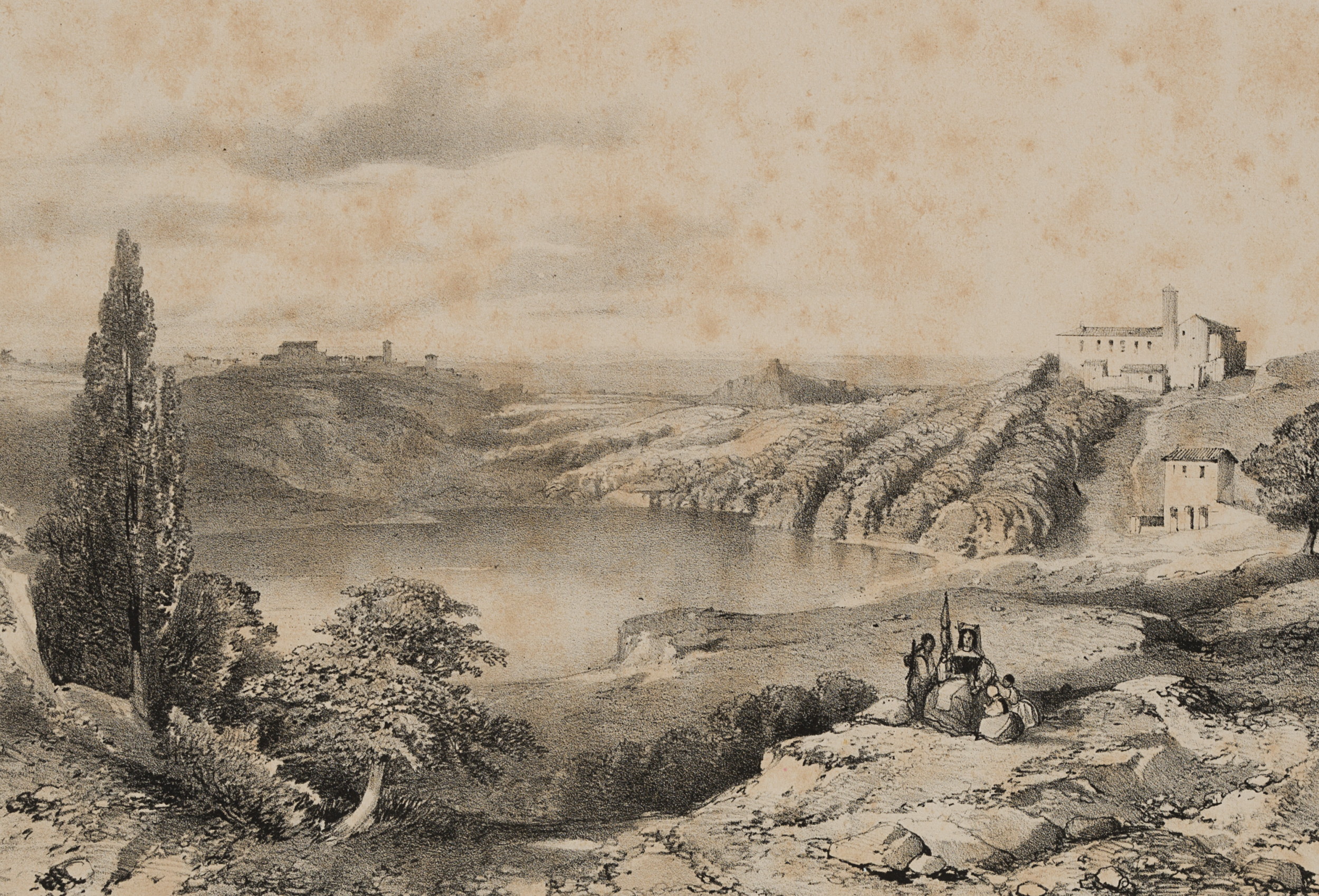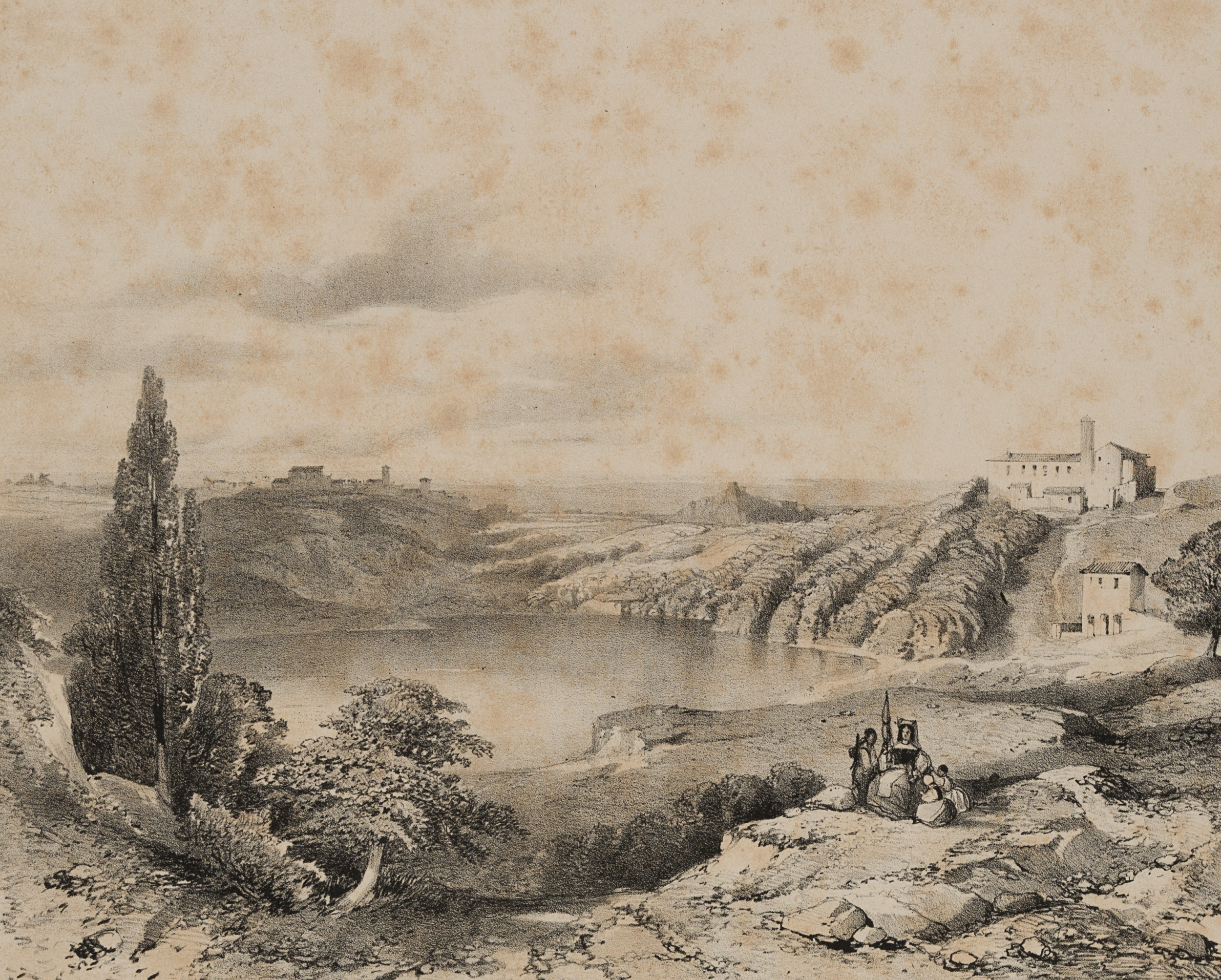 Eugène Cicéri (1813 Paris – 1890 Marlotte), Le lac de Némi – View of Lake Nemi near Rome, c. 1840, Lithography