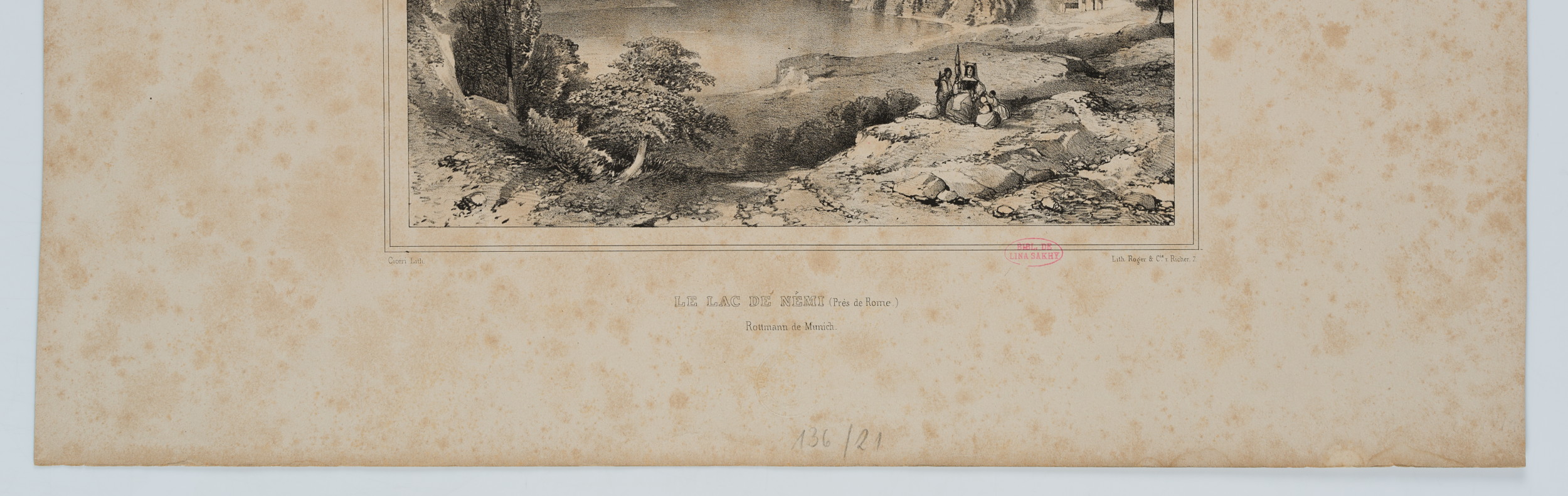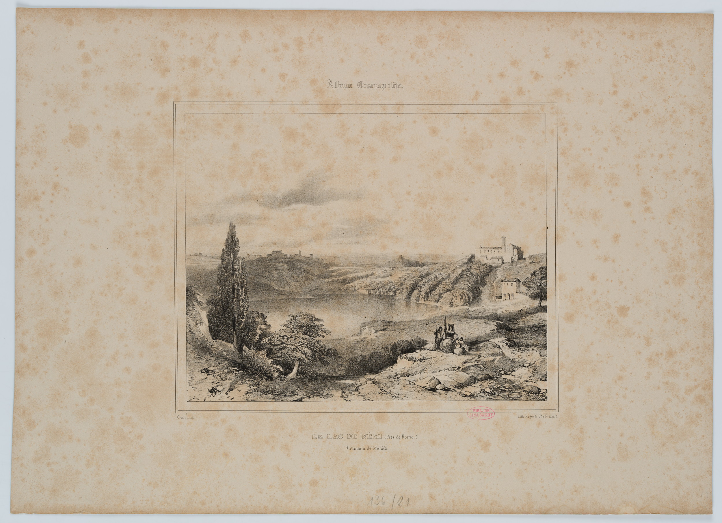 - Inscription: lower left signed in the printing plate: “Ciceri Lith.”. Upper middle inscribed in the printing plate: “Album Cosmopolite.”. Lower middle further inscription: “Le Lac De Némi (Près de Rome)”.