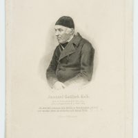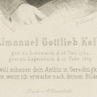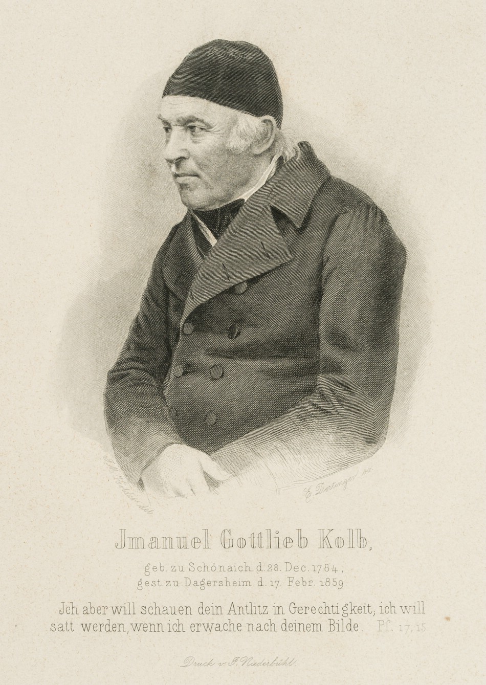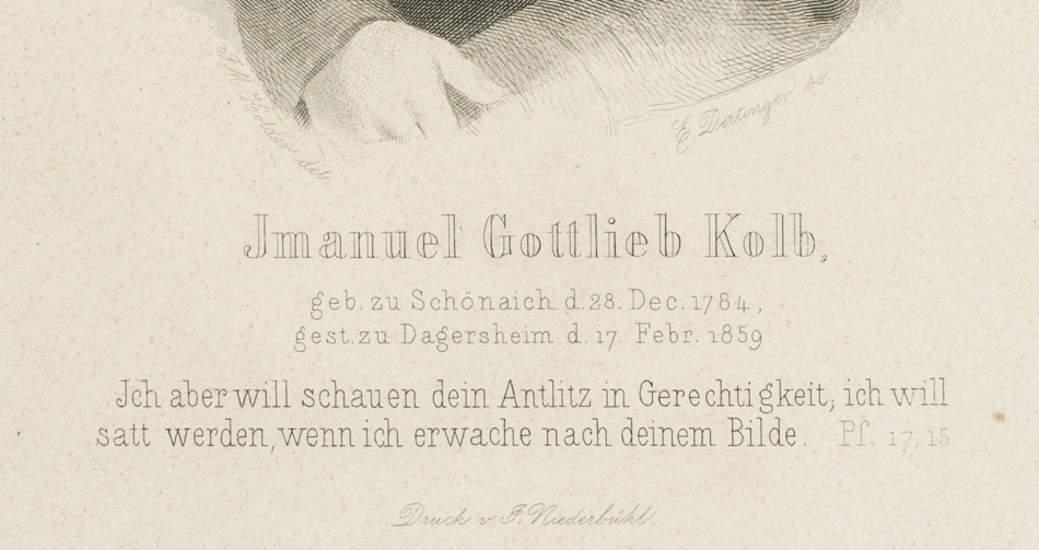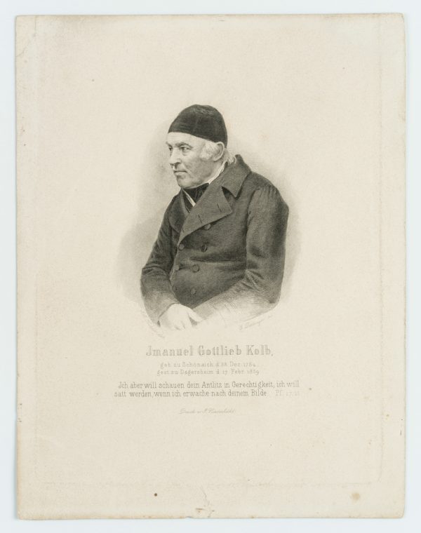 - Description: After an original by Johann Michael Holder (1796 Hildrizhausen – 1861 Stuttgart). Half-length portrait in three-quarter profile of the bent schoolmaster and honorary citizen of Dagersheim. The portrait was intended to illustrate the work Kurzer Lebensabriß von Immanuel Gottlieb Kolb, Schulmeister in Dagersheim, nebst einer Sammlung von Betrachtungen, Briefen etc. (Short outline of the life of Immanuel Gottlieb Kolb, schoolmaster in Dagersheim, together with a collection of reflections, letters etc.).