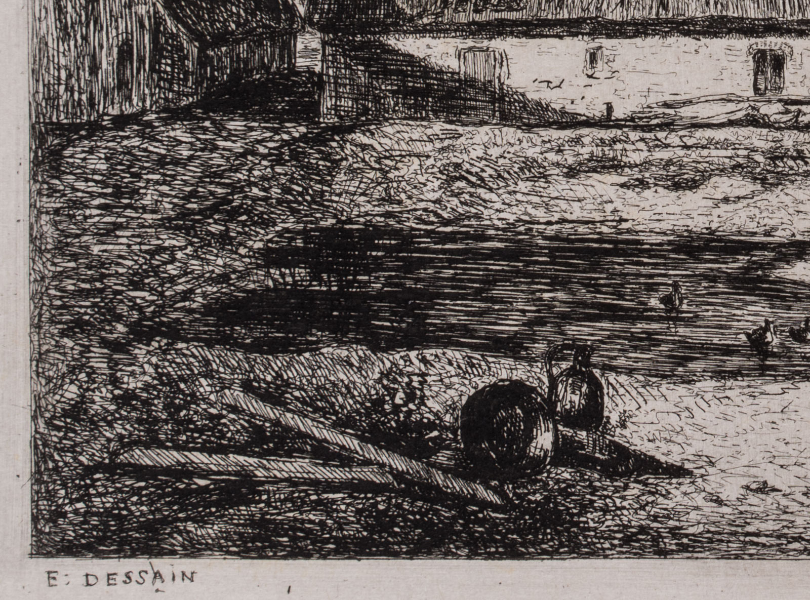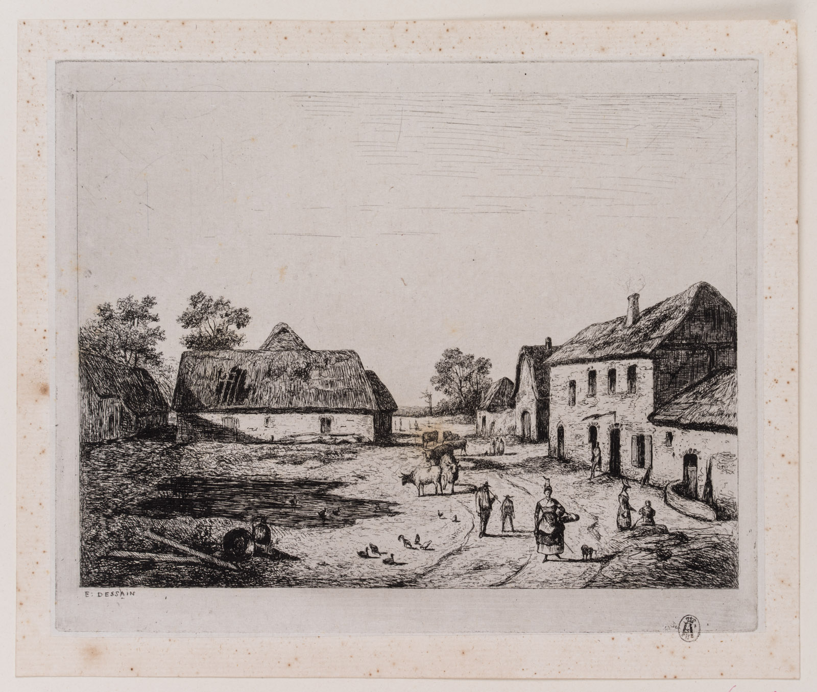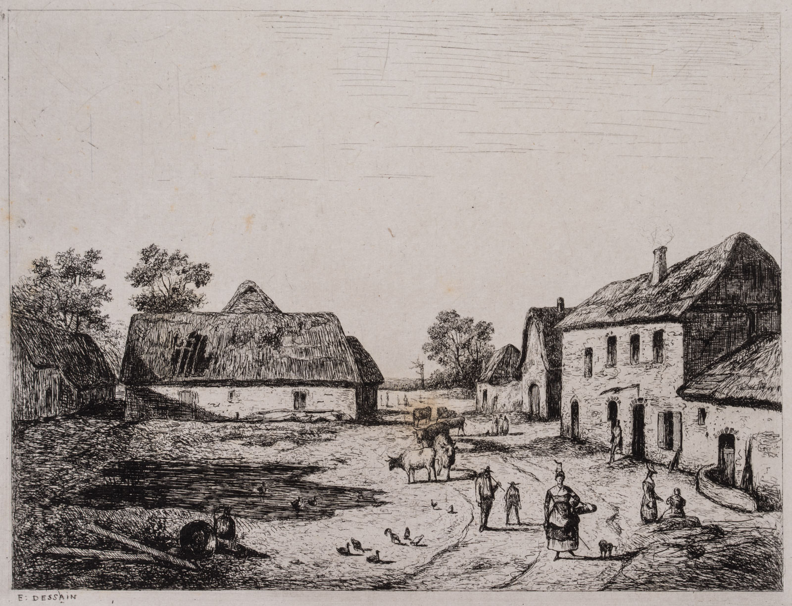 Emile François Dessain (1808 Valenciennes – 1882 ibid.), Farm with Animals, Genre Painting, 19th century, Etching