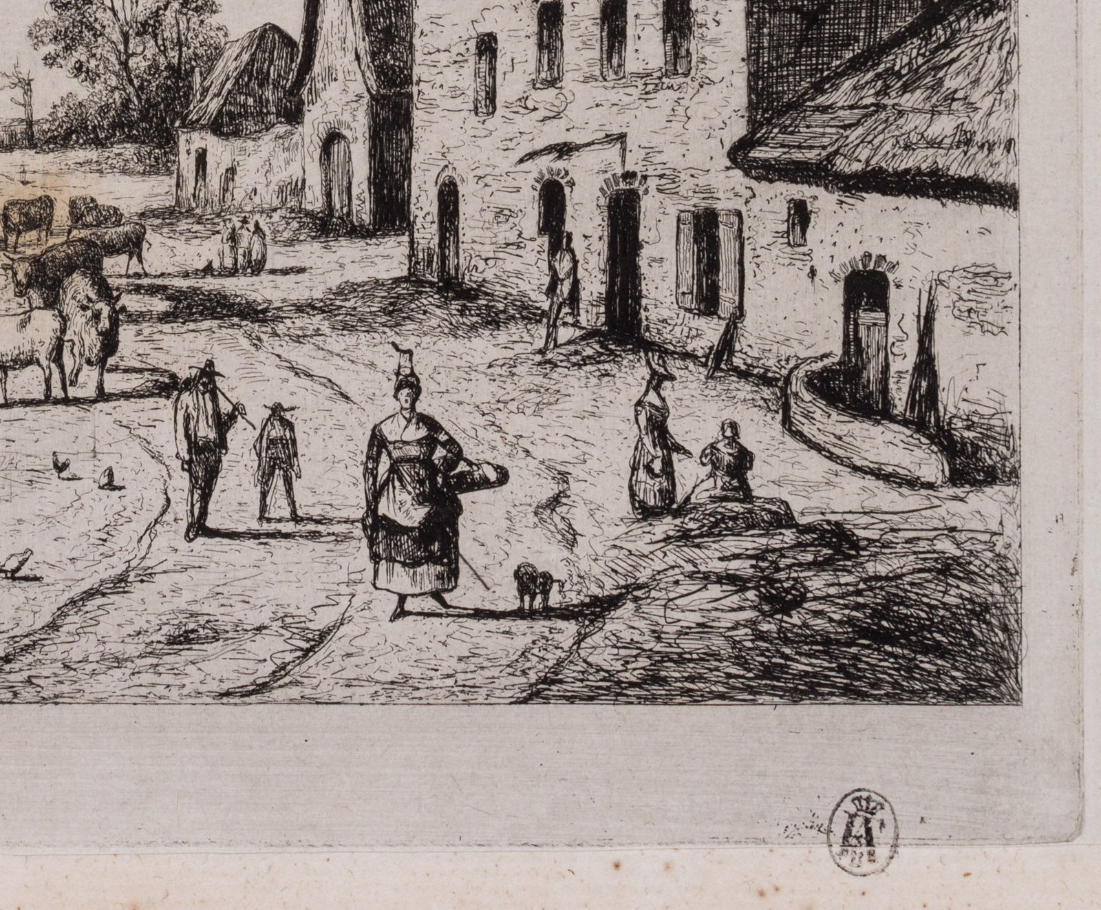 Emile François Dessain (1808 Valenciennes – 1882 ebd.), Bauernhof mit Tieren, Genrebild, 19. Jahrhundert, Radierung