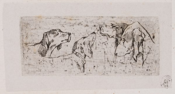 Emile François Dessain (1808 Valenciennes – 1882 ebd.), Hundestudie, Tierstudie mit Jagdhunden, 19. Jahrhundert, Radierung