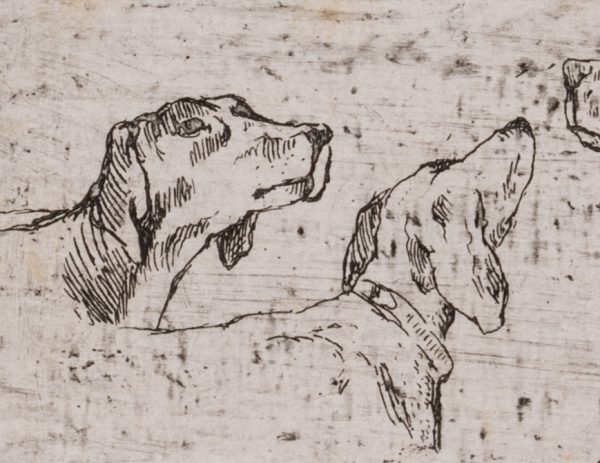 Emile François Dessain (1808 Valenciennes – 1882 ibid.), Dog study, animal study with hunting dogs, 19th century, Etching