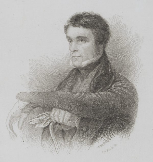 Edward A. Fowle (um 1847 – 1856 ebd.), Brustporträt eines Edelmannes im Dreiviertelprofil mit verschränkten Armen und Stock in der Hand, 19. Jahrhundert, Stahlstich
