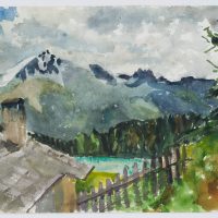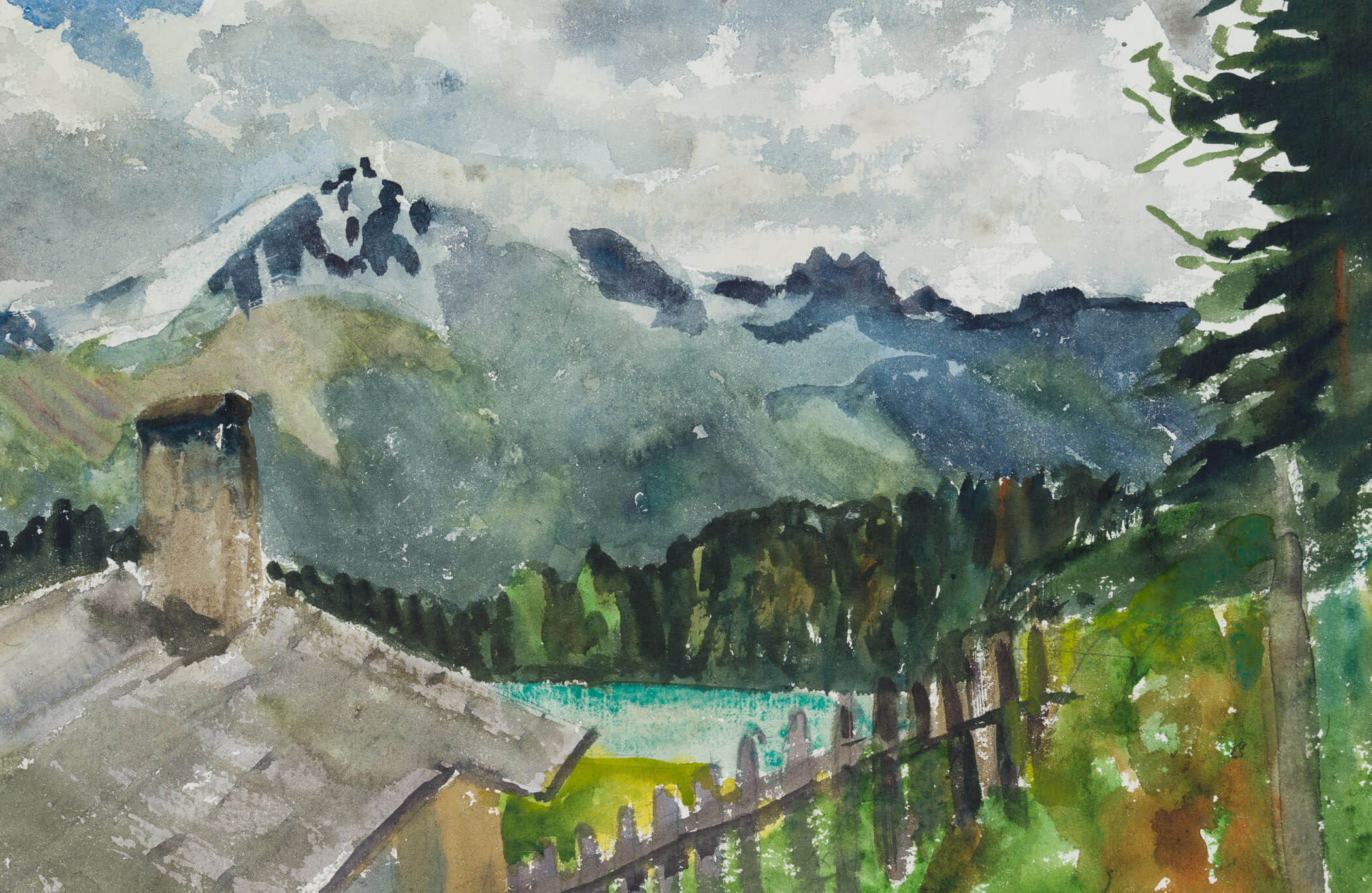 Eduard Fürstenau (1862 Marburg – 1938 Berlin), Blick von einer Almhütte in die Gebirgslandschaft, um 1920, Aquarell