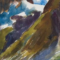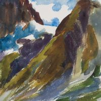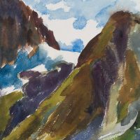 - Beschreibung: Raue Felsmassive dargestellt in groben Pinselstrichen