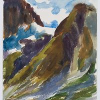 - Description: Rough rock massifs depicted in rough brushstrokes