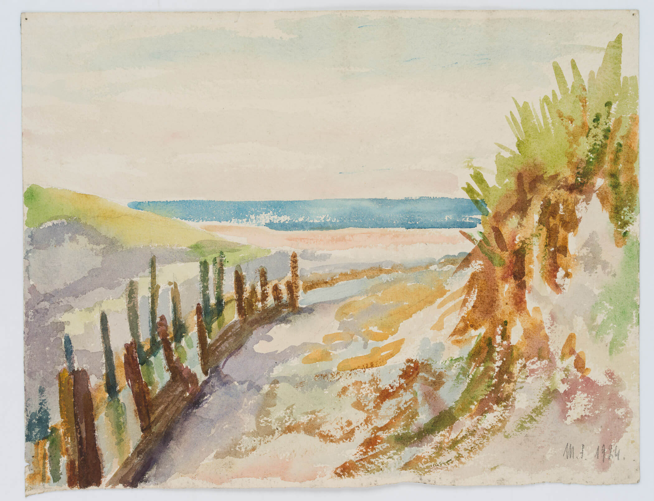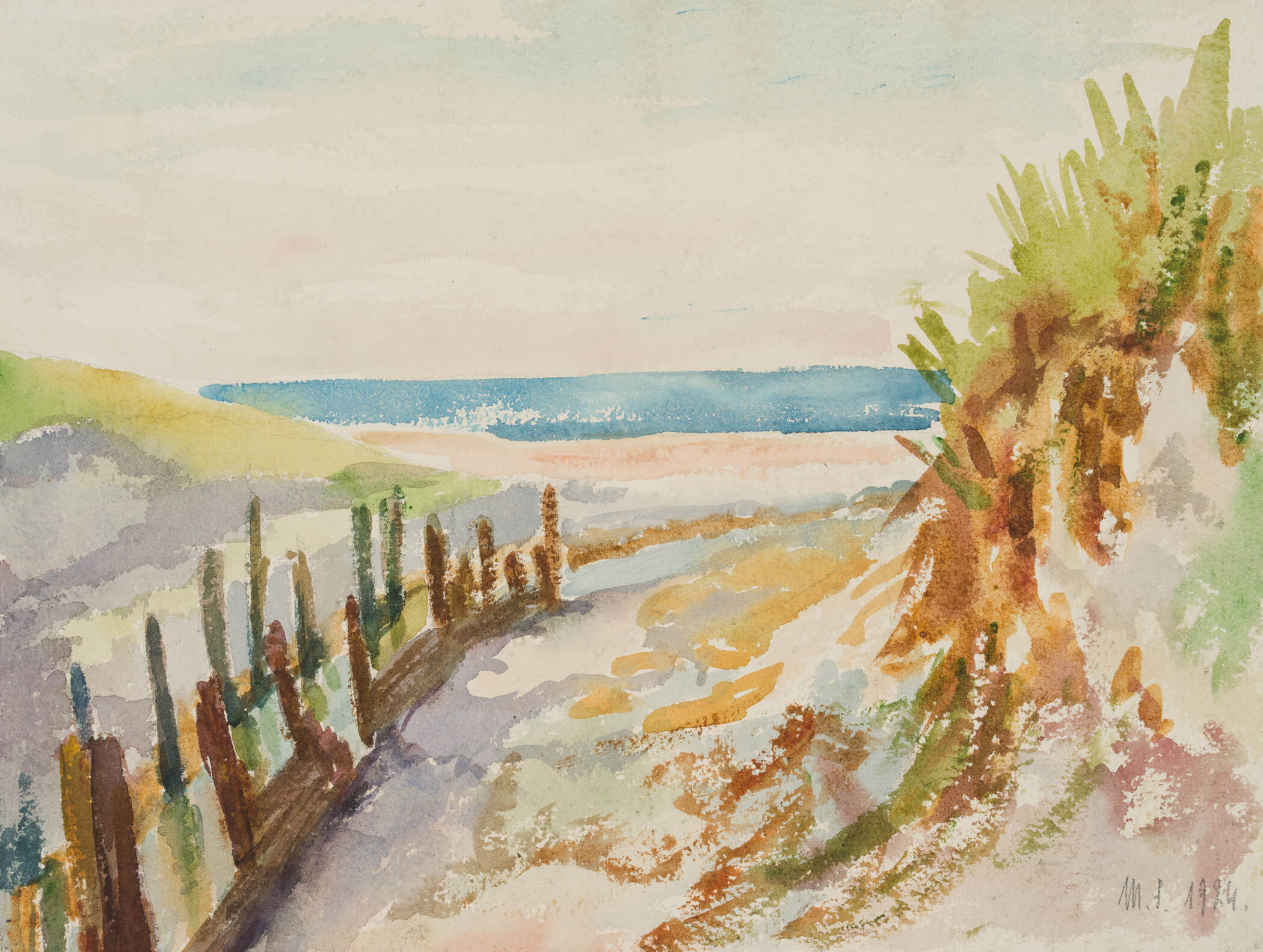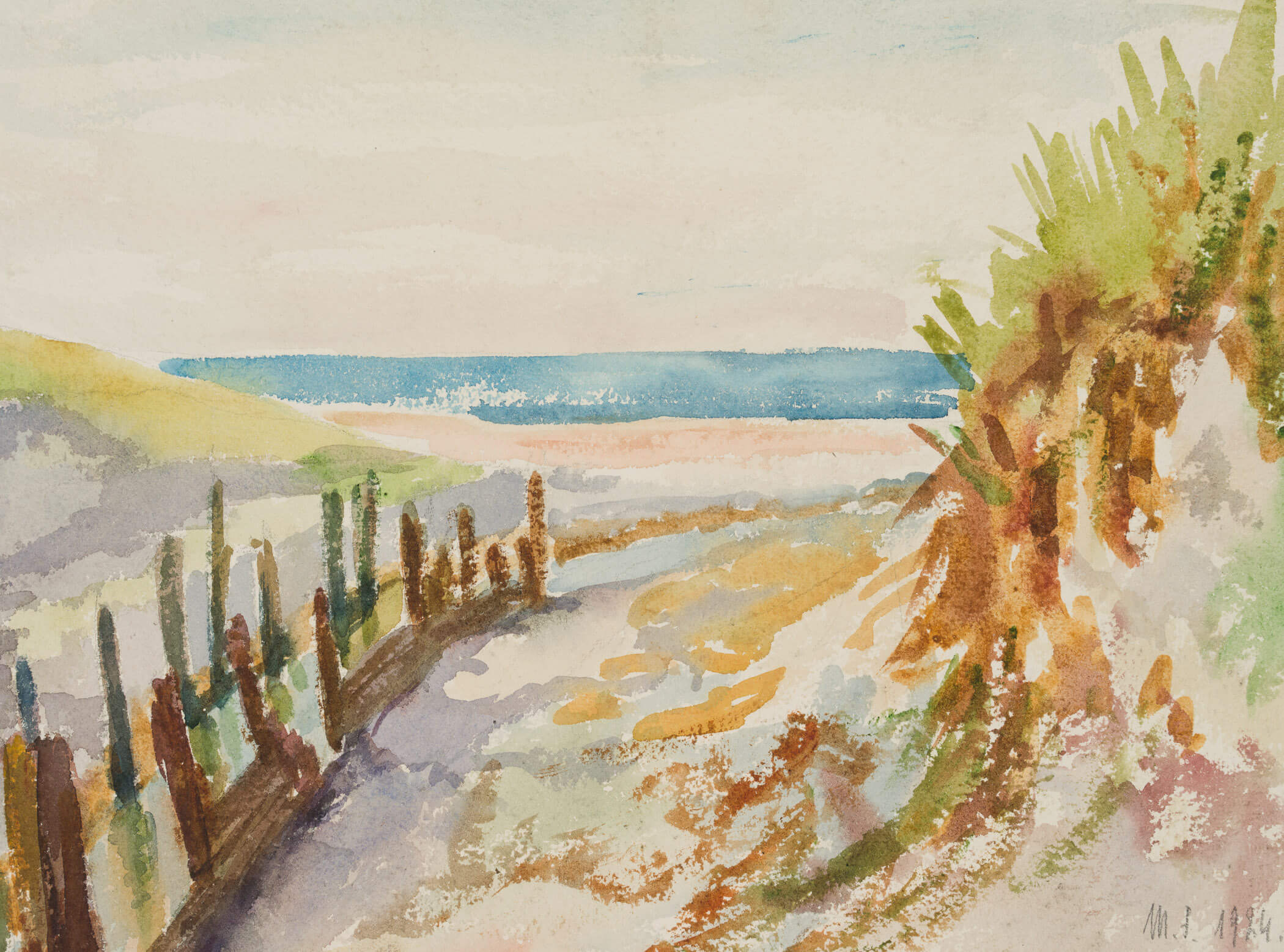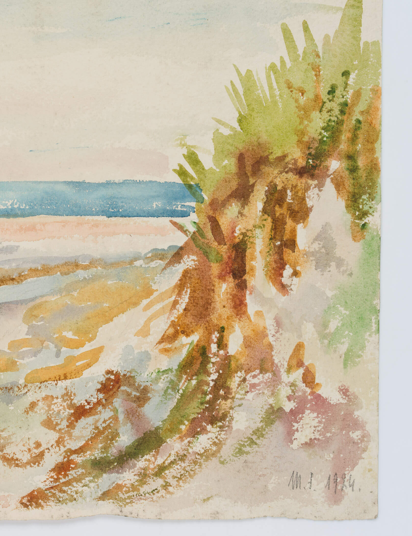Eduard Fürstenau (1862 Marburg – 1938 Berlin), An der Nordseeküste. Blick über pflanzenbewachsene Dünen auf das Meer, 1924, Aquarell