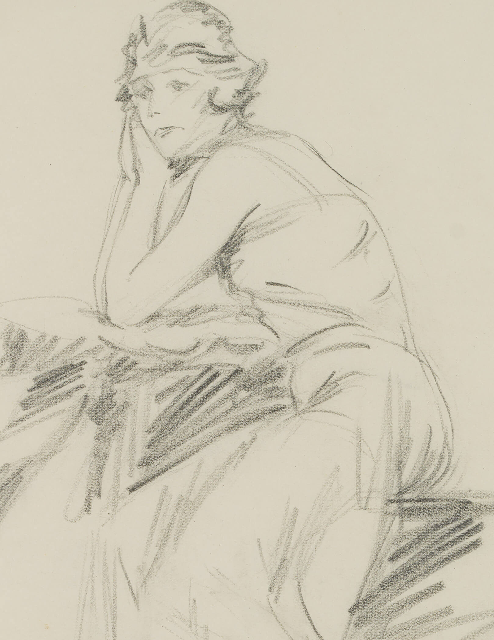 • Schlagworte: Haltungsstudie, Körperstudie, Skizze, Damenportrait, Frau, nachdenklich, Pagenschnitt, Porträt, Figürlich, Deutschland, Art Deco, 1900-1924