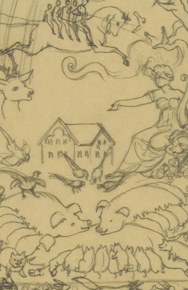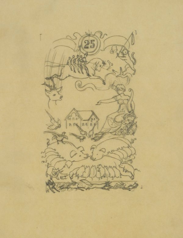 Eduard Fürstenau (1862 Marburg – 1938 Berlin), Kartenvorlage 25jähriges Jubiläum für einen jagd- und Bauernhof, um 1930, Bleistift