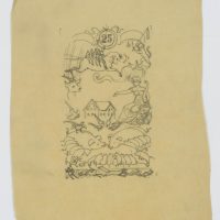 - Beschreibung: Dekorkarte. Mittig mit einem Gushof, um den die Nutztiere des Hofes und die Aktivitäten am Hof choreografisch versammelt wurden