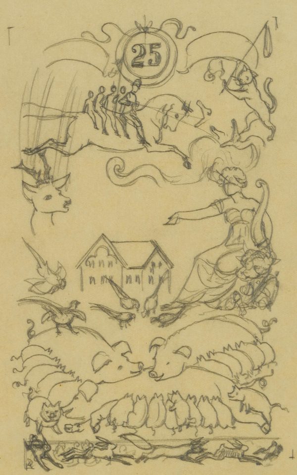 - Schlagworte: Dekorkarte, Jubiläumskarte, 25-jähriges Jubiläum, Gutshof, Bauernhof, Schweine, Hasen, Vögel, Reiter, Reh, Karte, Kartenvorlage, Entwurf, Mode, Deutschland, Comic, 1925-1949