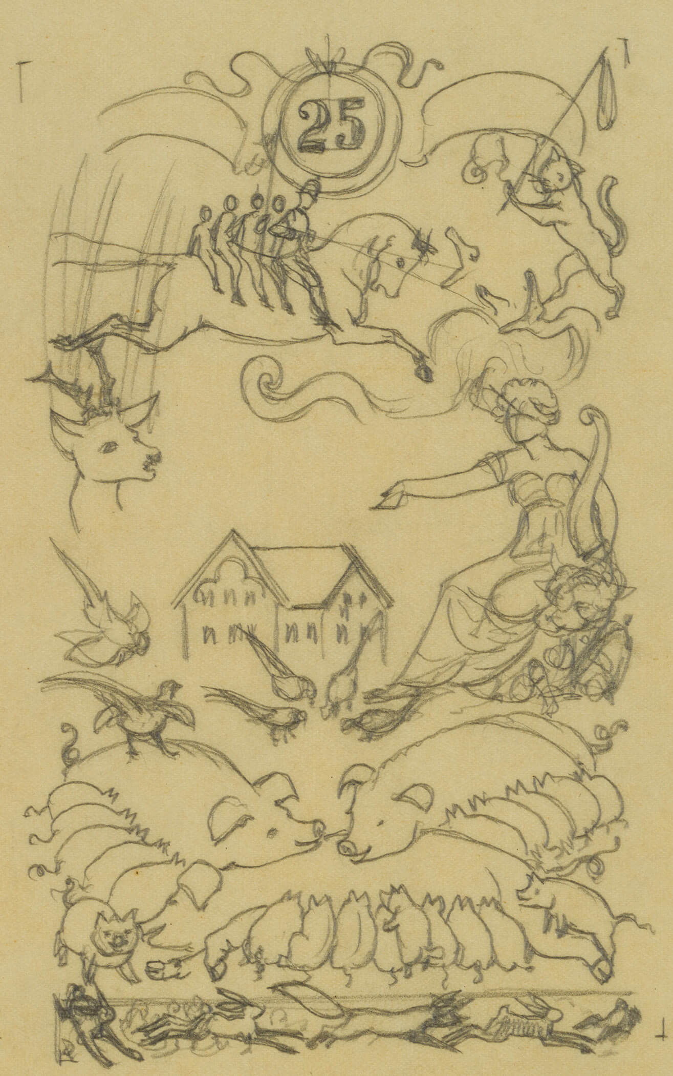 - Keywords: Decorative card, anniversary card, 25th anniversary, estate, farm, pigs, rabbits, birds, rider, deer, card, card template, design, 20th century, Comic, Fashion, Germany,