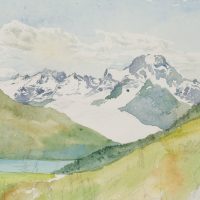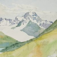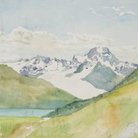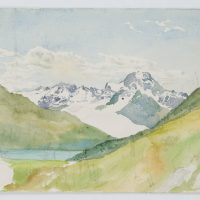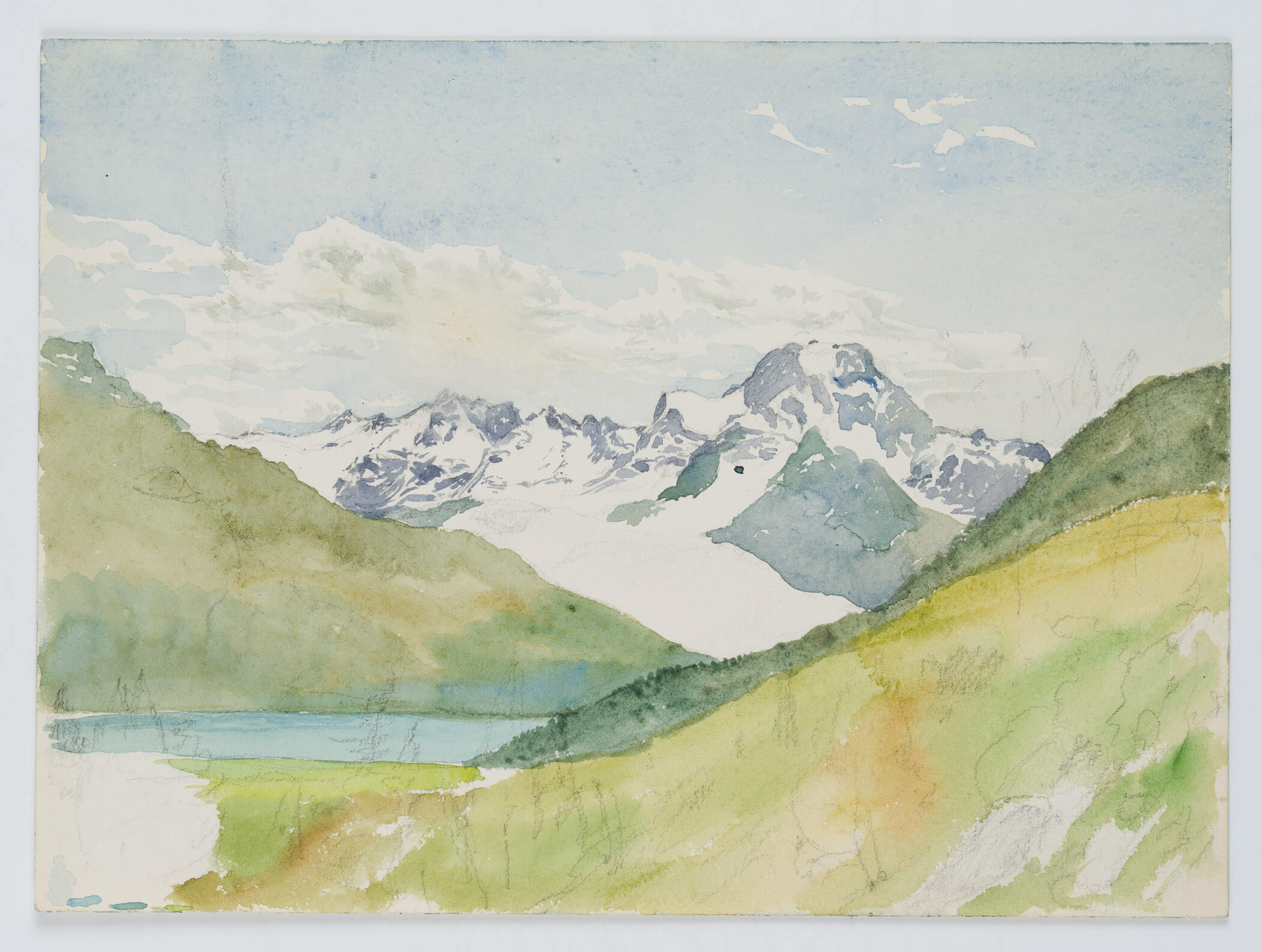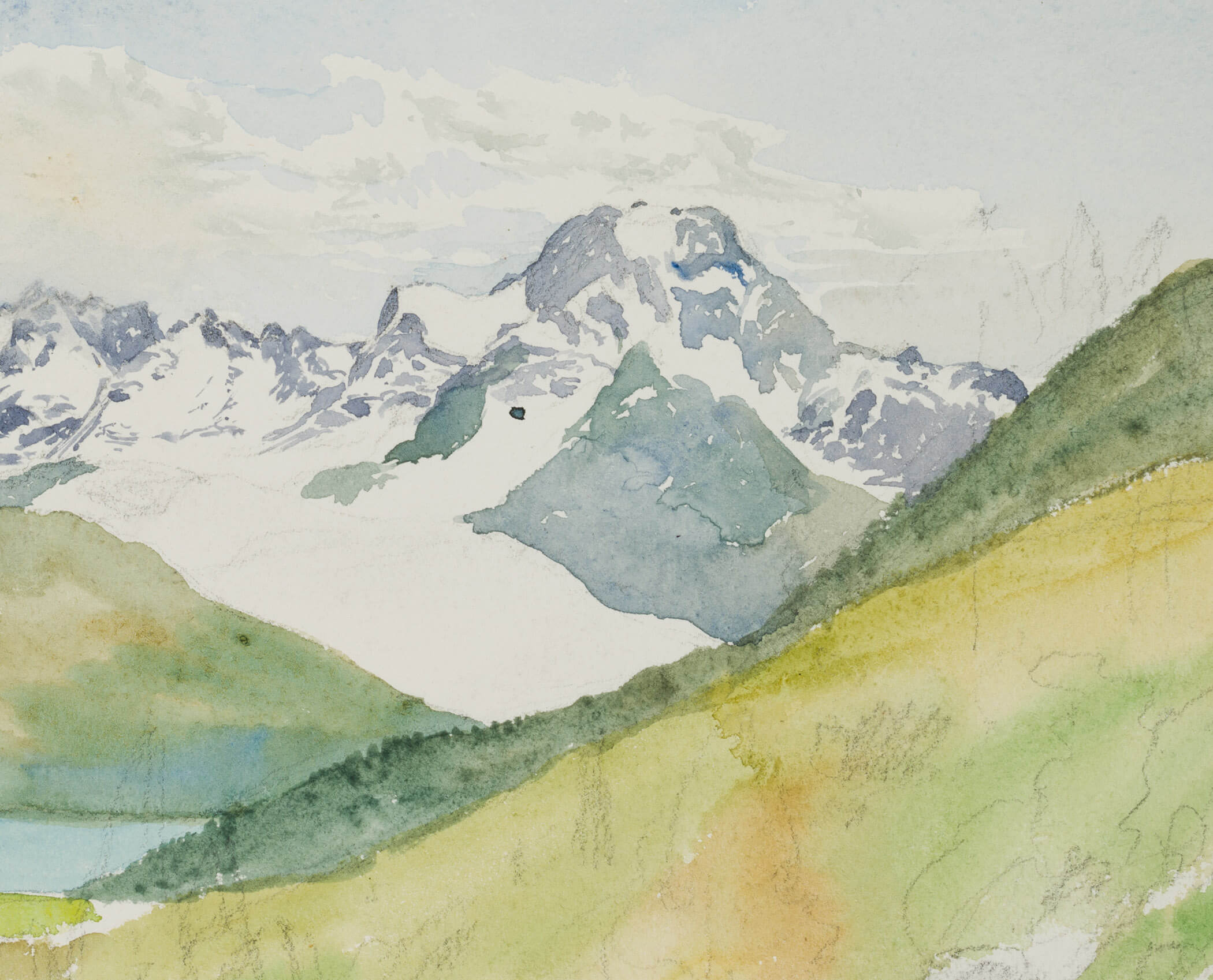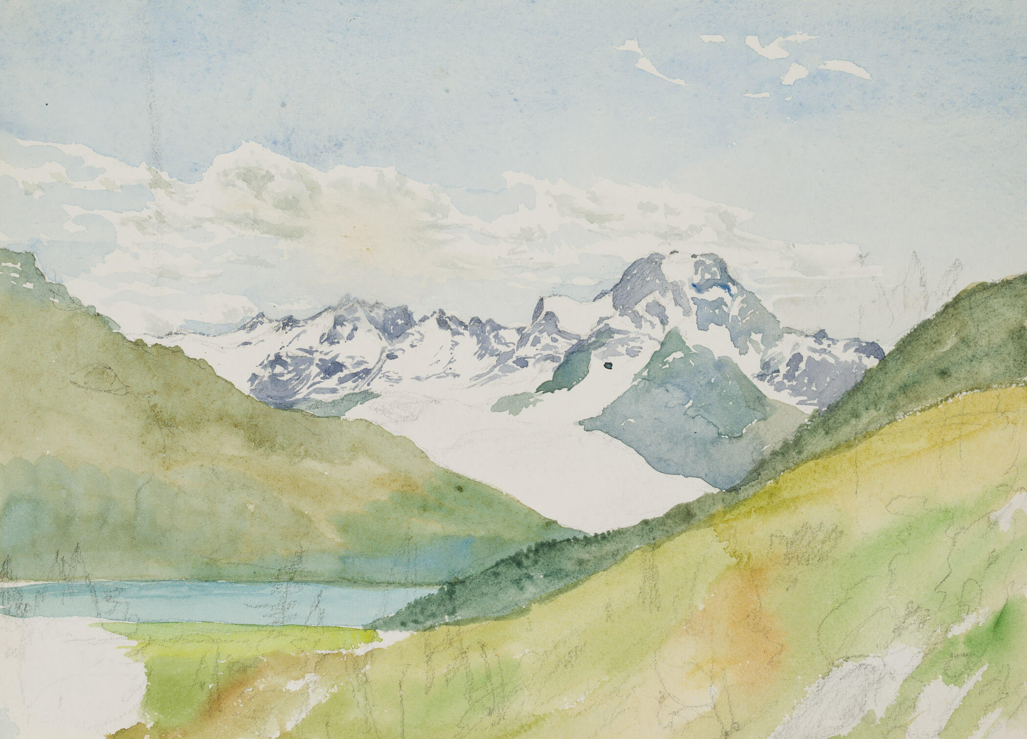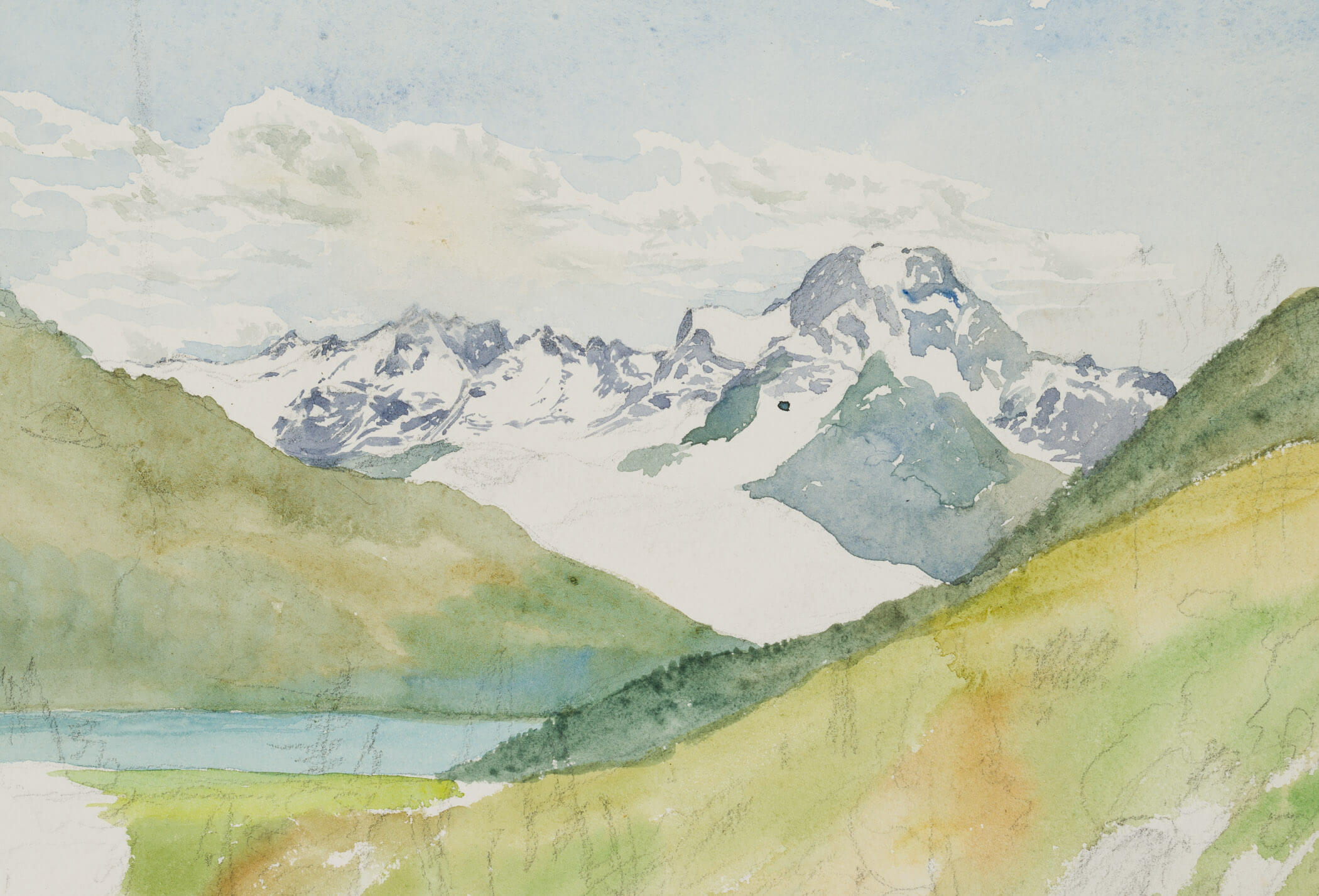 - Description: View over green meadows, soft hills and blue alpine lake to snow-covered mountains. Sketch with unfinished areas. Sheet comes from the artist’s estate. Please note our further offers