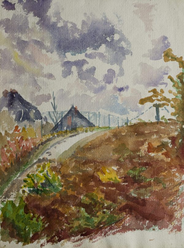 - Description: Autumnal nature piece with path leading through a hilly landscape. In the background are mountain houses, recognisable by their deep roofs.