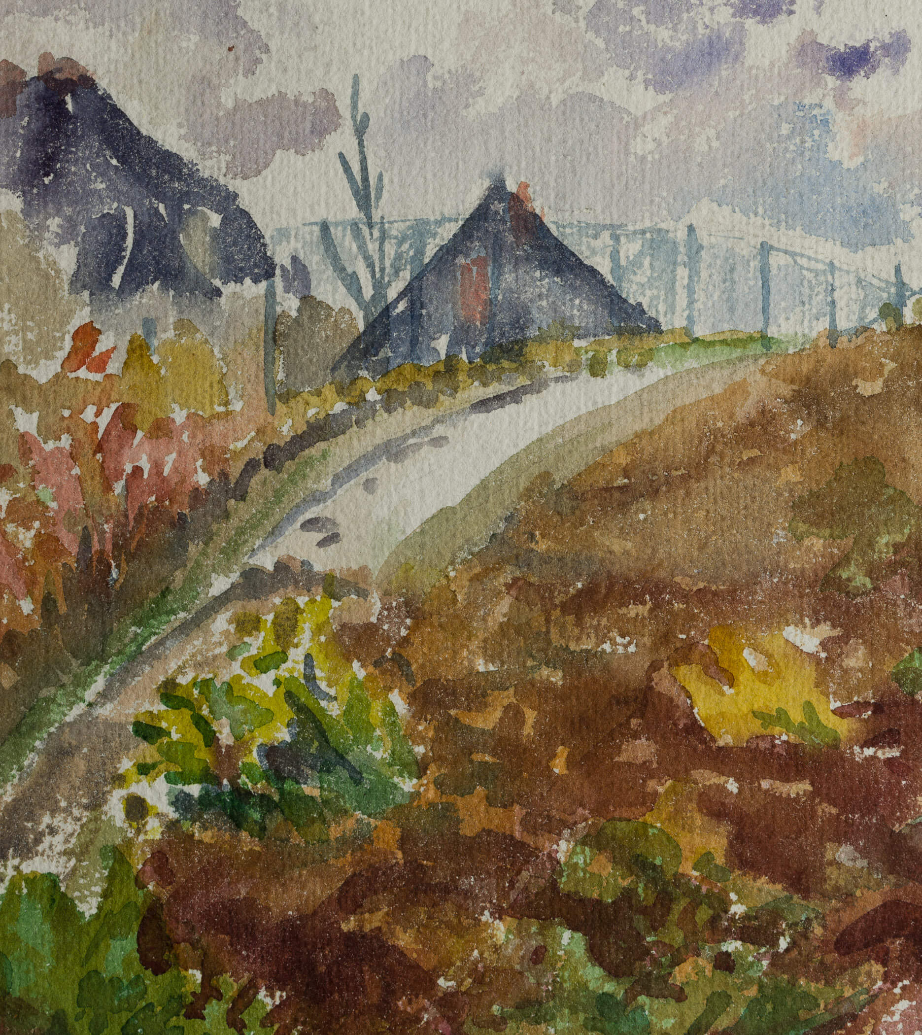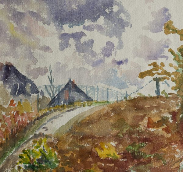 - Beschreibung: Herbstliches Naturstück mit Weg, der durch eine hügelige Landschaft führt. Im Hintergrund stehen Gebirgshäuser, erkennbar an ihren tiefen Dächern.