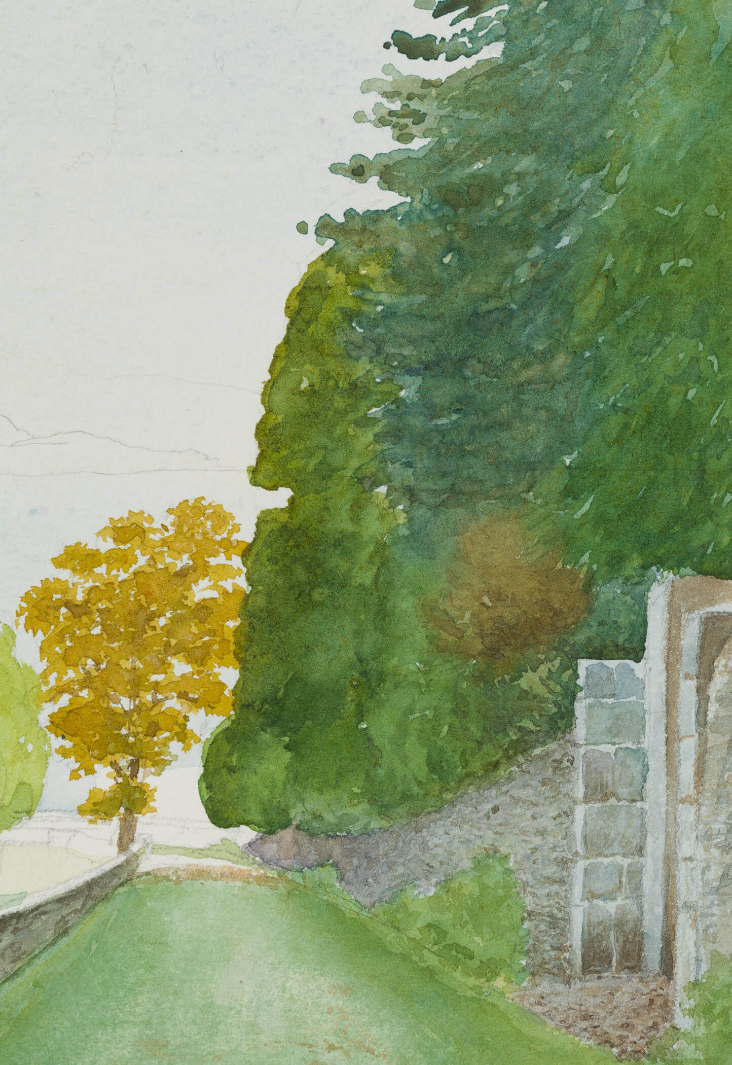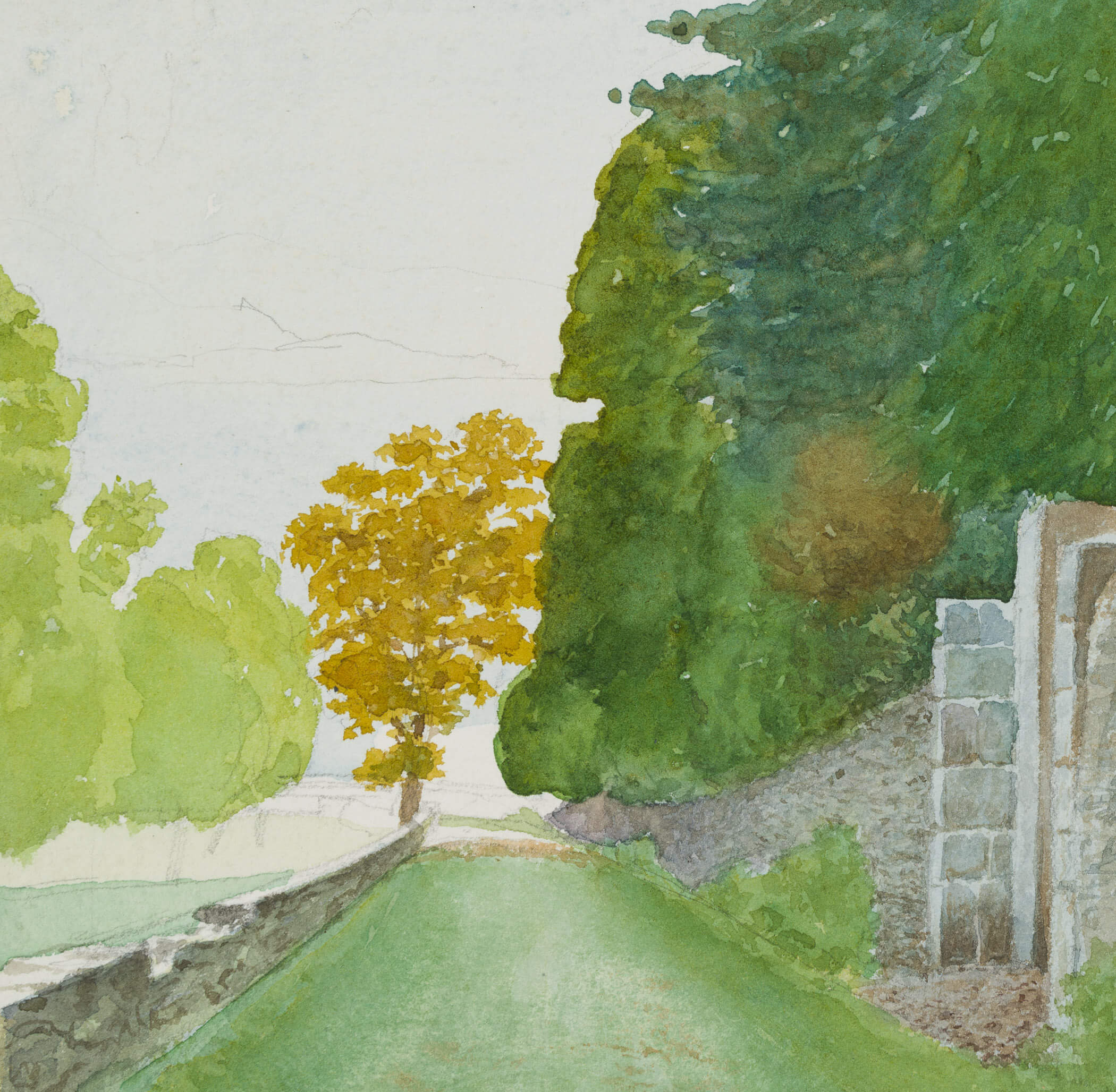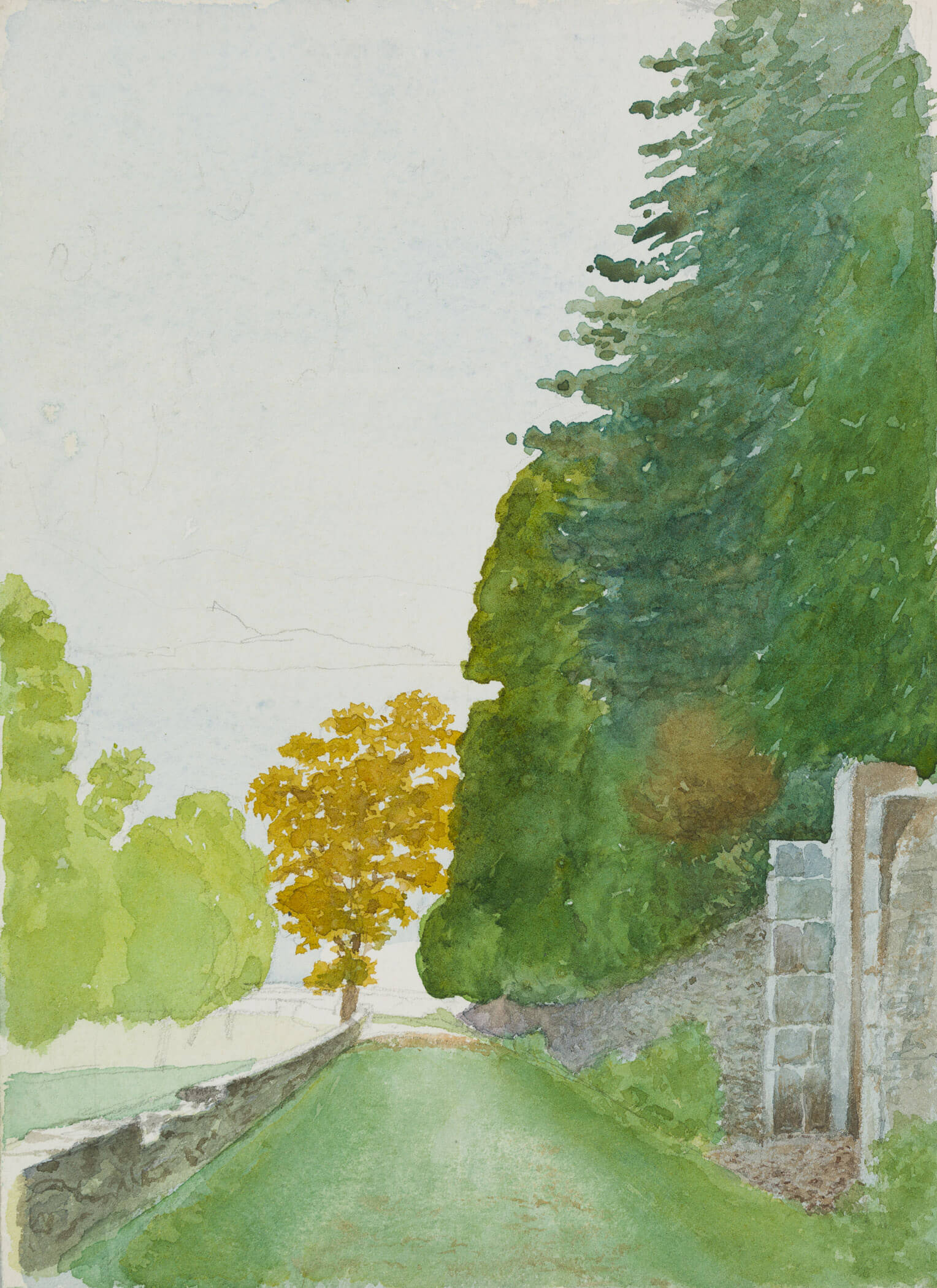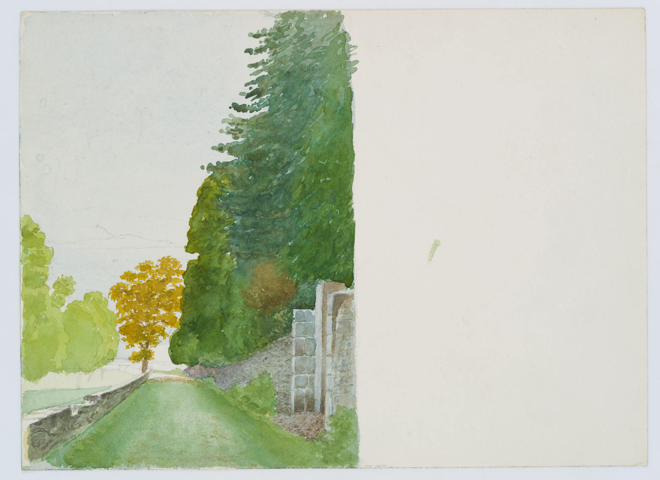 - Beschreibung: Parkanalage. Grüner Rasenweg entlang einer Mauer, über die hohe Tannen ragen. Aquarellskizze nur über die linke Seite des Blattes.