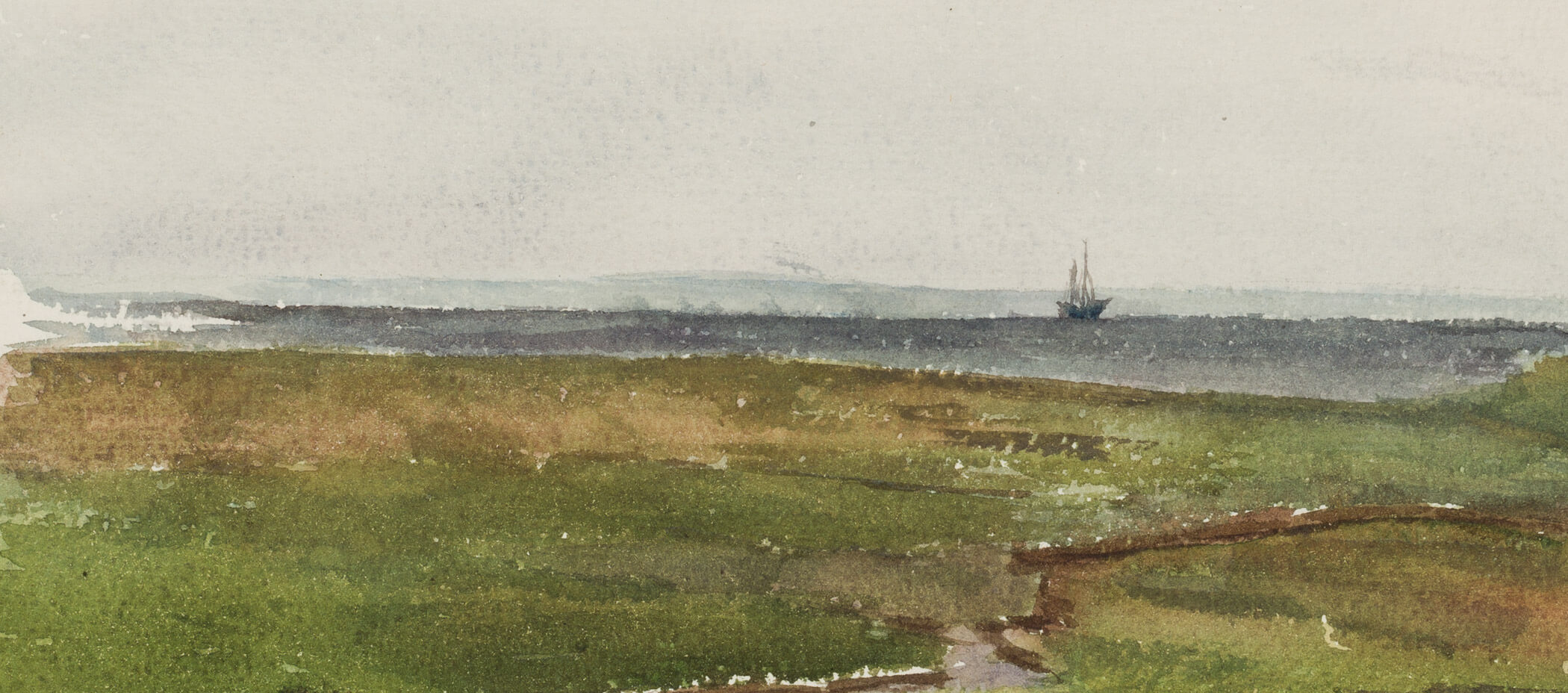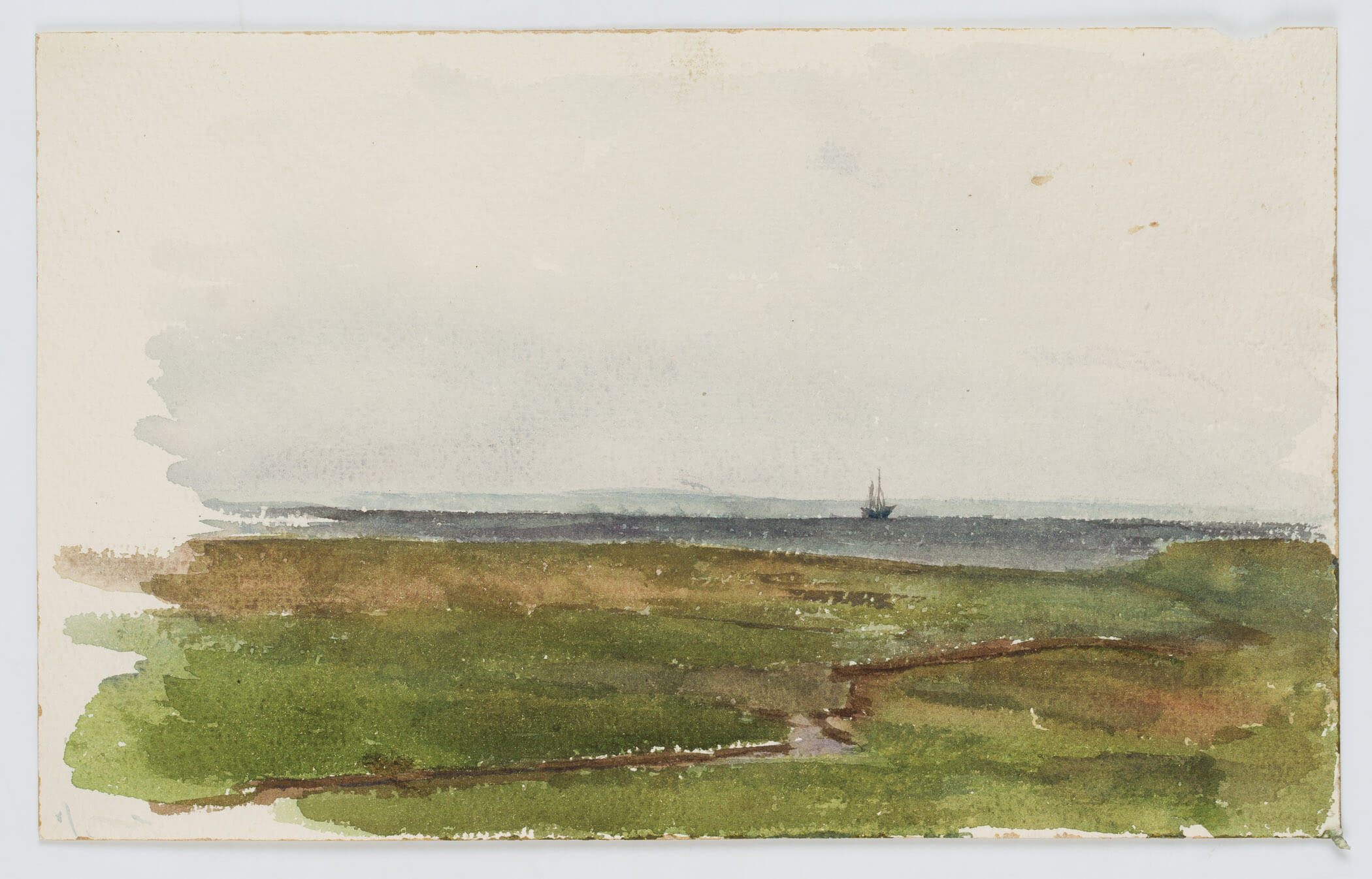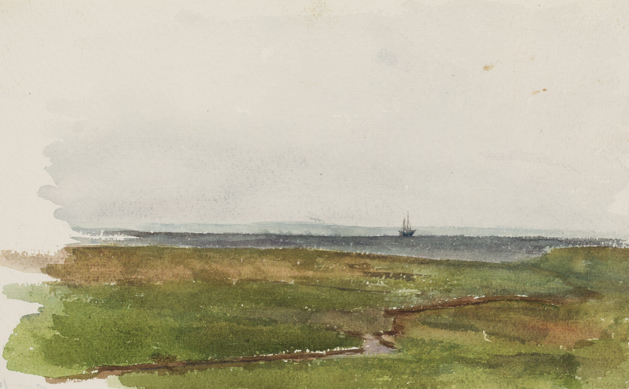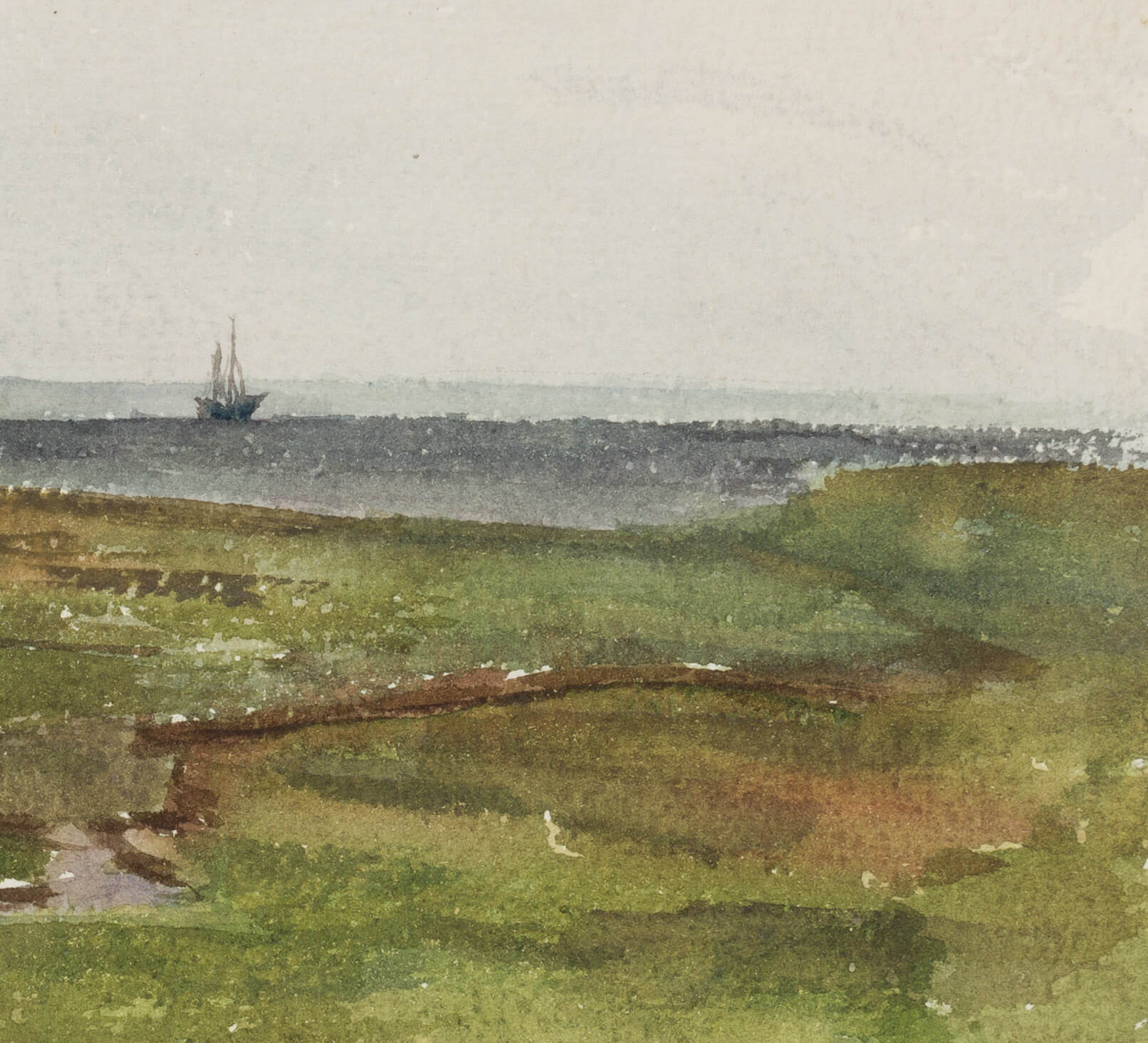 Eduard Fürstenau (1862 Marburg – 1938 Berlin), Weite flache Küstenlandschaft mit Segelboot, um 1920, Aquarell